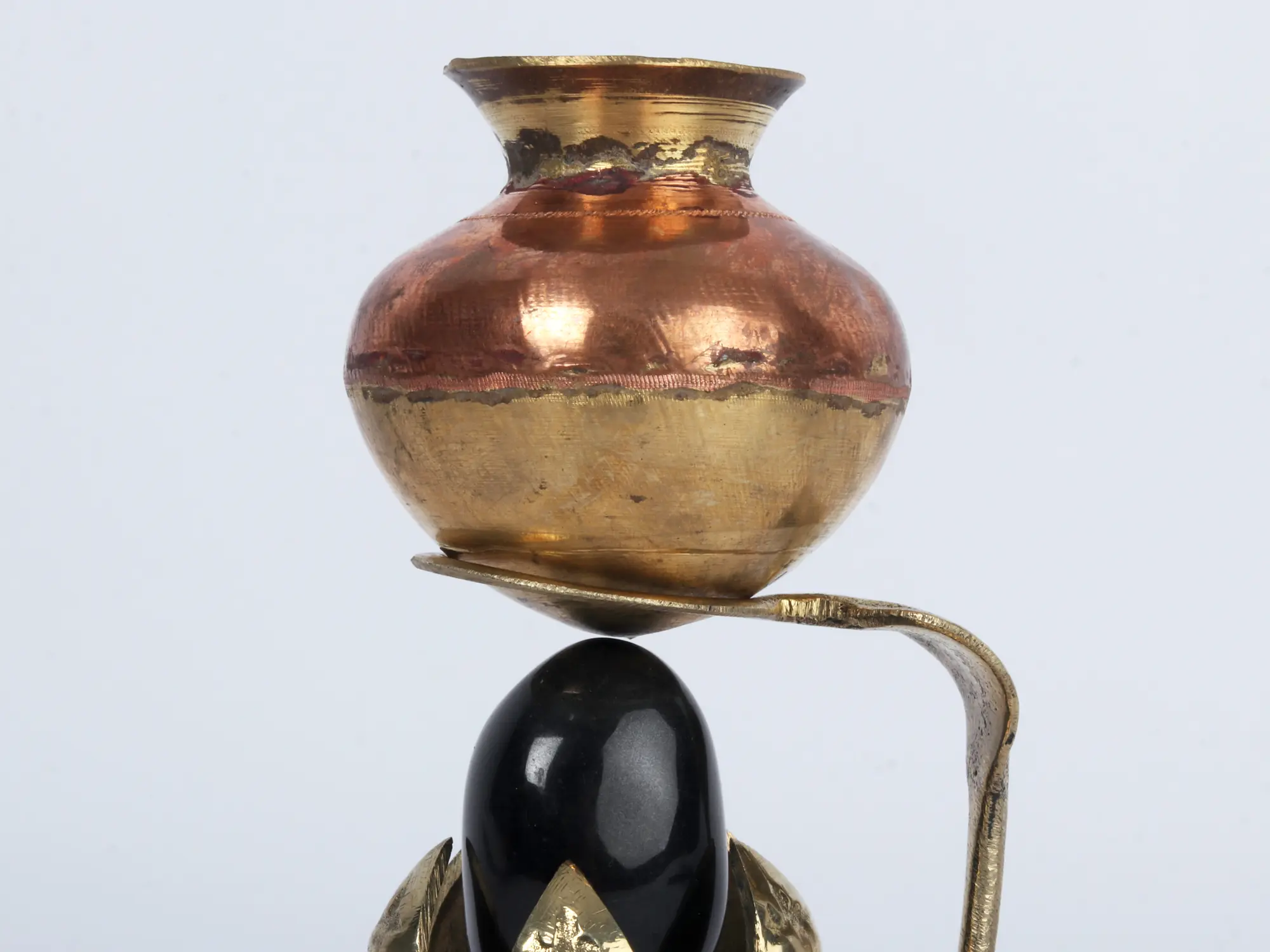 This is further added by a small structure resembling a Purna Kalash, with a base wheel that can be rotated easily. The mouth of the Kalash is filled with brass mango leaves, for they denote fertility and plenty.