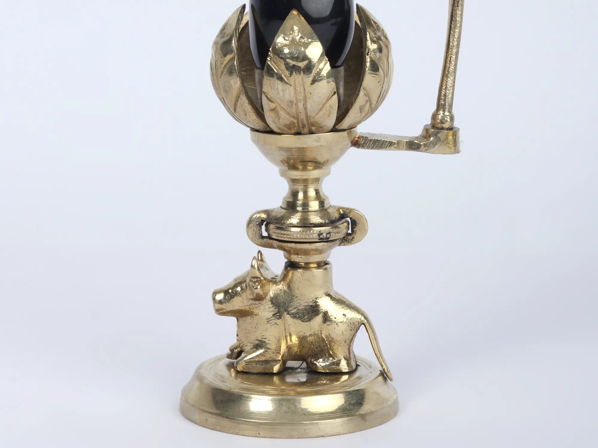 The Brass Shiva Linga Abhisheka Set is an exquisite creation with many delicate parts. It houses a stone Shiva Lingam, the sacred symbol of Lord Shiva. The statue has a disc-shaped pedestal over which sits a Nandi statuette that signifies devotion.