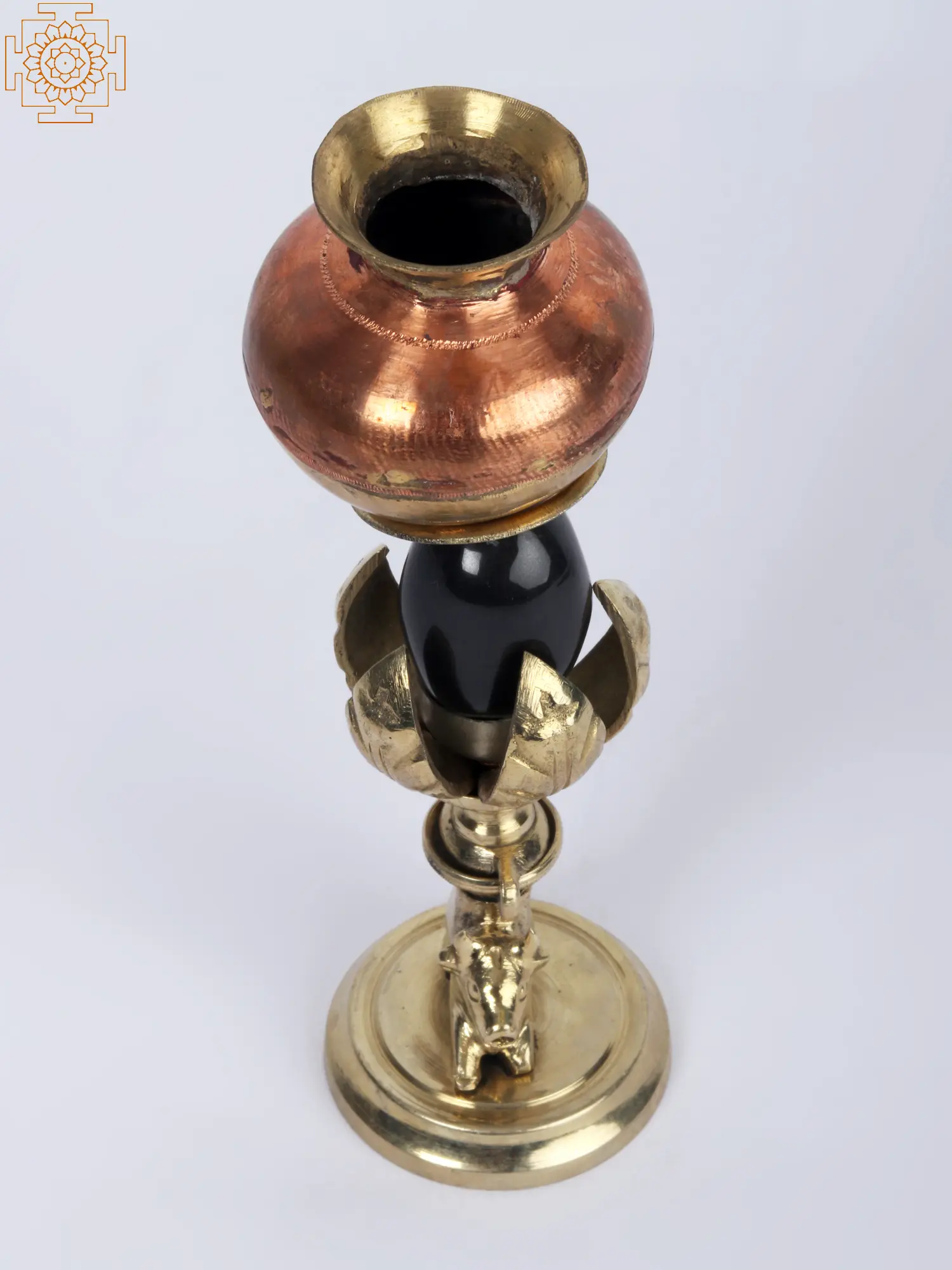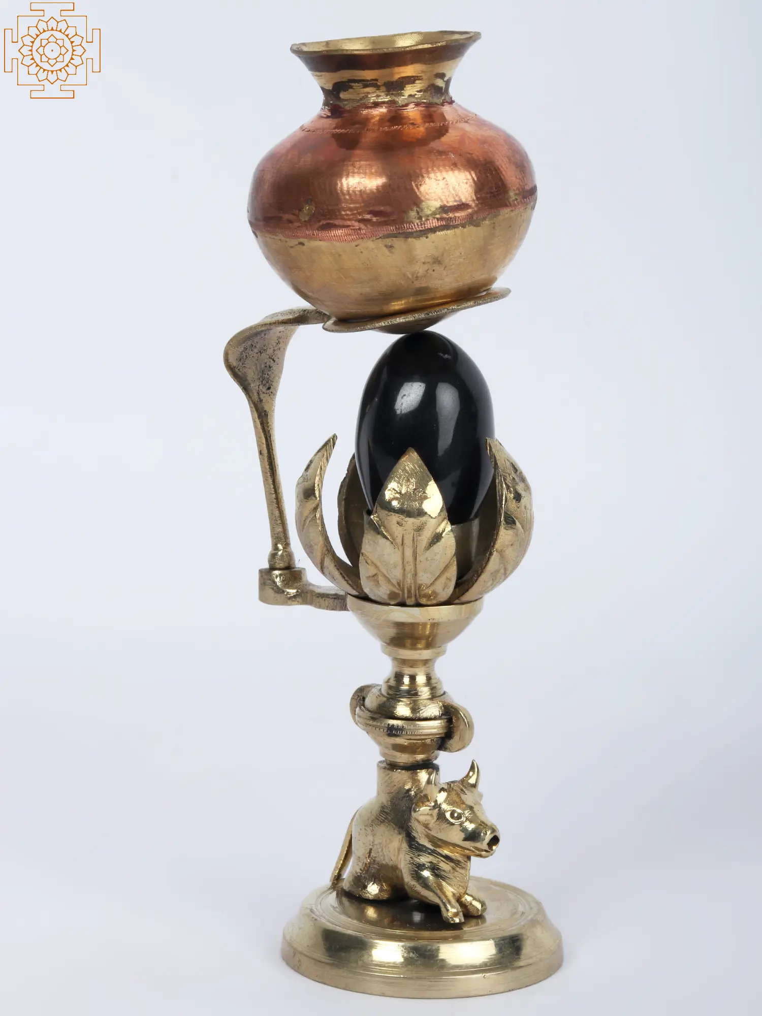 The serpent-shaped shade surrounds the Shiva Lingam, representing security. The Lingam emerges from the serpent’s mouth, the holder's base carrying a copper, Kalash.