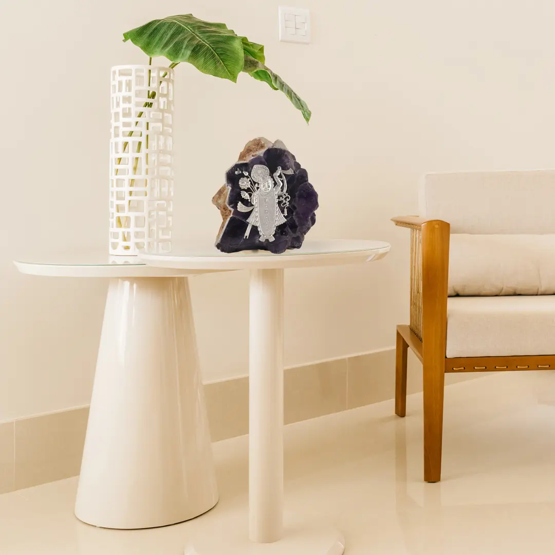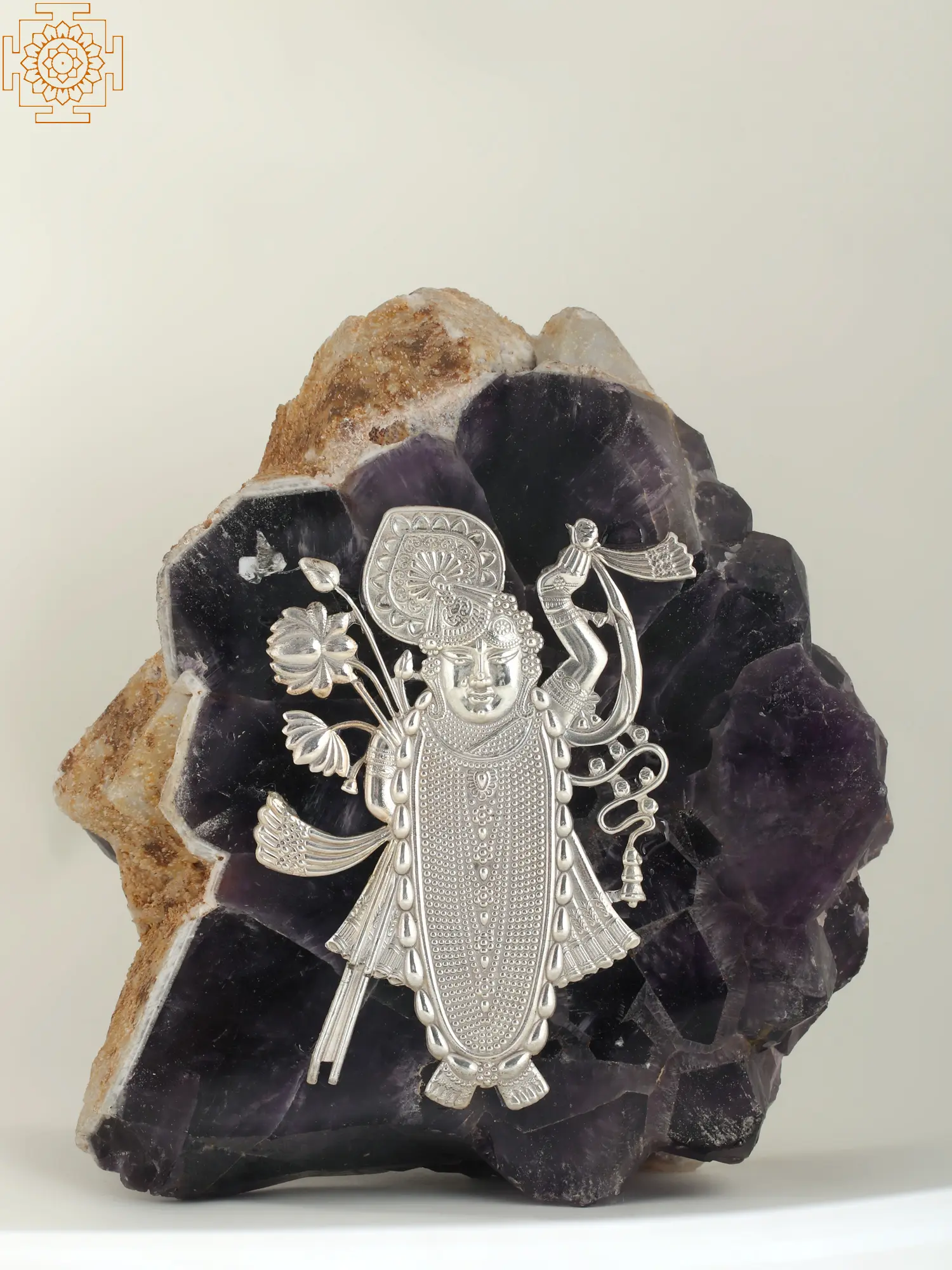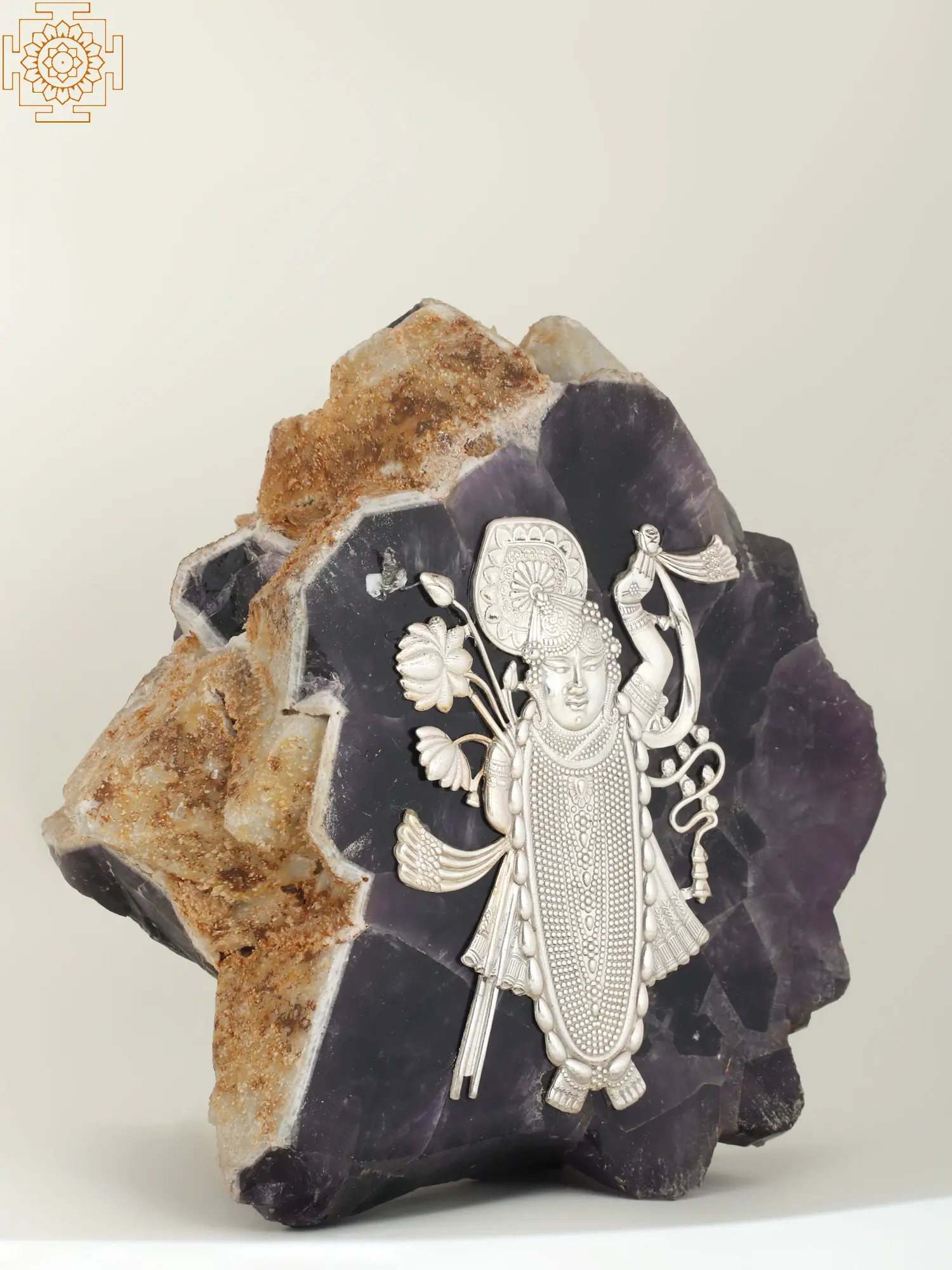 Shrinath Ji, an incarnation of Lord Krishna, is a seven-year-old young child who lifted the “Goverdhan Parvat” with the little finger of his left hand, to protect the people of “Vrindavan” from the wrath of Indra. Shrinath Ji radiates an alluring charm, attracting devotees seeking spiritual bliss and divine love. Seeking His blessings is believed to bring prosperity and remove obstacles from One’s Path. Cast in .999 silver, this divine figure radiates purity and spirituality. This fusion of precious “Silver” and “Amethyst Rock” is a tribute to craftsmanship and devotion.