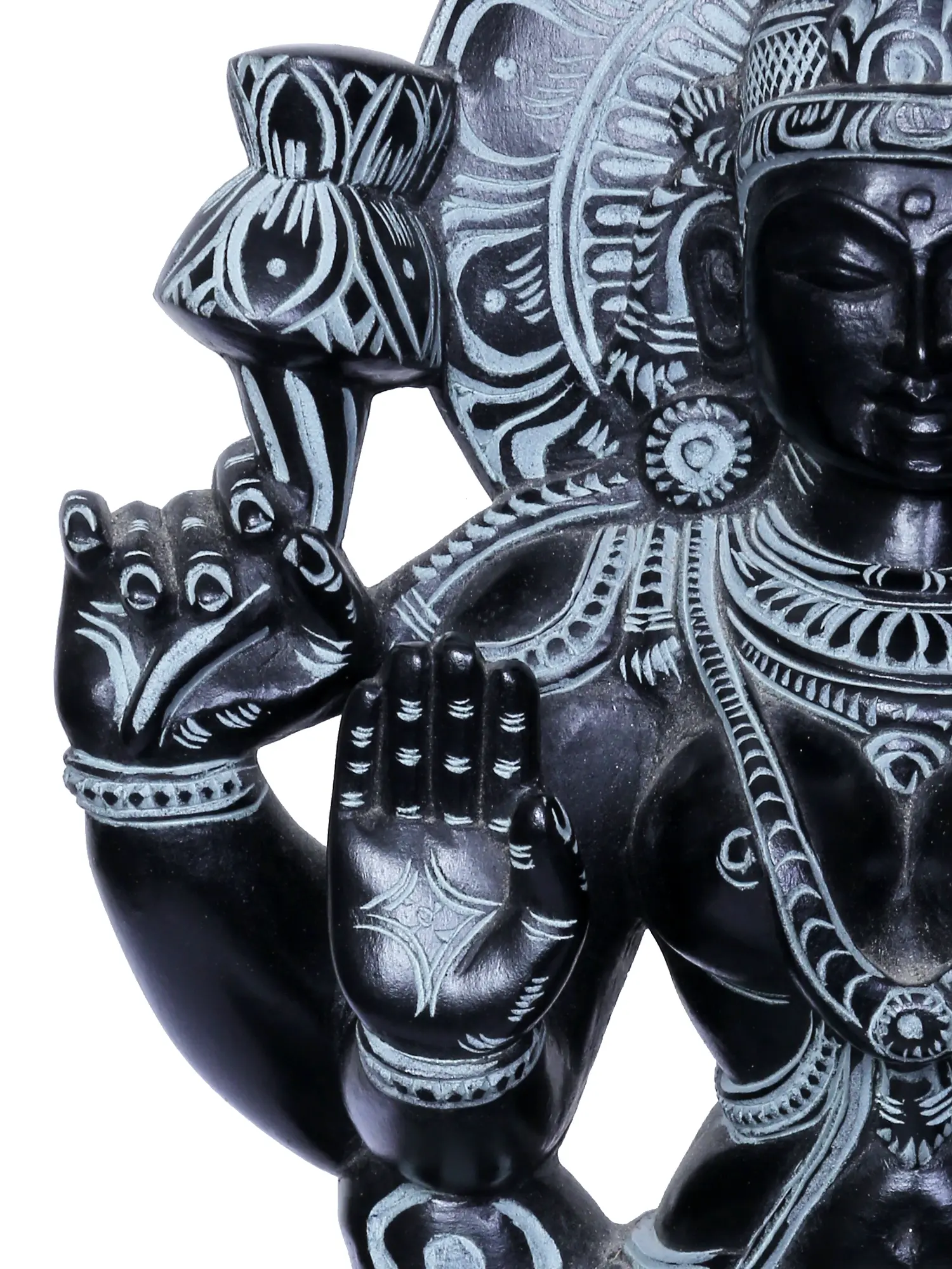 Devi Lakshmi is revered throughout Hindu tradition as the consort of Lord Vishnu and the giver of prosperity. She is often depicted seated on a lotus flower, a symbol of purity and spiritual awakening, and adorned with golden coins, signifying wealth and abundance. In this sculpture, her four hands represent different aspects of her blessings: the upper hands often hold lotuses, symbolizing purity and beauty, while the lower right hand is raised in the Abhaya Mudra, offering protection and dispelling fear, and the lower left hand is often shown showering wealth or holding a pot of gold. Her presence is believed to invite good fortune, success, and a harmonious flow of material and spiritual riches into the lives of her devotees. Placing this statue in your puja room, living space, or office can serve as a constant reminder of her divine grace and an invocation for blessings of prosperity and well-being.