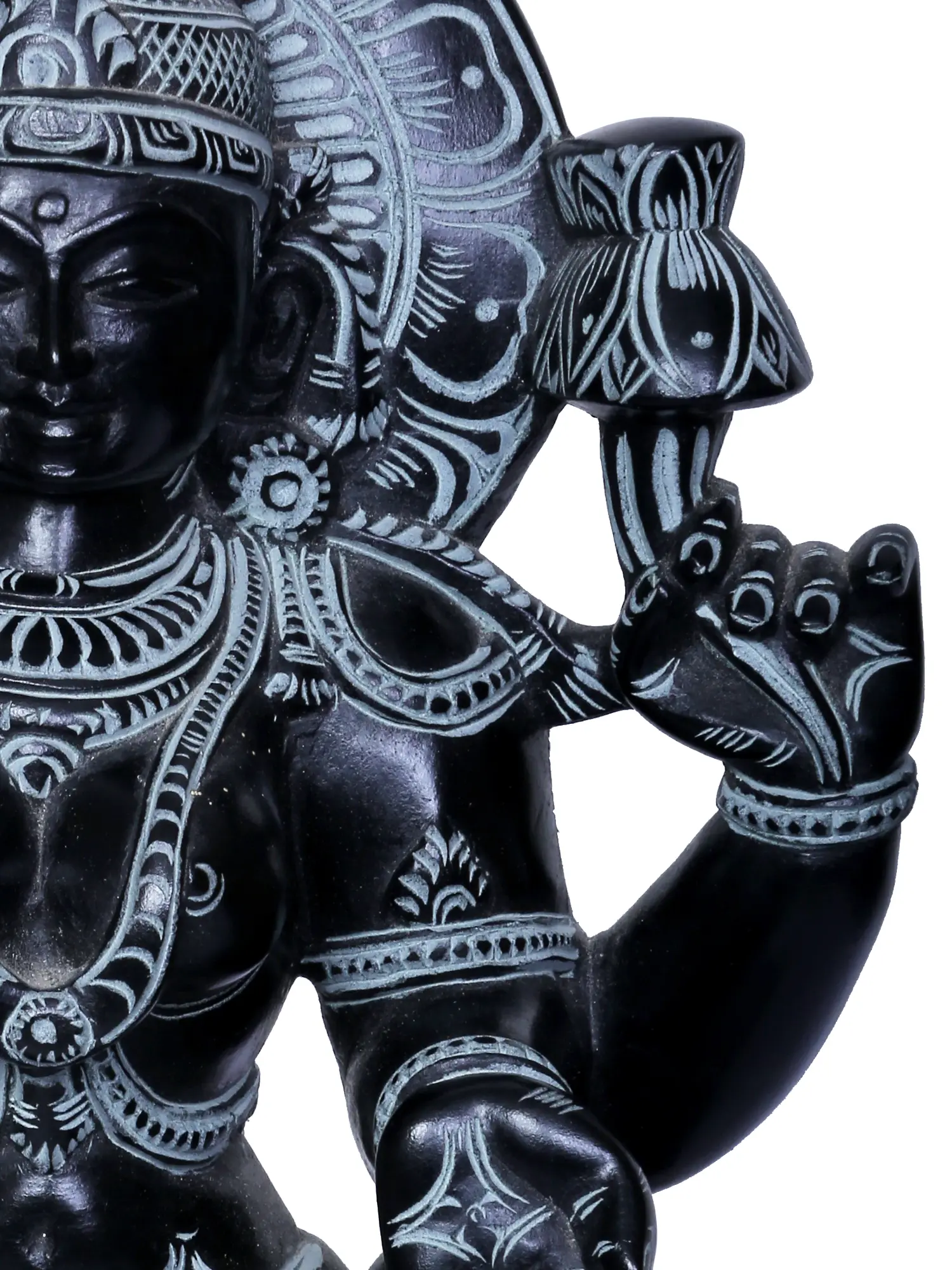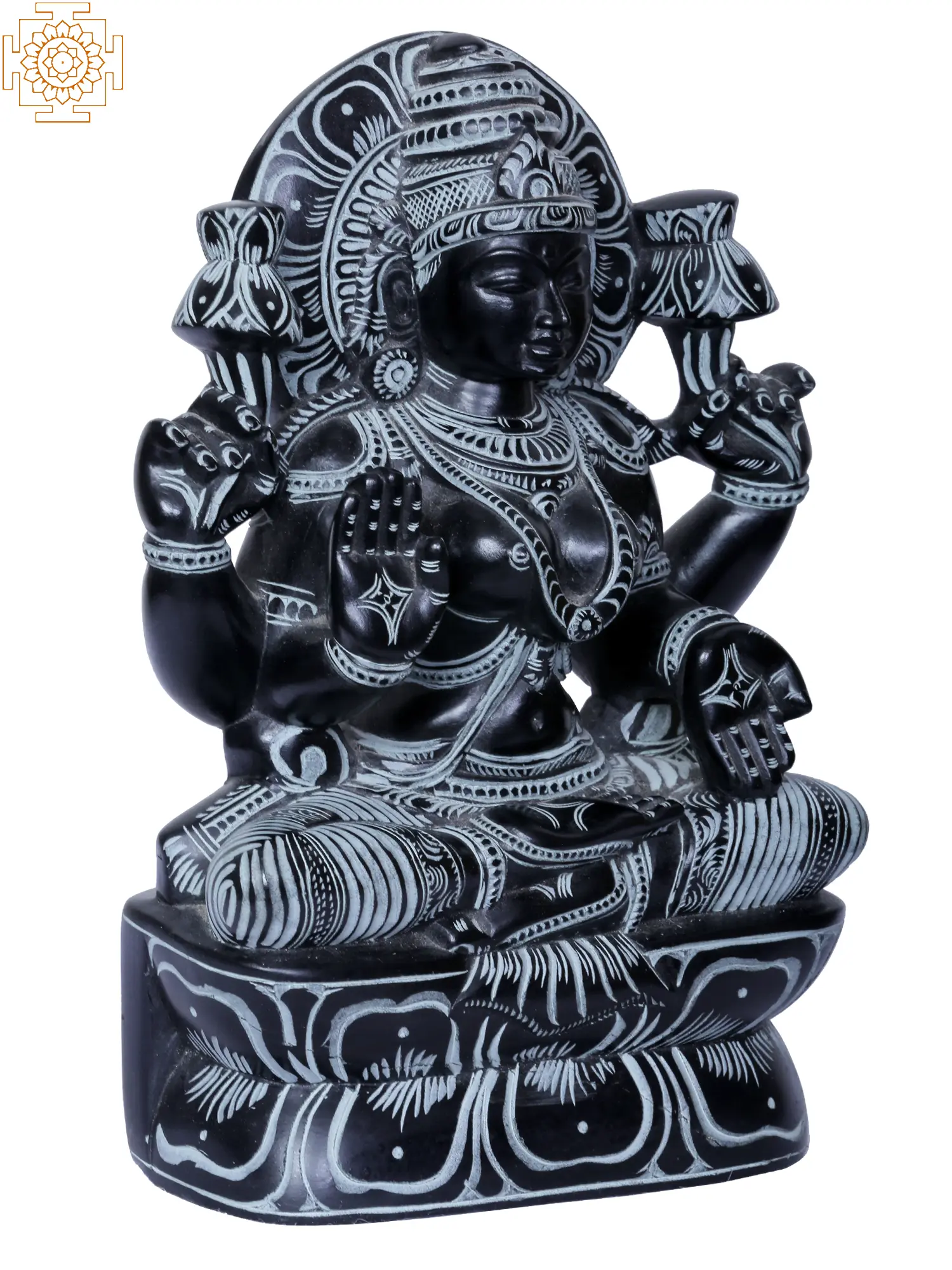 Invite the benevolent presence of Devi Lakshmi into your home with this exquisite stone sculpture. Crafted with remarkable skill in the renowned artisan hub of Mahabalipuram, South India, this piece captures the divine essence of the goddess of wealth, fortune, and prosperity. The deep, lustrous stone serves as a perfect canvas for the intricate carvings, depicting Devi Lakshmi in her seated posture, a symbol of stability and abundance. Her serene expression and multi-armed form are iconic representations of her multifaceted powers, bestowing blessings of material and spiritual well-being. ––––––––––––––––––––