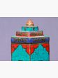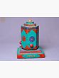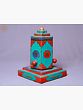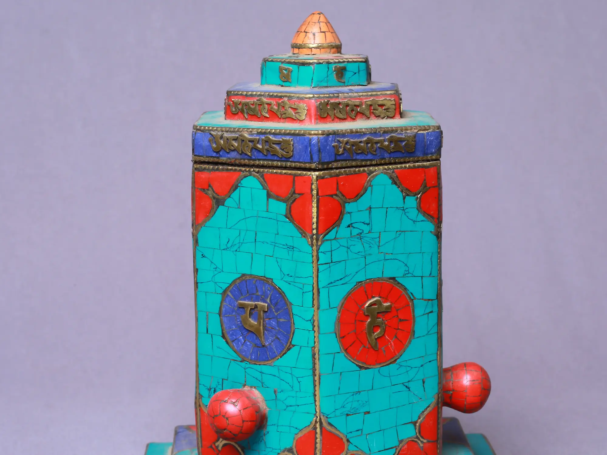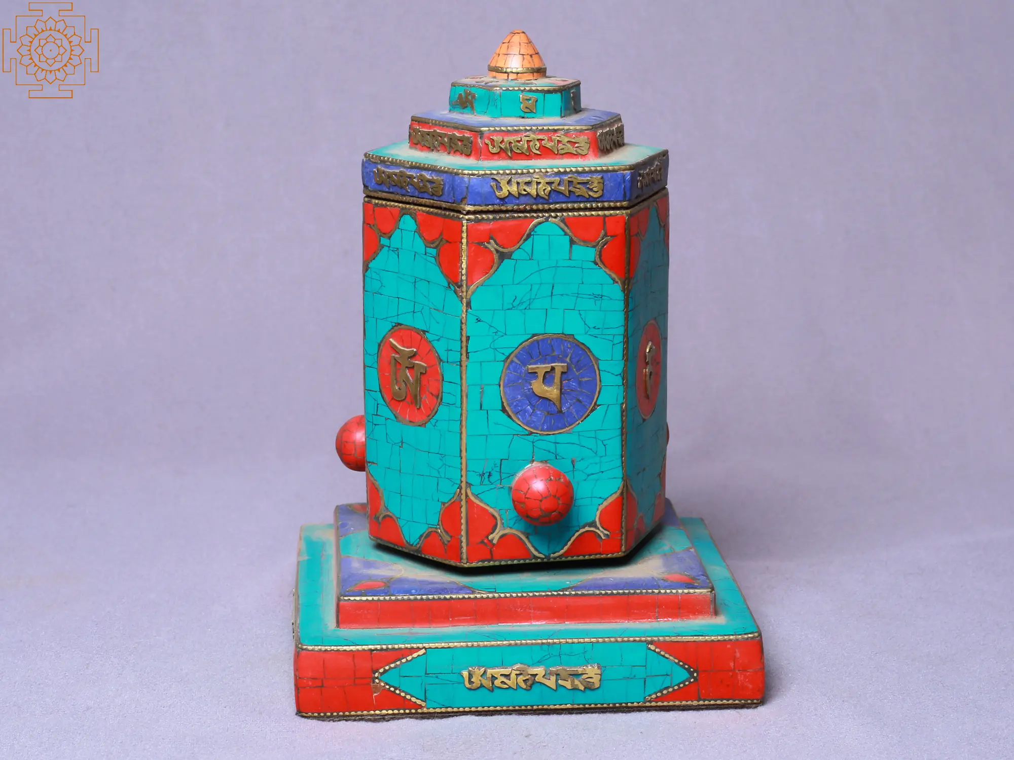 Appearing as a unique and captivating form of the prayer wheel is the Six Sides Box Full Stone Setting Wooden Table Mane that showcases a distinctive Tibetan touch. Placed on a two-layered pedestal resembling a temple structure, this prayer wheel features a six-sided box with highly significant mantras sculpted on each side. The exquisite carvings and fine designs on the top and within the box infuse holiness and reverence into any space it occupies. The mantras, present on the top three layers and below the boxes in the centre, enhance the spiritual value of this prayer wheel, providing practitioners with a profound tool for their spiritual practice.