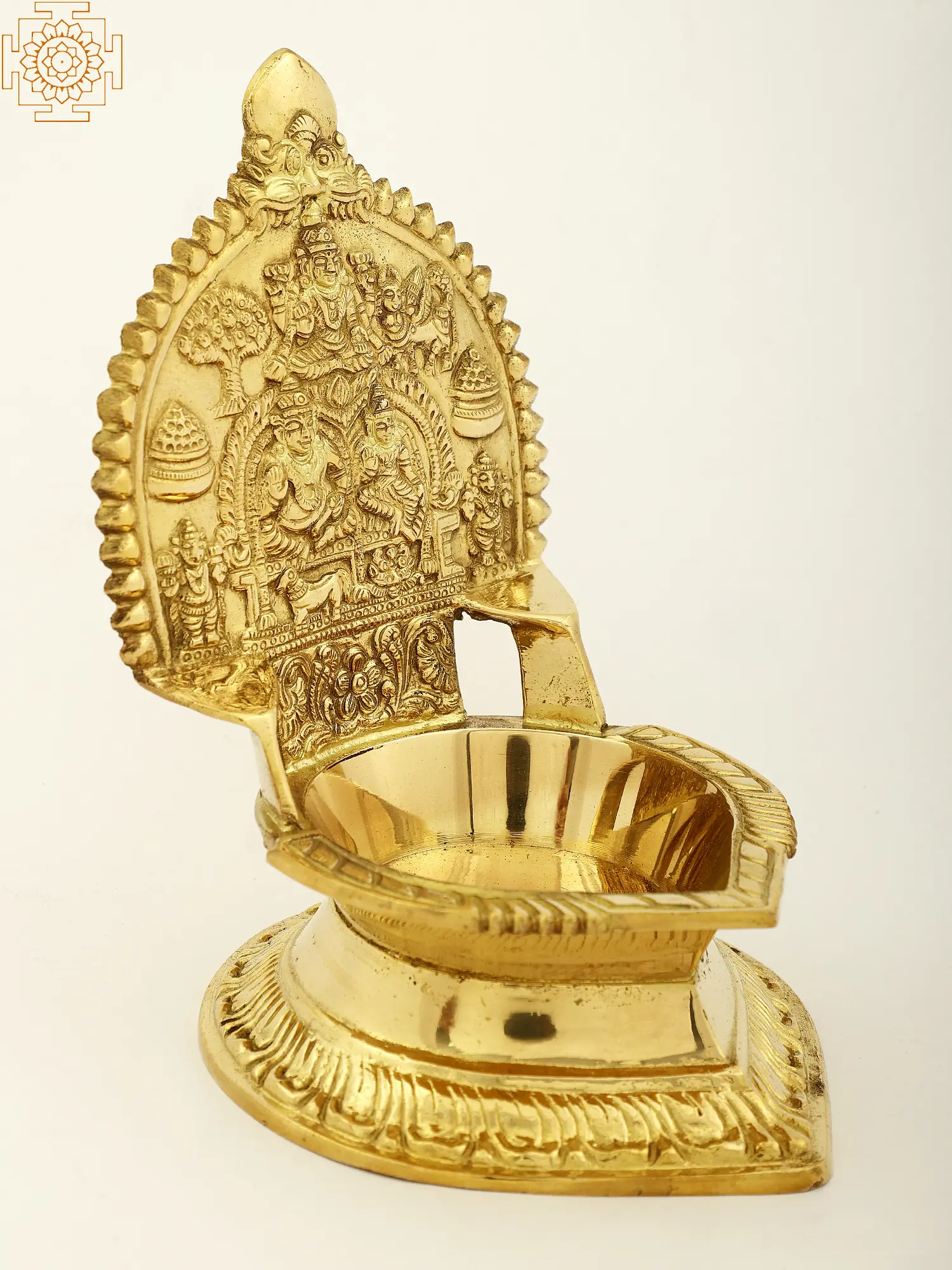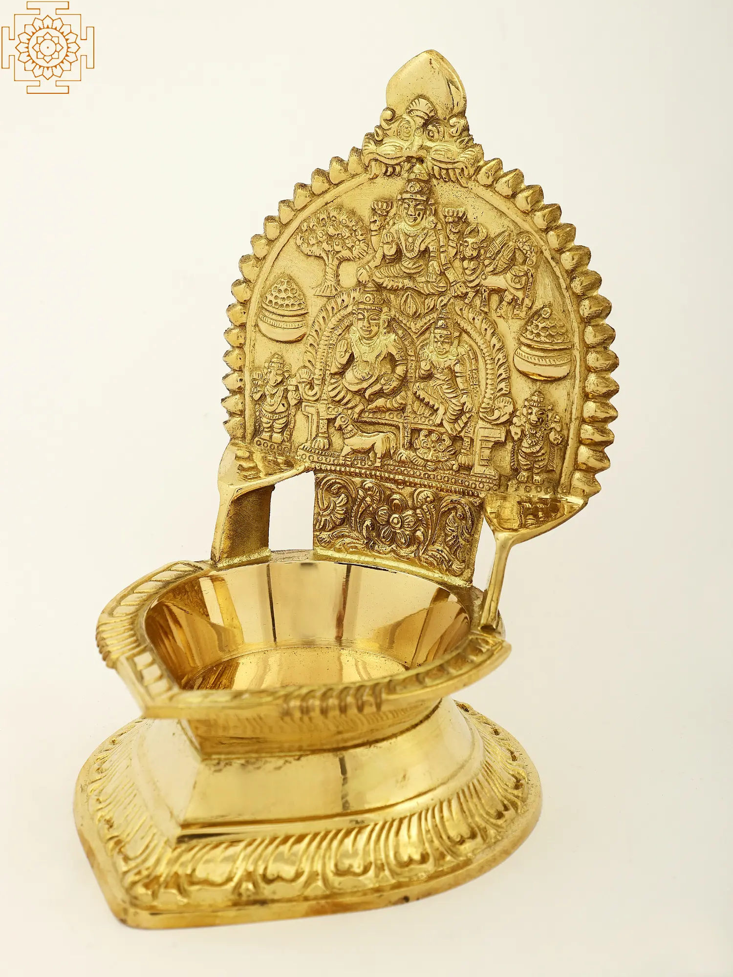 This Lakshmi Vilakku is the epitome of good luck and prosperity. A fine combination of fire ritual and divine imagery, this lamp depicts Goddess Lakshmi seated on a lotus and Lord Kubera and his consort Bhadra (Kuberi) sitting under her shadow and blessing the devotees. The entire image is further assisted with sacred images of Kamdhenu (cow), Parijata (tree), Kirtimukha, and the horse. Shri Kubera is also shown carrying a mongoose, which according to folktales helped Kubera defeat the snakes, as they are natural predators of the reptiles.
