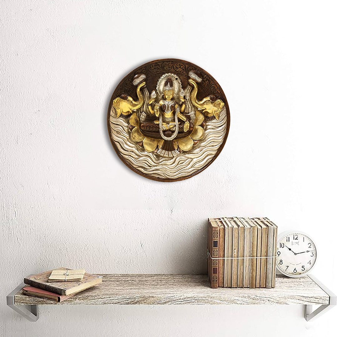 Here is a handcrafted wall hanging, consisting of the earliest known, conventional features of Sri yet due to its definite finish, it appears avant-garde. Sri-Lakshmi sits in padmasana or the lotus pose, holding lotus buds, sitting on a gigantic, fully bloomed lotus, in a body of water, which probably alludes to her abode, the Ksheer Sagar or the Ocean of Milk. Elephants flanking her are considered the embodiment of rain-filled clouds in texts, while Lakshmi herself is considered the personification of Earth.