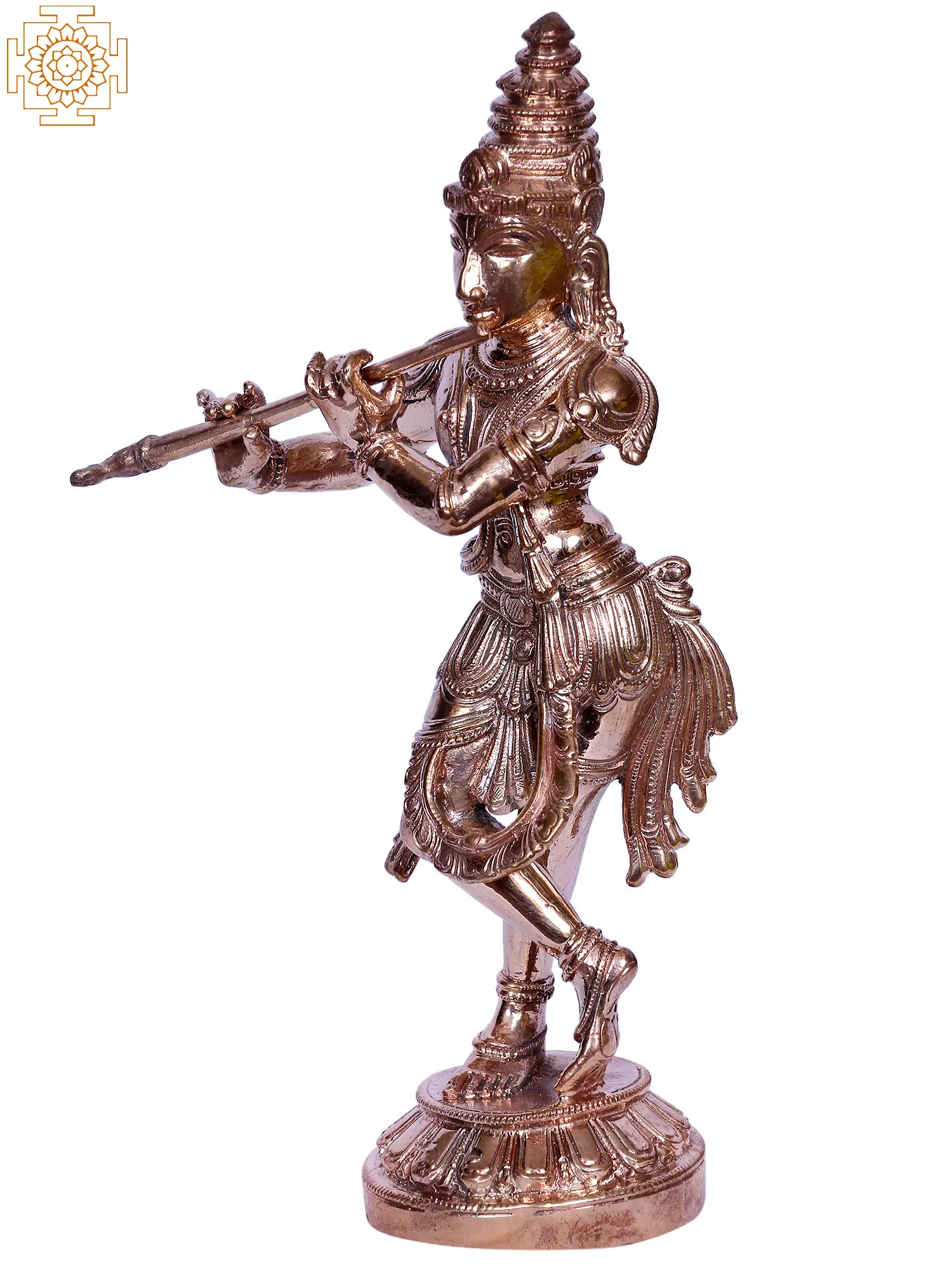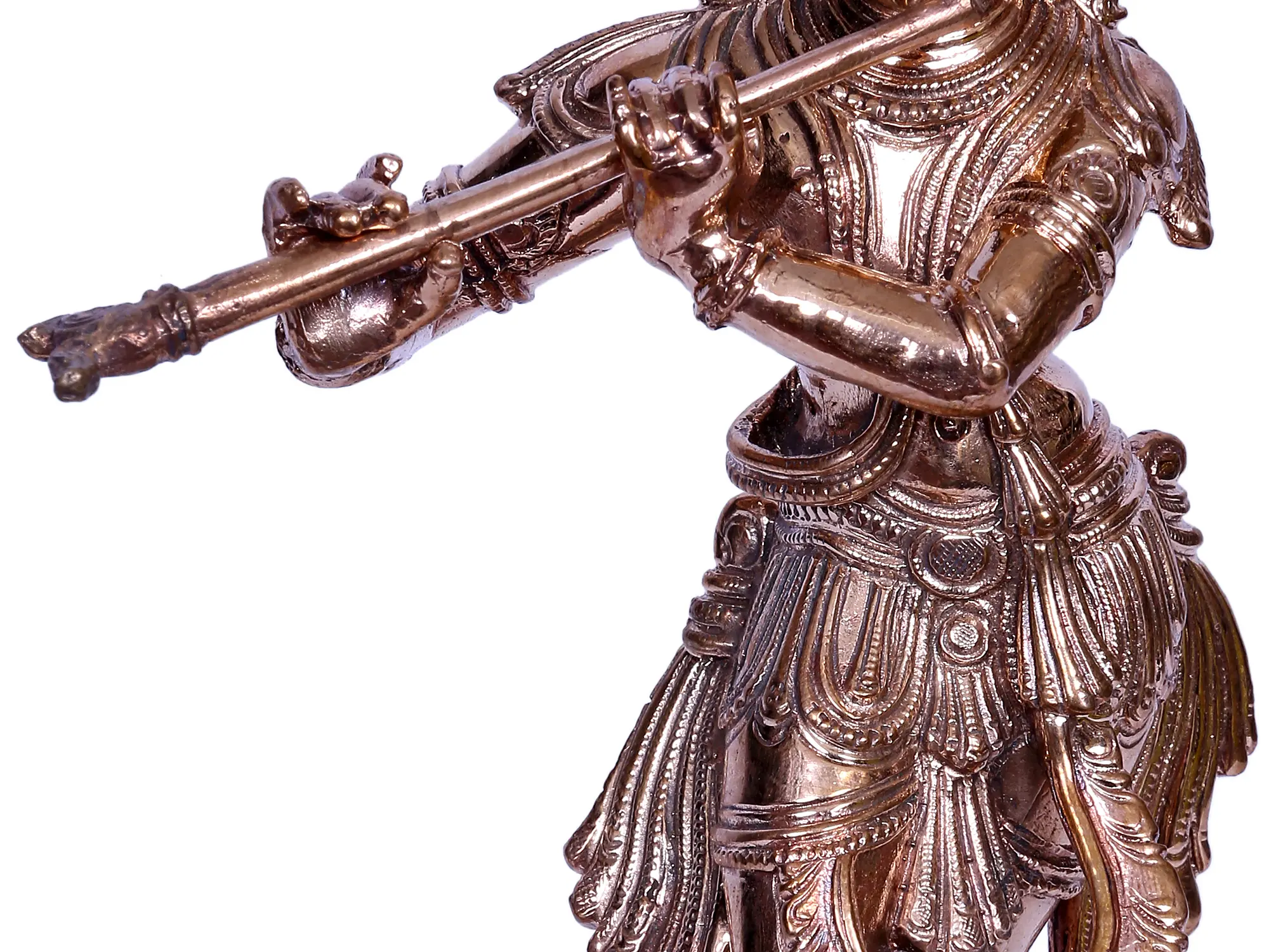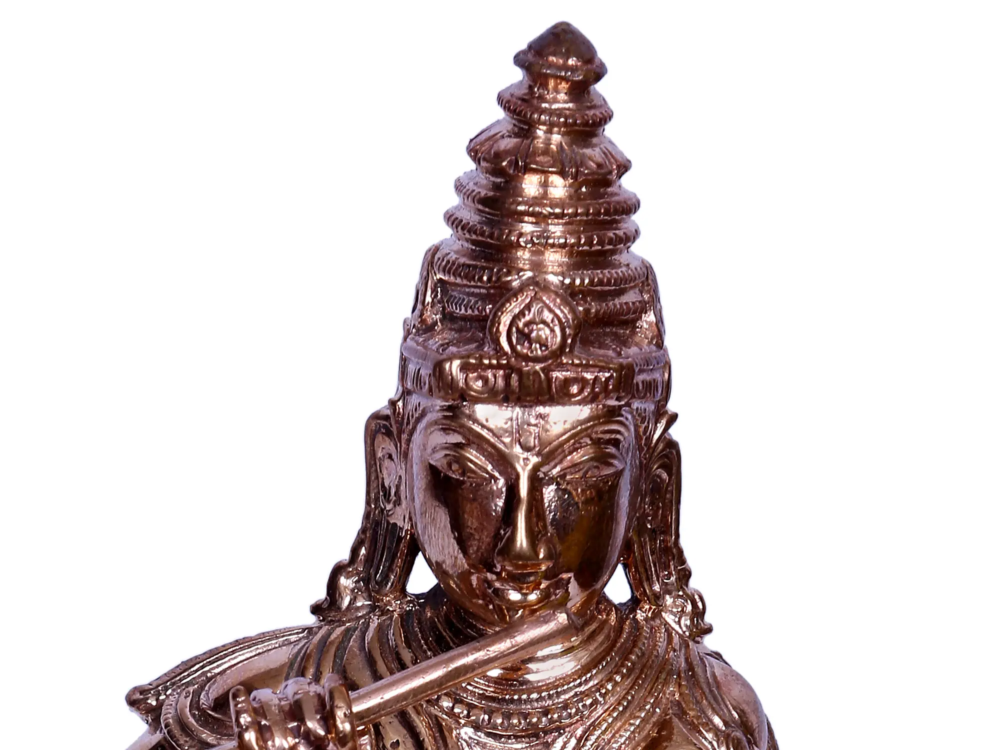 In a sublime manifestation of divinity, Lord Krishna, “also known as Madhav”, graces the cosmos, poised upon a lotus pedestal in the “Natvar Asana posture”. Radiant purity emanates from his being, adorned in regal splendour crowned by “Ratnapara”. A beautiful “Dhoti” drapes his divine form, embellished with celestial jewels that reflect the cosmos’ brilliance. With mellifluous notes, “Murlidhar” engages in the eternal cosmic dance, playing the flute that orchestrates the melody of creation. Crafted in Panchaloha bronze from “Swamimalai” using the ancient “Madhuchista Vidhana (Lost-Wax) technique”, this sacred statue symbolizes the cosmic harmony orchestrated by the Supreme, a reminder of the divine melody that weaves through existence, inviting souls to dance in the eternal rhythm of existence.