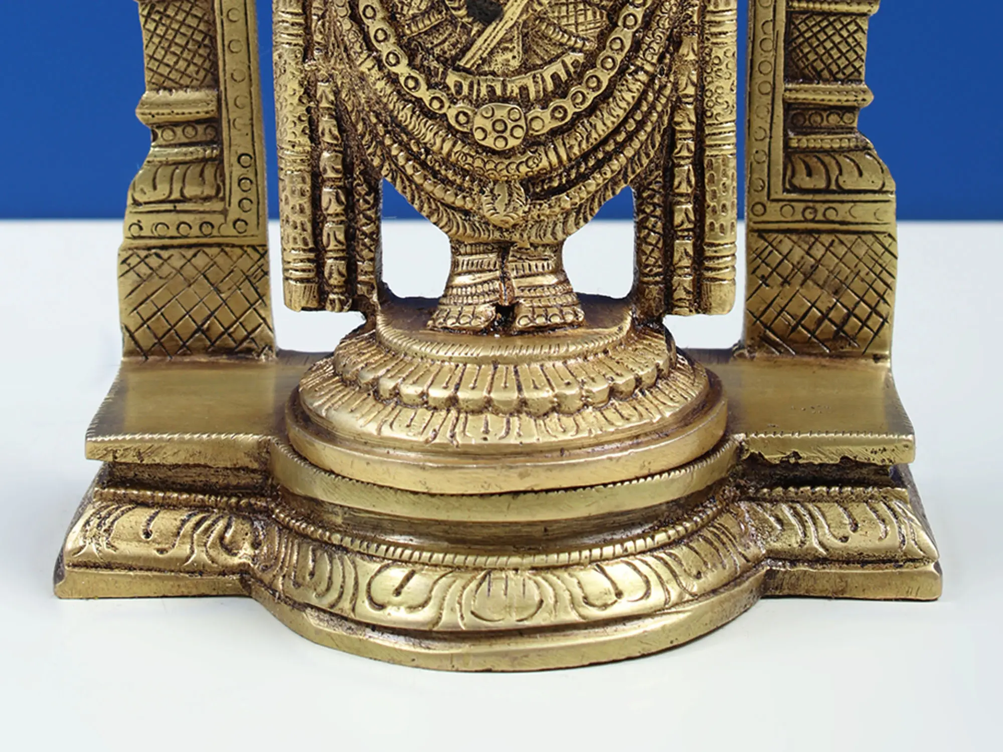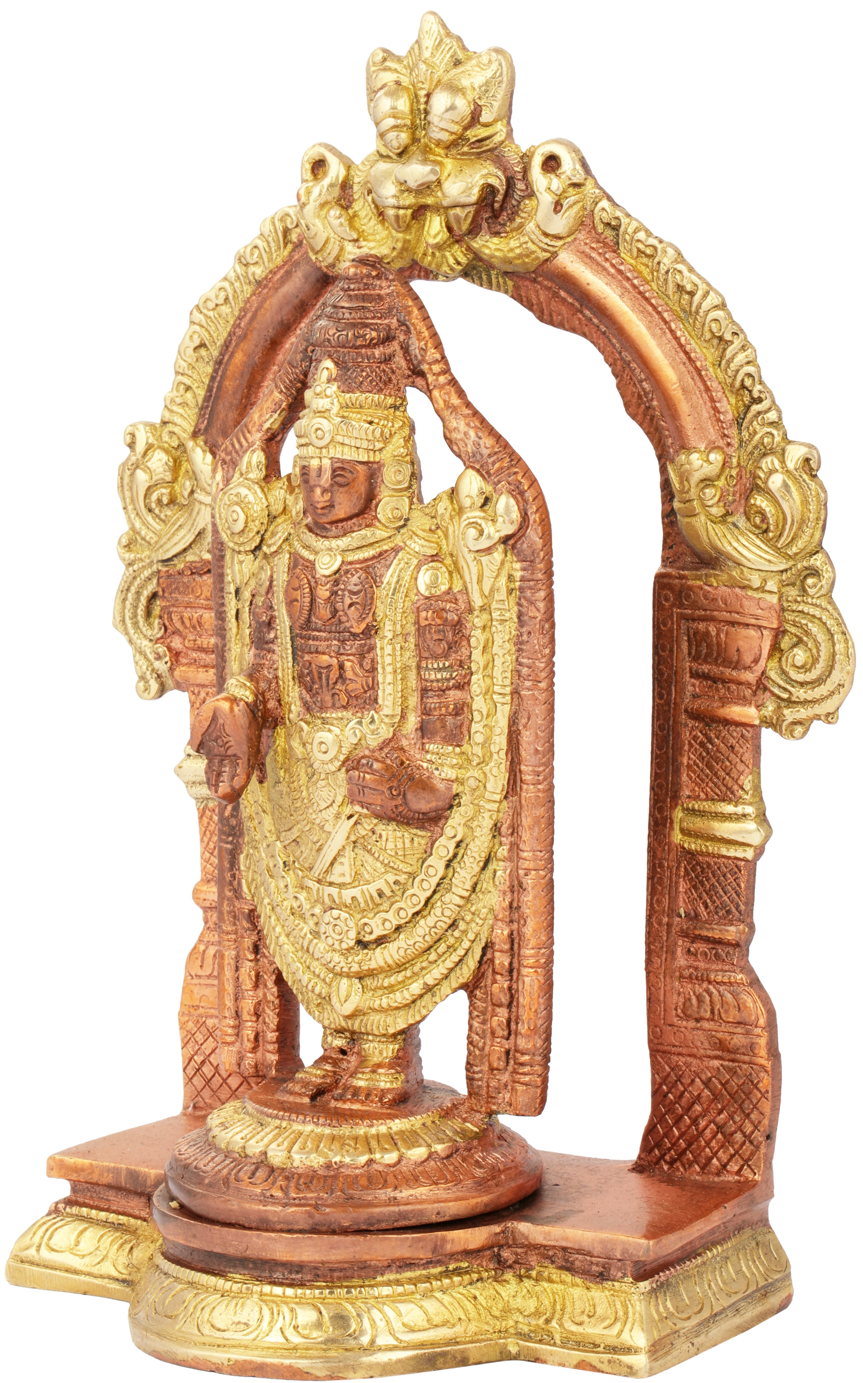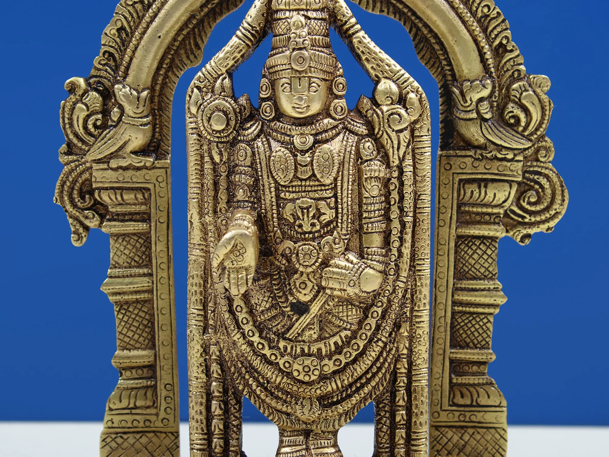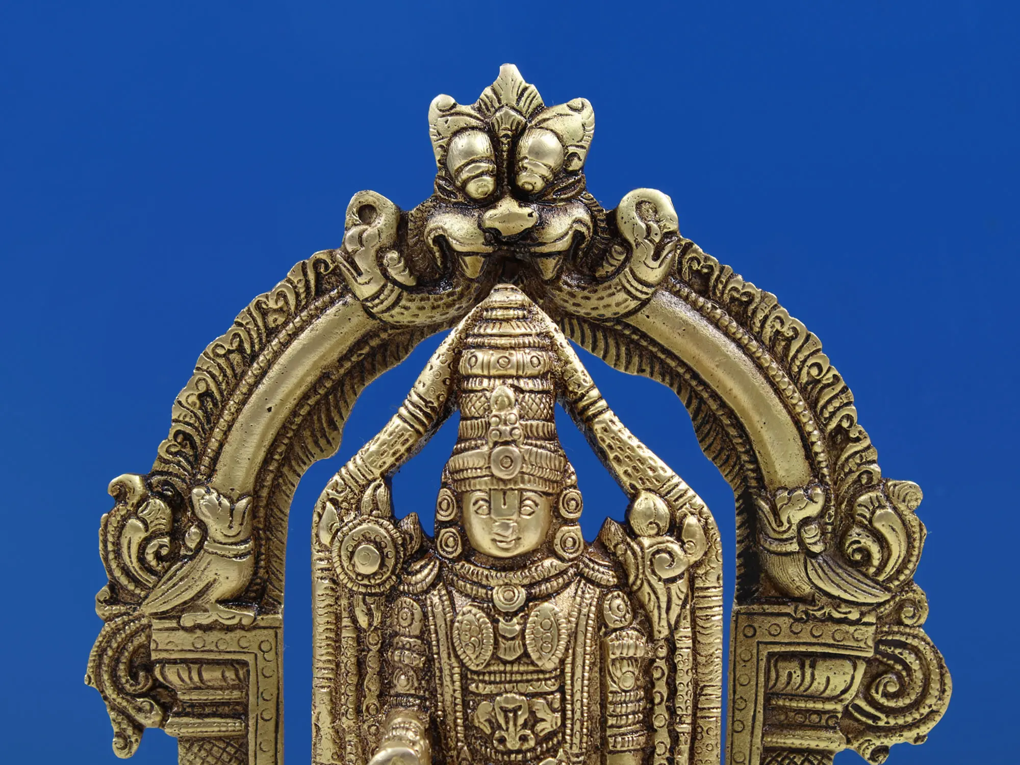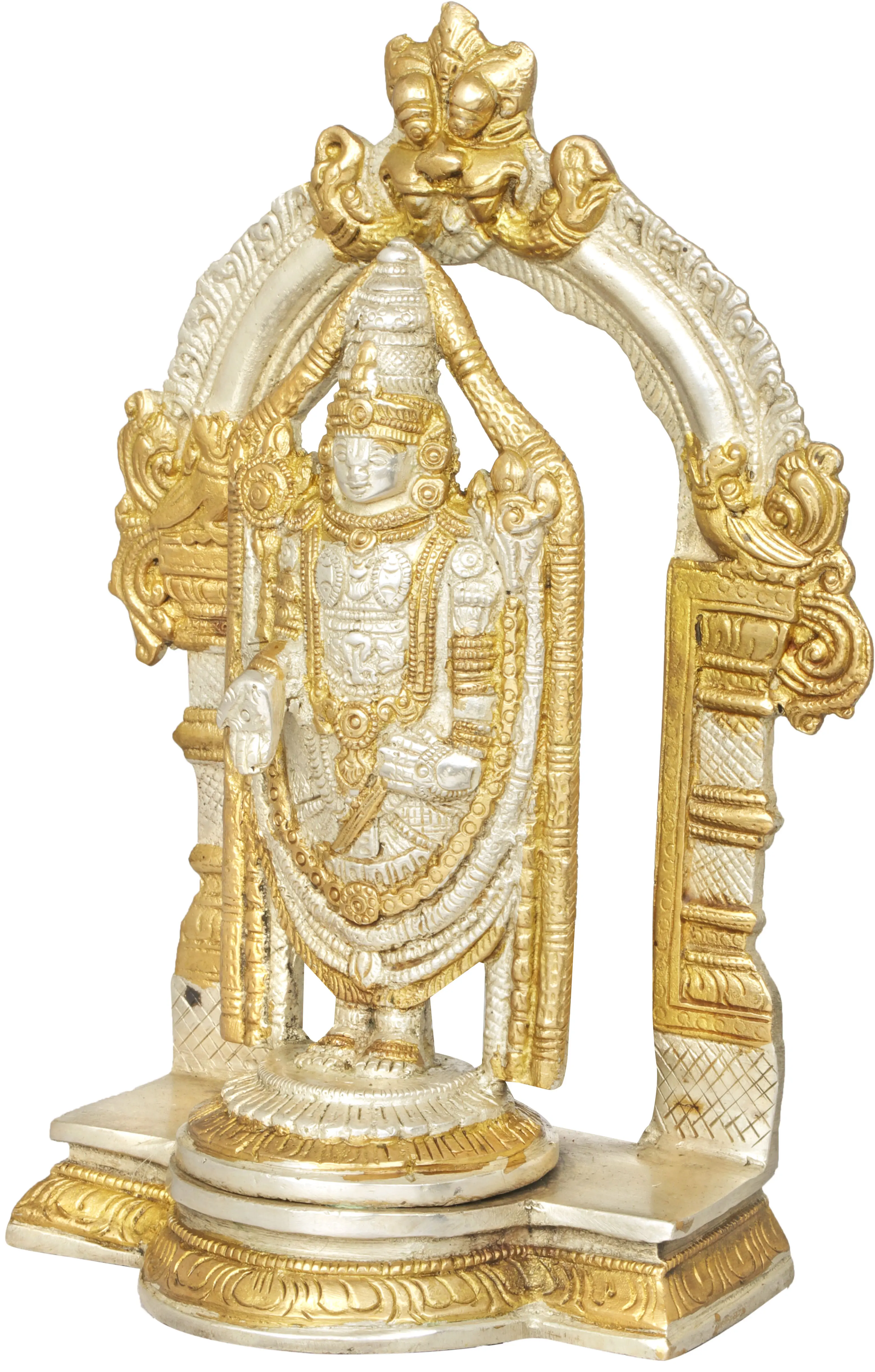 The brass sculpture of Lord Venkateshvara at Tirupati showcases a divine invitation. Venkateshvara, known as Balaji, is a symbol of unconditional grace and love. He stands with his hand raised, offering blessings to all who seek his presence. This sculpture personalizes the warmth and acceptance found at the sacred hills of Tirupati, reminding us that the divine is accessible to all. The raised hand signifies an invitation to receive grace and love, making it an embodiment of the boundless love and blessings found in the holy abode of Lord Venkateshvara.