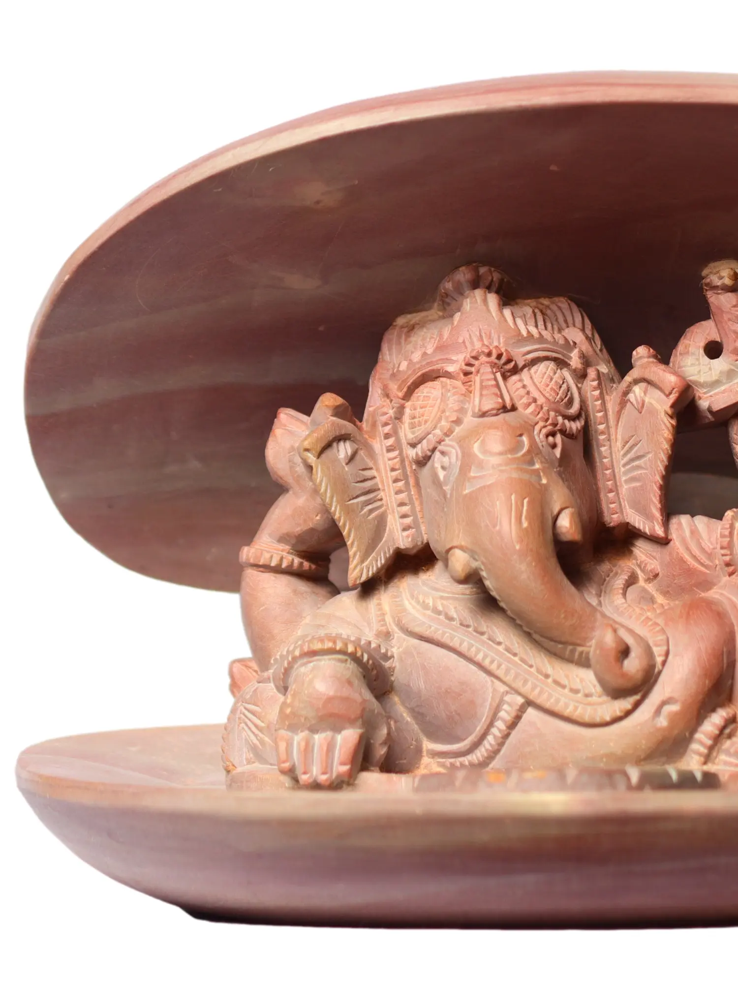 Behold a masterpiece carved from the earth's embrace, a depiction of Lord Ganesha in a posture of ultimate repose. This exquisite statue, rendered in a soft, blushing pink stone, captures the beloved elephant-headed deity in a moment of tranquil contemplation. Nestled within the protective curve of a sculpted shell, Ganesha's form is both majestic and approachable, inviting a sense of peace and harmony into any space. The delicate carving showcases intricate details, from the ornate jewelry adorning his divine form to the gentle curve of his trunk, hinting at the profound wisdom he embodies. ––––––––––––––––––––