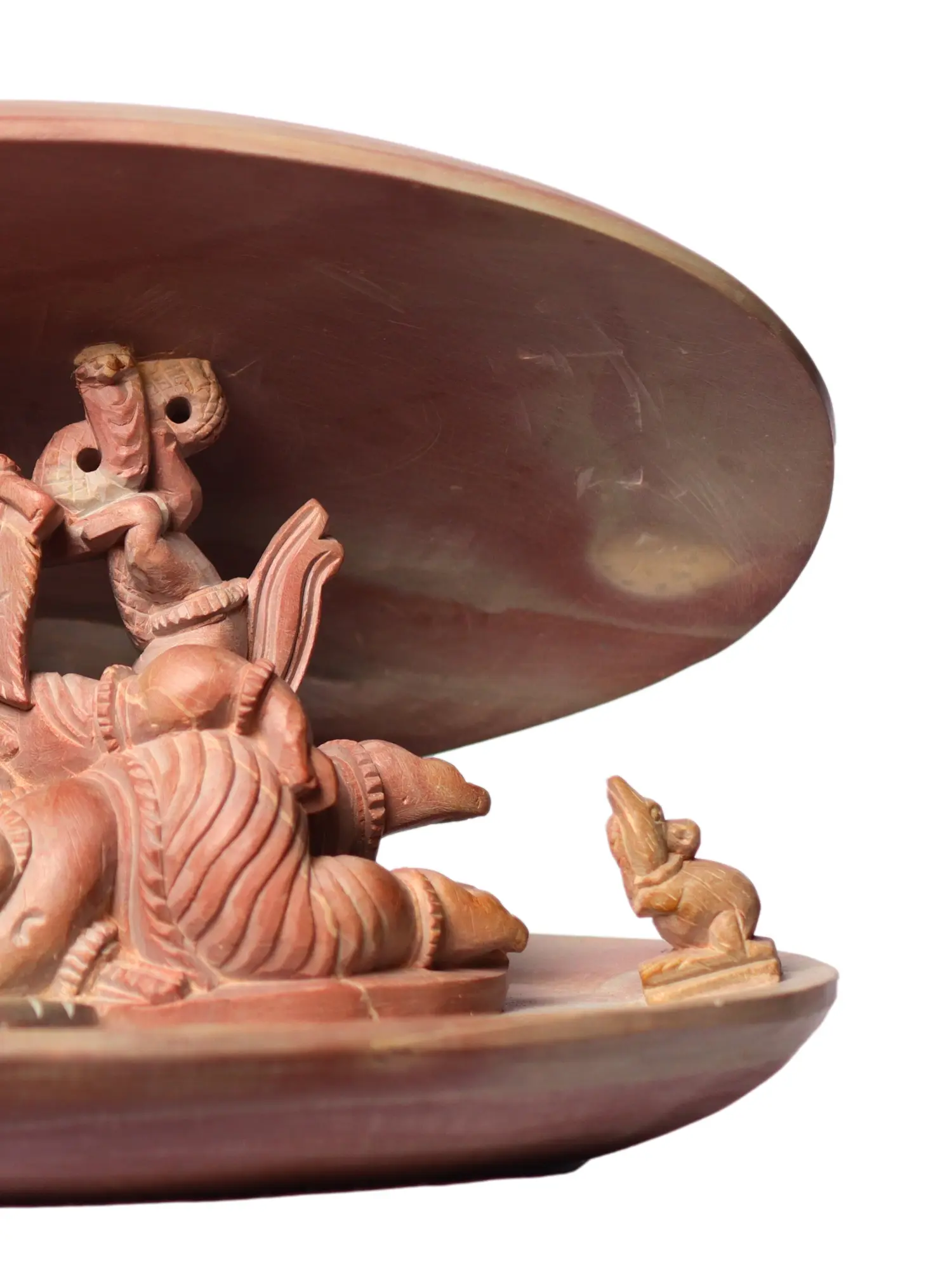 The inspiration for this artwork likely draws from the rich tapestry of Hindu mythology. Ganesha, the Remover of Obstacles and the patron of arts and sciences, is revered across India. His serene reclining posture suggests a moment of deep meditation or perhaps a well-deserved rest after vanquishing a cosmic challenge. The protective shell can be interpreted in various ways – as a cosmic egg from which creation emerges, a symbol of the universe itself, or a safe haven offering solace and protection. The presence of his vahana, the mouse, often depicted as eager and attentive, subtly emphasizes Ganesha's approachable nature and his ability to connect with even the smallest of beings. ––––––––––––––––––––