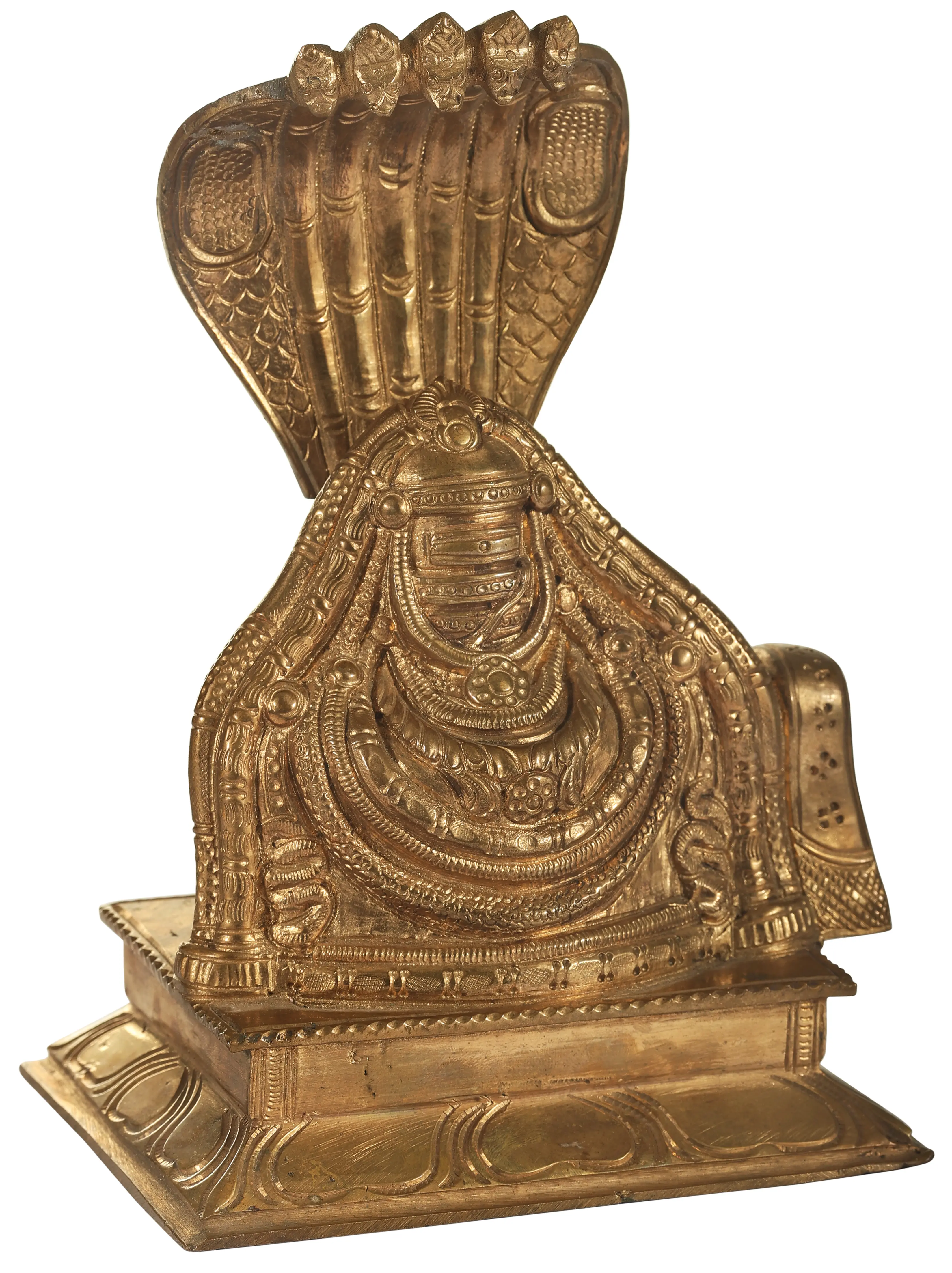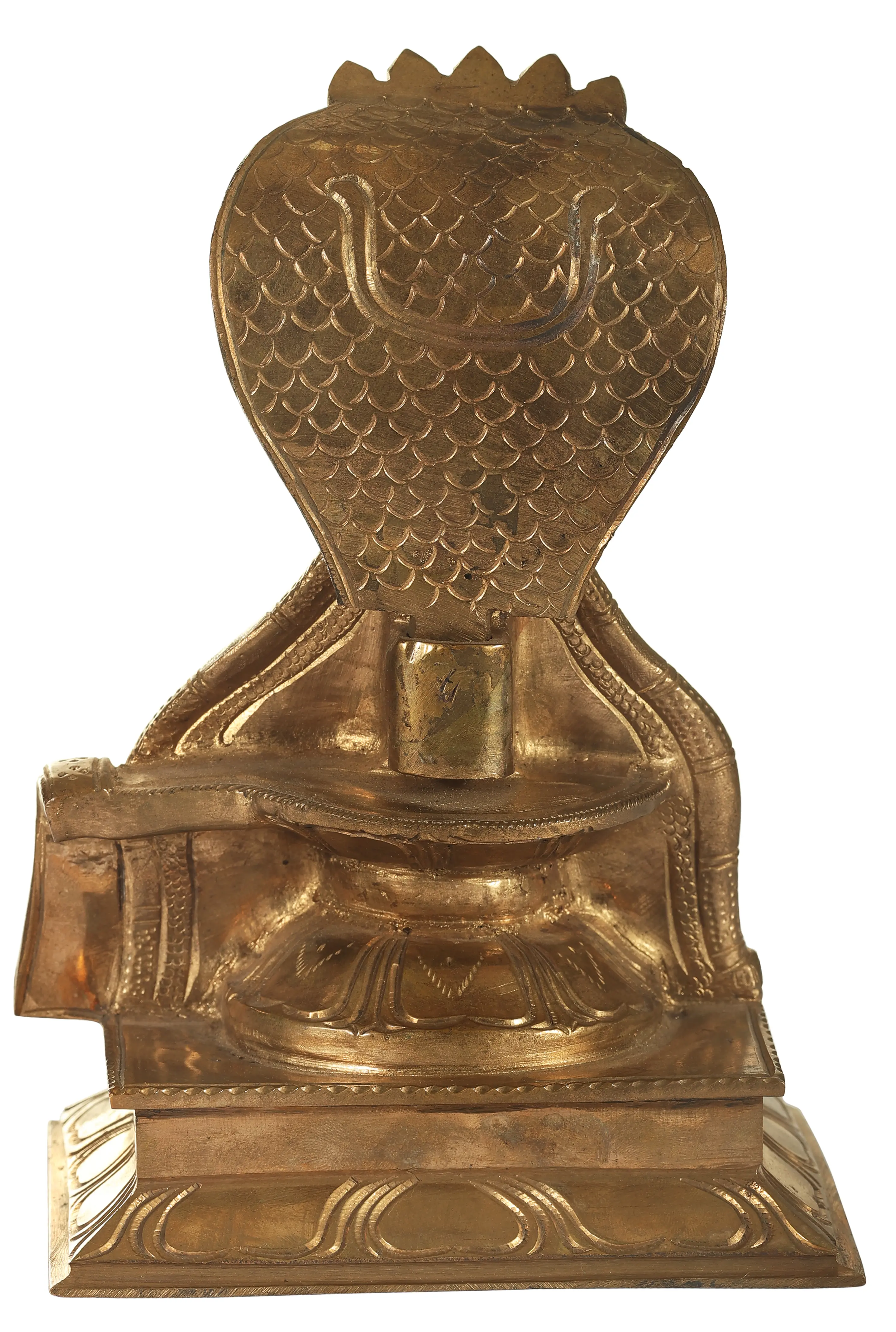 The dominant feature of this arresting sculpture is the multi-headed cobra, its scales rendered with remarkable precision, forming a protective canopy. In Hindu mythology, the serpent, particularly the divine serpent Adi Shesha, is inextricably linked with Lord Vishnu, often depicted as his couch, supporting him as he meditates on the cosmic ocean. However, serpents also represent primal energy, spiritual power, and the cyclic nature of time. Here, the cobra's watchful presence suggests divine guardianship, shielding the central deity from all harm and signifying immense power and control over the primordial forces. The elaborate headdress of the cobra, with its distinct hoods, elevates the divine aura of the piece, evoking a sense of awe and reverence.