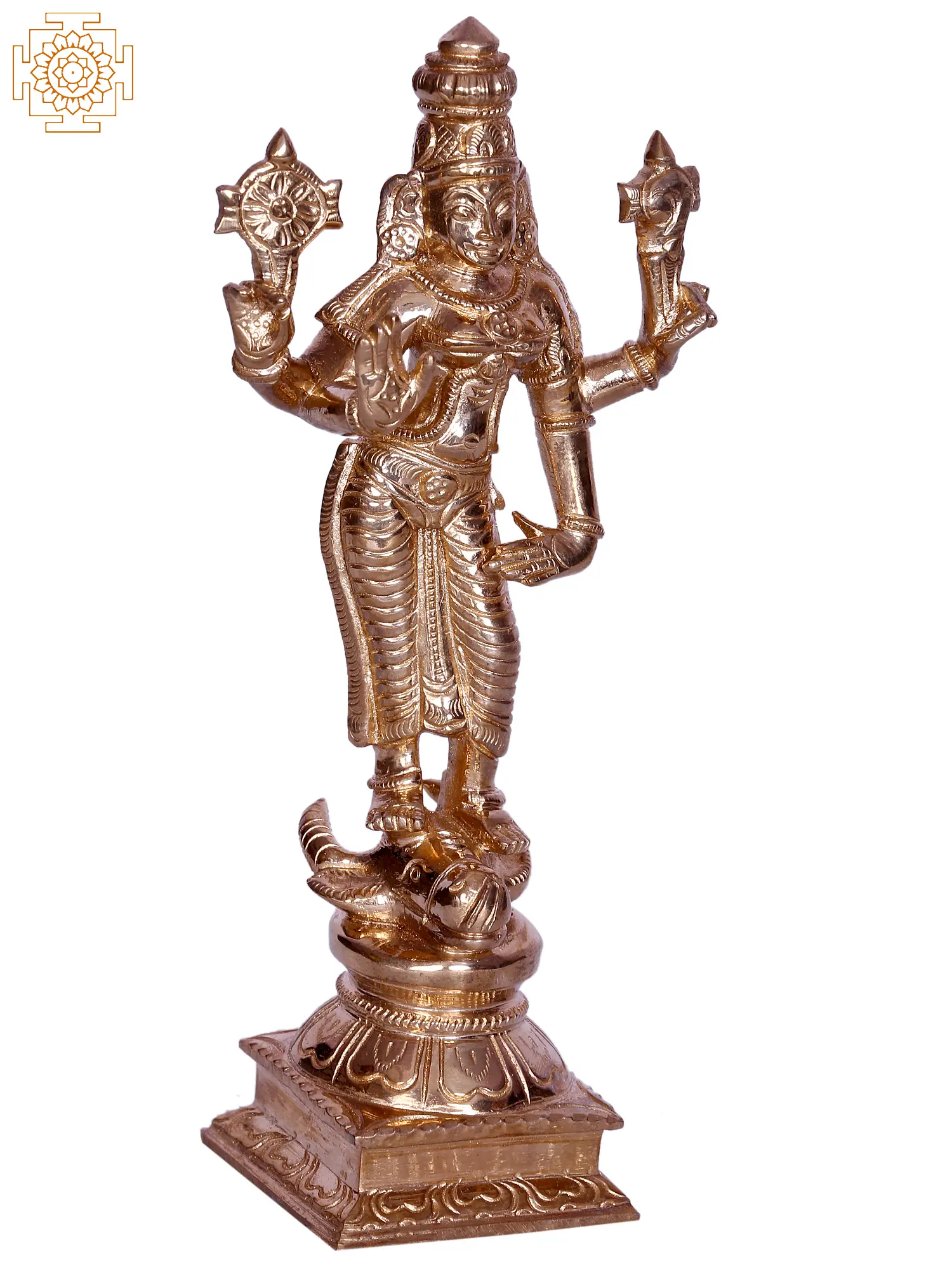 Standing actively and valiantly on the vanquished buffalo-demon or Mahishasura’s head, this aspect of the Hindu mother goddess Durga is known as Vijaya Durga or Mahishasura-Vijaya Durga, as an iconic memory of her Vijaya or victory over the Asura. Her attributes- Shankha (conch) and Chakra (discus) connect her to Sri Vishnu, who is often described as the brother of Parvati-Durga. With one hand on her waist, Mahishasura-Vijaya Durga raises the other in Abhaya mudra, a gesture of removing fears, for those who praise the mother as their protector.