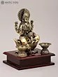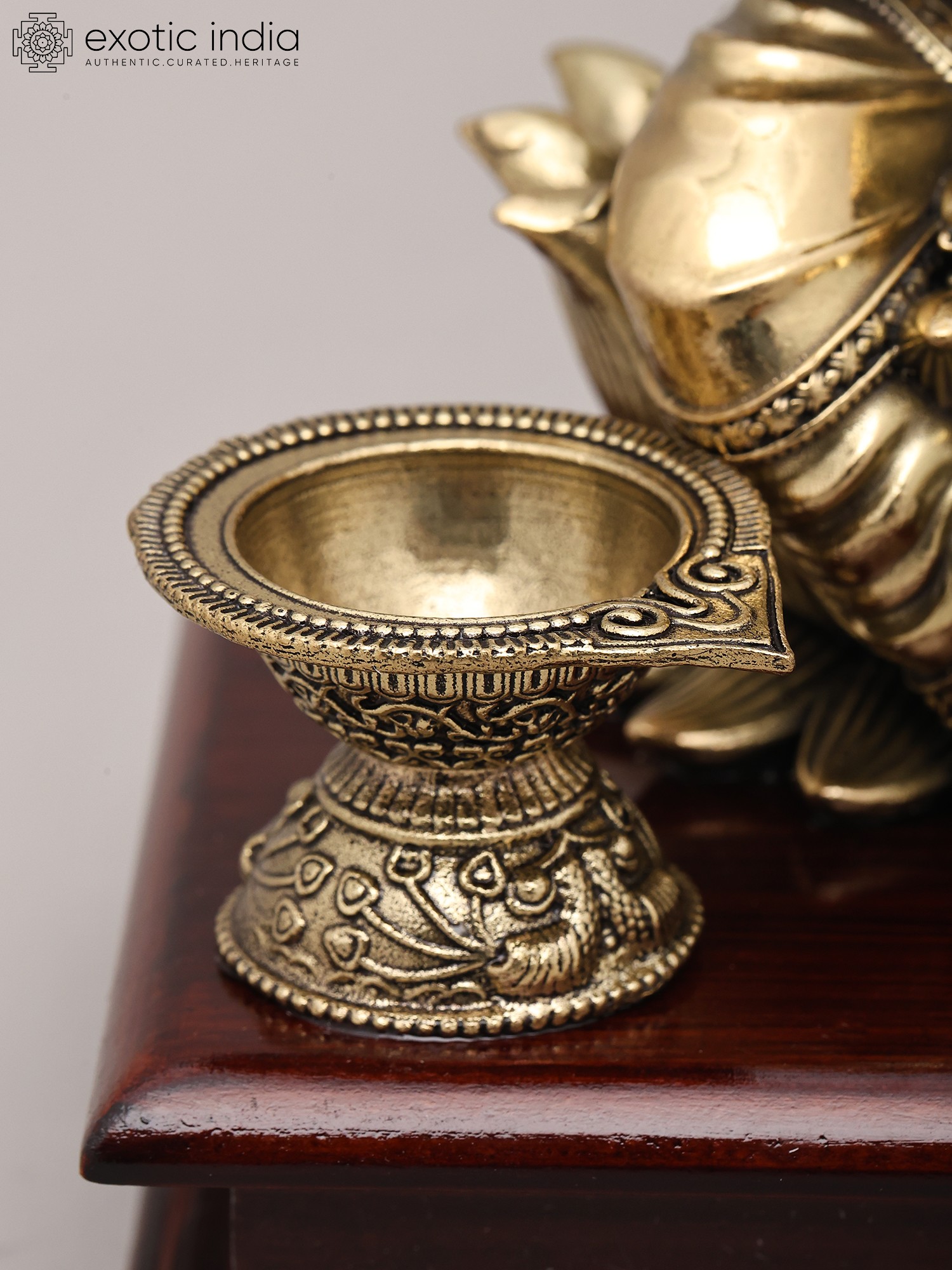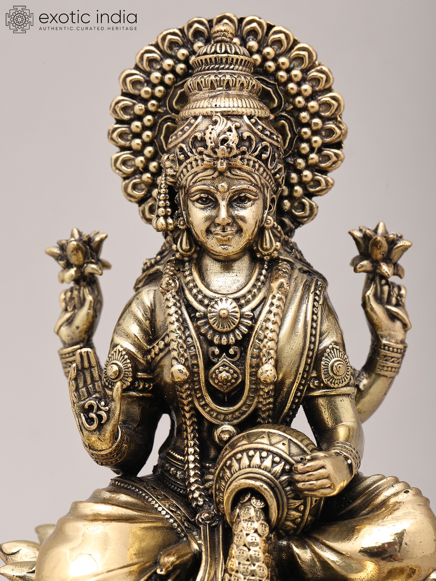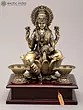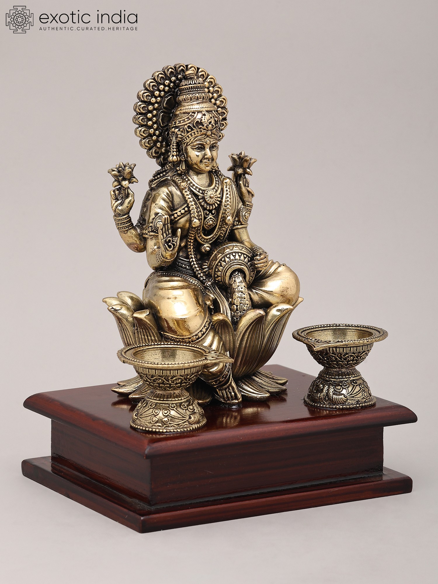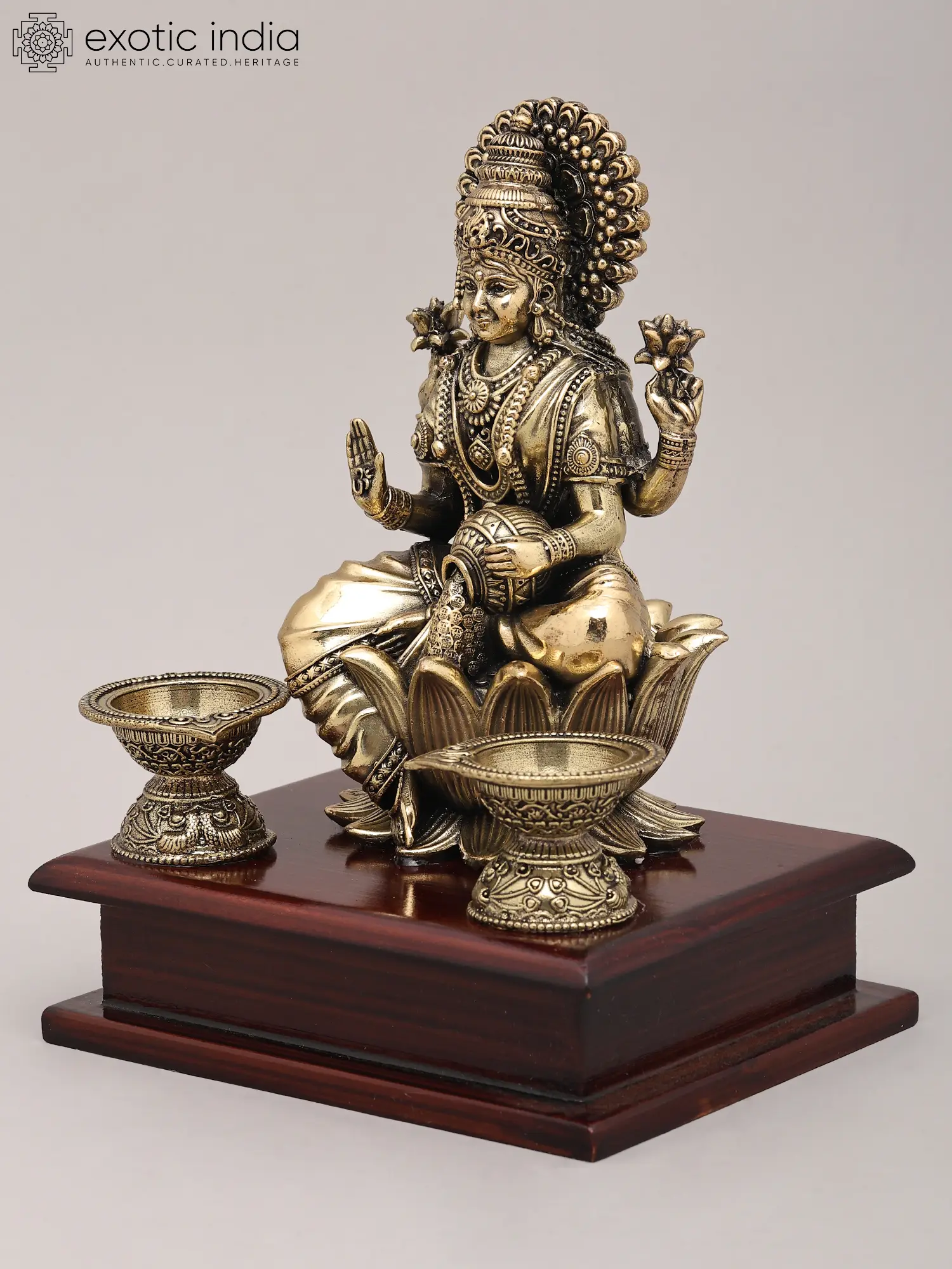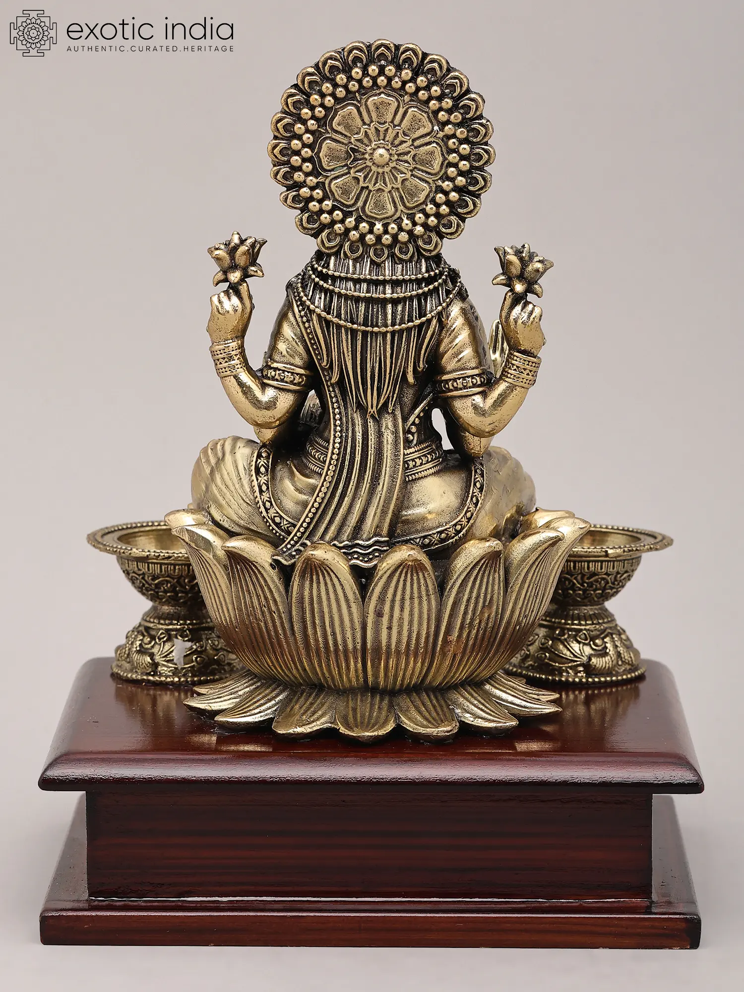 Superfine Goddess Lakshmi Seated on Lotus Flower with Wood Base | Brass Idol | Made in India