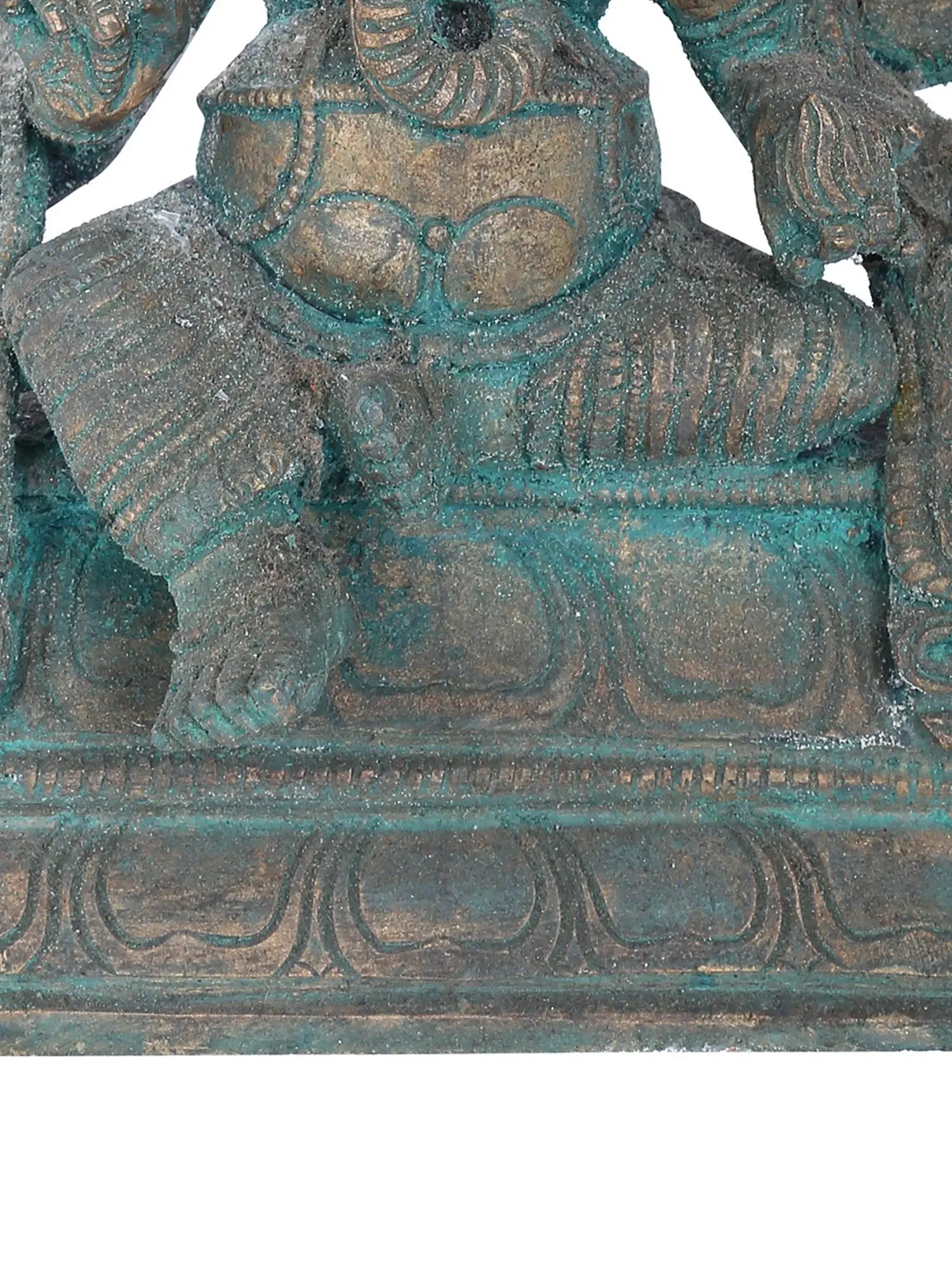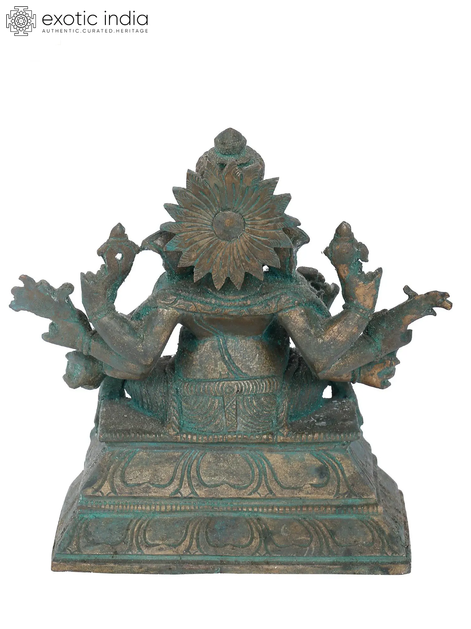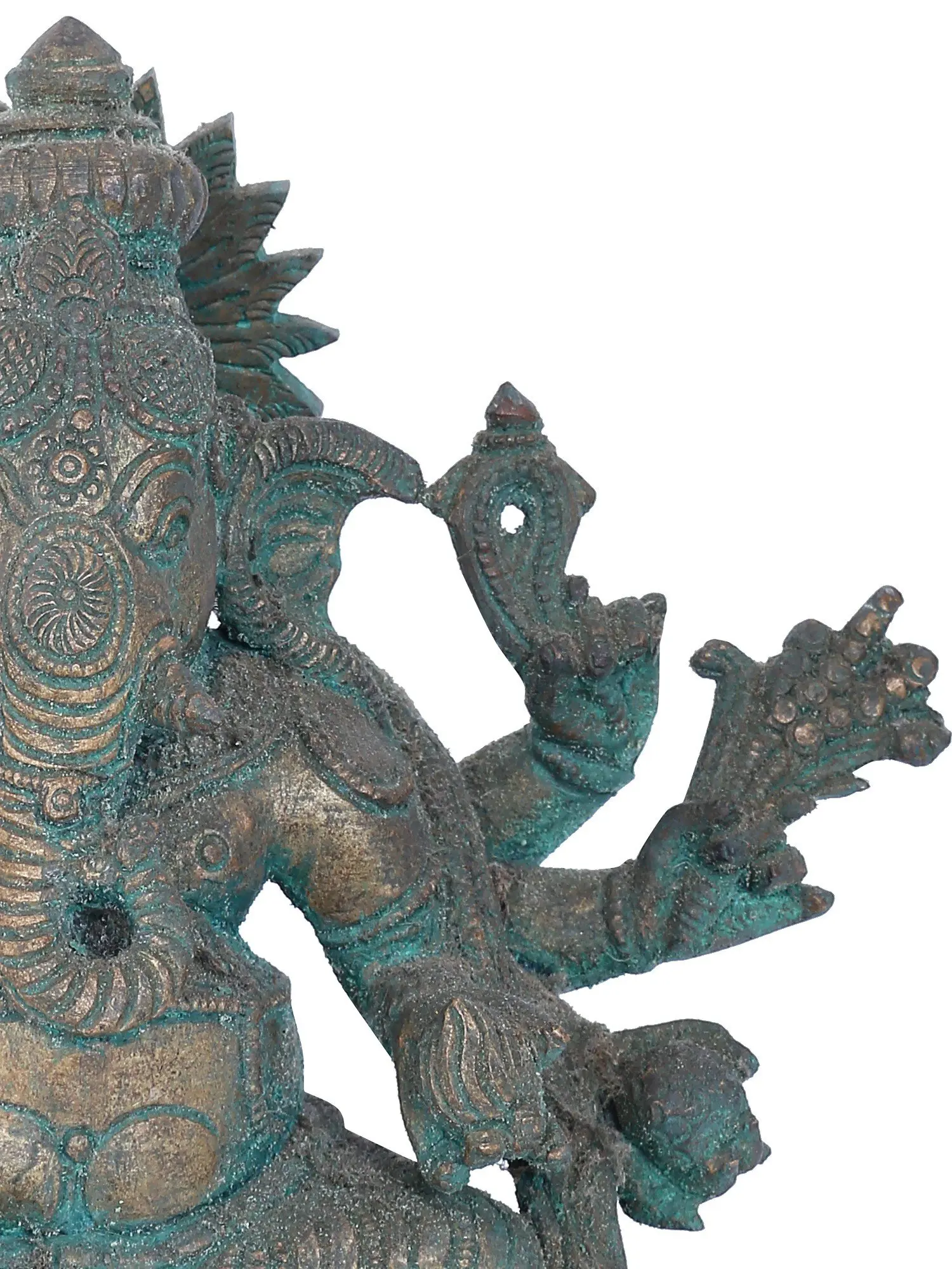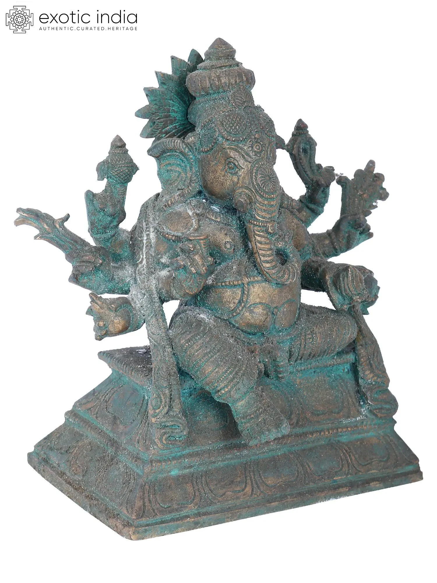 While his right-hand carries a broken tusk, an elephant goad, a sugarcane stalk, and a rose apple fruit, his left hand holds a noose, his favorite Modak (dumpling), a wood apple fruit, and a sprig of paddy. This statue with the green patina tint brings an antique look to it. As you immerse yourself in the intricacies of this sculpture, feel the cosmic energies flow through each gesture, inviting a profound connection with the omnipotent Ashtabhujadhari.
