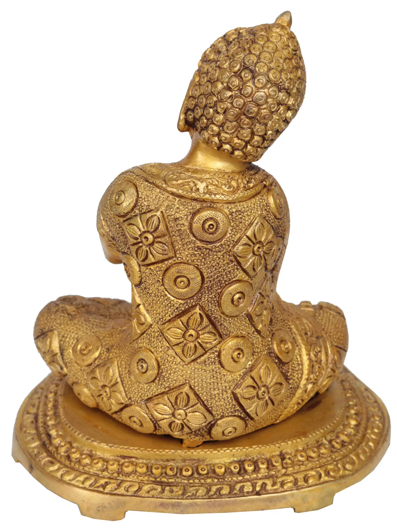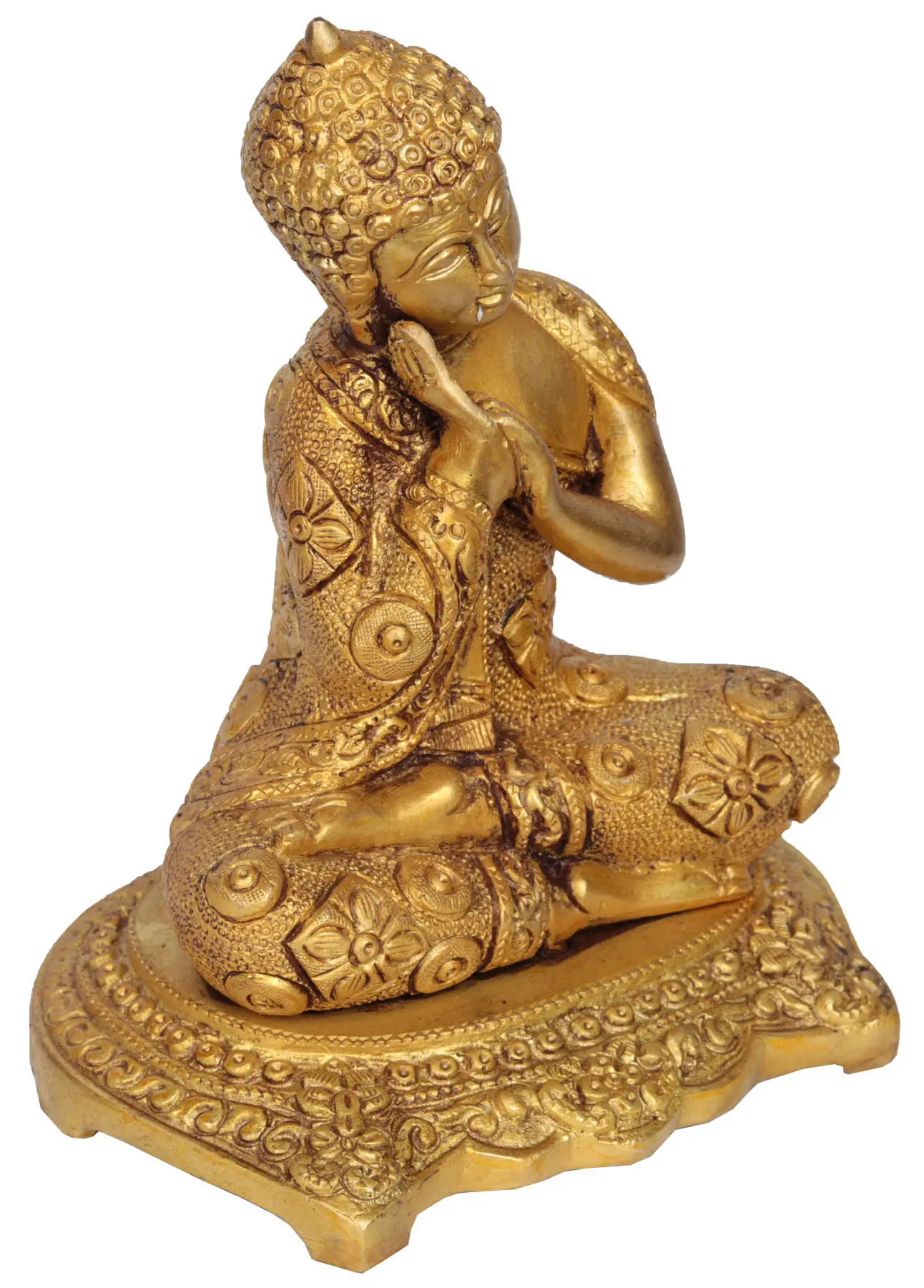 This ornate brass statue exudes an Oriental gleam that only one from the Exotic India collection can. With his legs poised in the ascetic style abound in Tibetan Buddhism and his head tilted pensively at an angle, this statue is highly representative of Tibetan Buddhism.