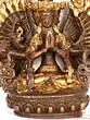Out of all the deities of Avalokiteshvara in the Tibetan Pantheon of Buddhism, Chenrezig is the most renowned. His Holiness the Dalai Lama is believed to be an incarnation of this Bodhisattva, a living symbol of boundless compassion. Chenrezig is conceptualized and visualized in various forms, with many faces and arms. He sits on a full-blown lotus crossing his legs. He is usually depicted having four arms that represent the four immeasurables; Immeasurable Compassion, Immeasurable Kindness, Immeasurable Joy, and Immeasurable Equanimity. His two arms join together at the heart in a prayer position holding a wish-fulfilling gem in between. With his upper left arm, he holds a lotus flower and with his other right arm, he holds a crystal rosary (mala) which he uses to count the repetitions of the mantra “Om Mani Padme Hum”, which means “Hail to the Jewel in the Lotus, which is capable of liberating all beings from their suffering”. His meditation is practiced by all the great Buddhists in the lineage of Tibetan Buddhism. He is always depicted clad in the clothes of a Bodhisattva and wears the skin of an antelope on his shoulders. Bearing a soft smile on his beautiful face, he looks down upon the sentient beings with his eyes full of love and compassion.