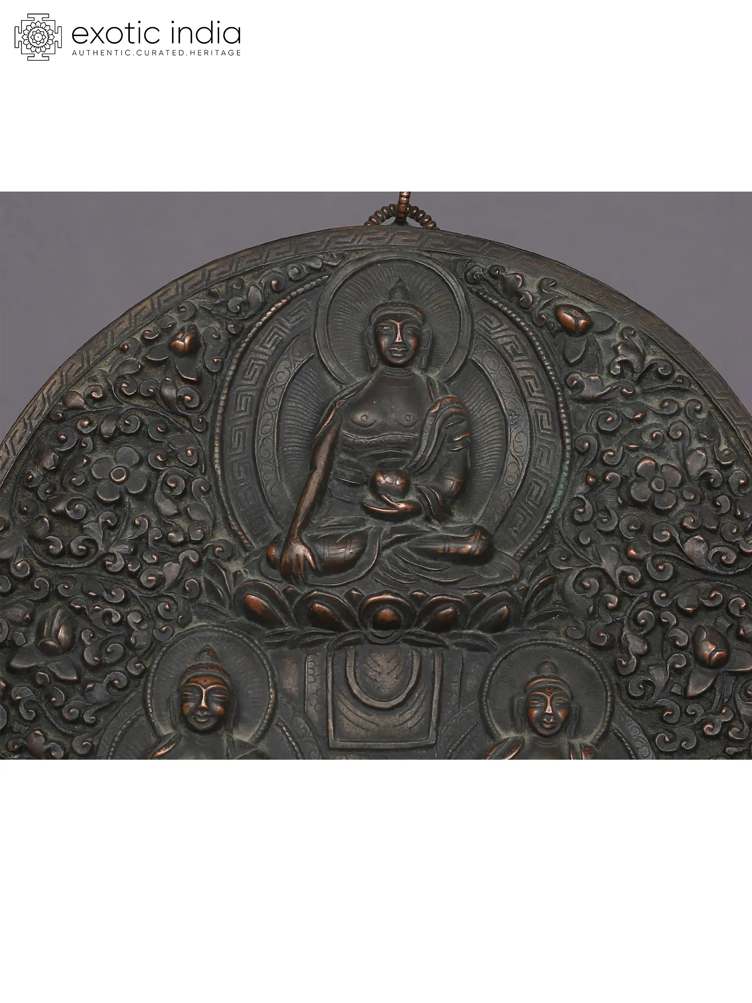 This exquisite wall hanging, originating from the sacred lands of Nepal, is a testament to the profound artistry and spiritual depth of Nepalese craftsmanship. Cast in brass, this circular medallion features a captivating depiction of three Buddhas, each rendered with serene grace and symbolic significance. The composition invites contemplation, drawing the viewer into a realm of peace and spiritual awakening. The central Buddha, seated in the lotus posture, is often interpreted as Shakyamuni Buddha, the historical Buddha who attained enlightenment under the Bodhi tree. His posture, with hands resting in his lap, signifies meditation and deep contemplation. He is surrounded by a radiant halo, symbolizing his omniscient wisdom and the light he brought to the world. Below him, flanking a central offering vessel, are two other Buddhas, their forms mirrored in peaceful repose. These could represent other significant Buddhas in Buddhist cosmology, such as Amitabha, the Buddha of Infinite Light, or Bhaiṣajyaguru, the Medicine Buddha, embodying healing and compassion. The arrangement of the three Buddhas may also symbolize the three jewels of Buddhism: the Buddha, the Dharma (teachings), and the Sangha (community). ––––––––––––––––––