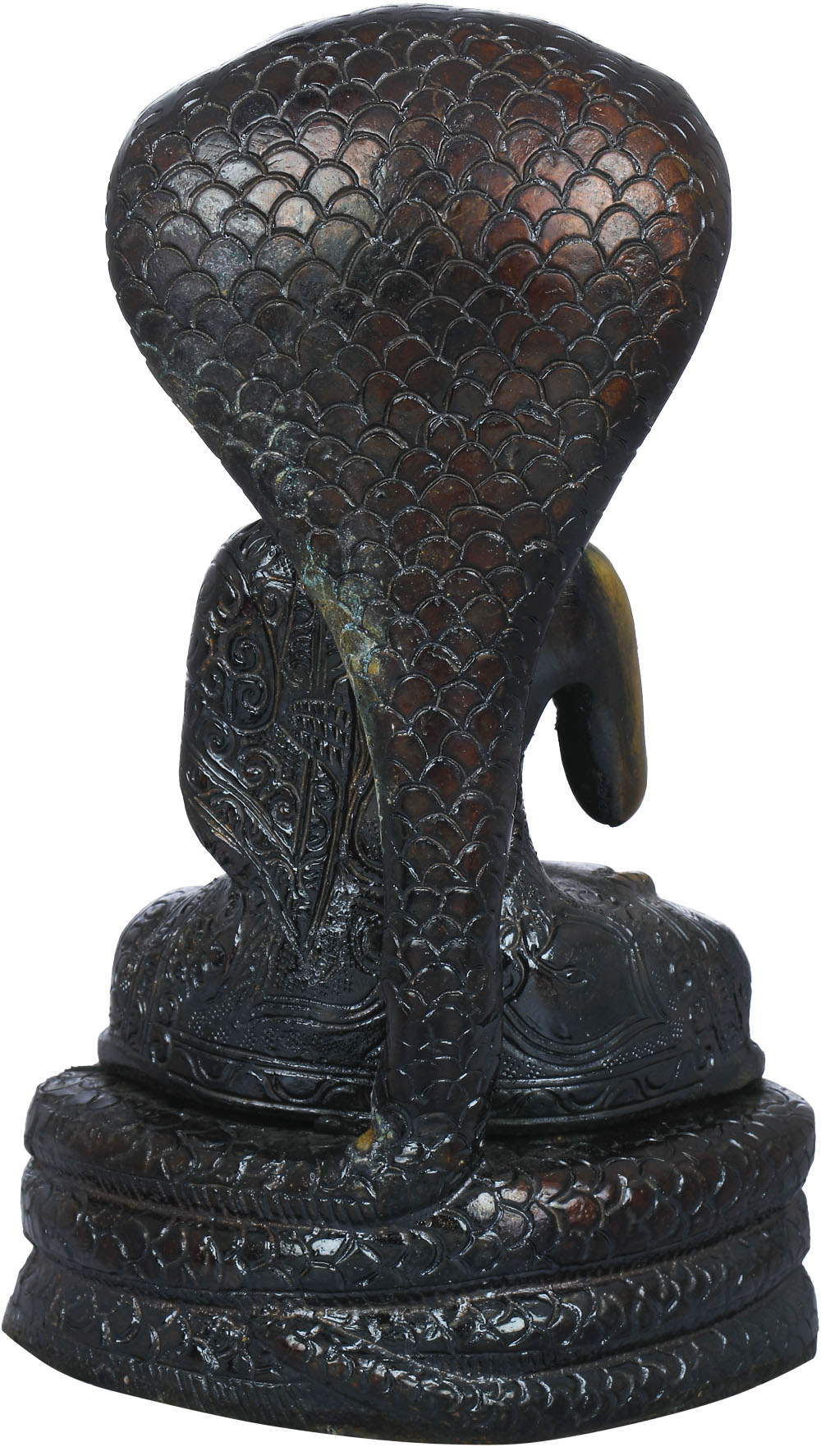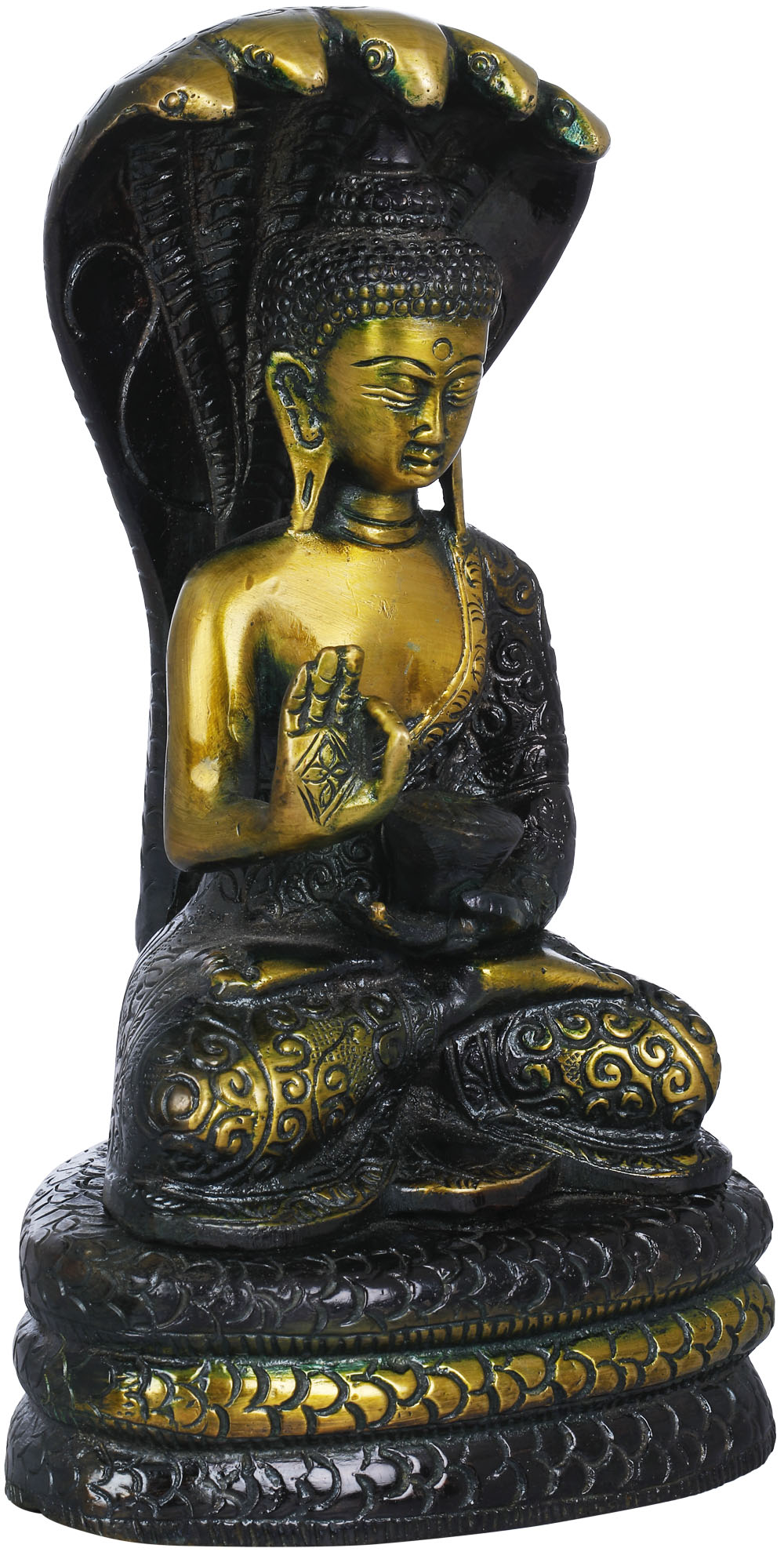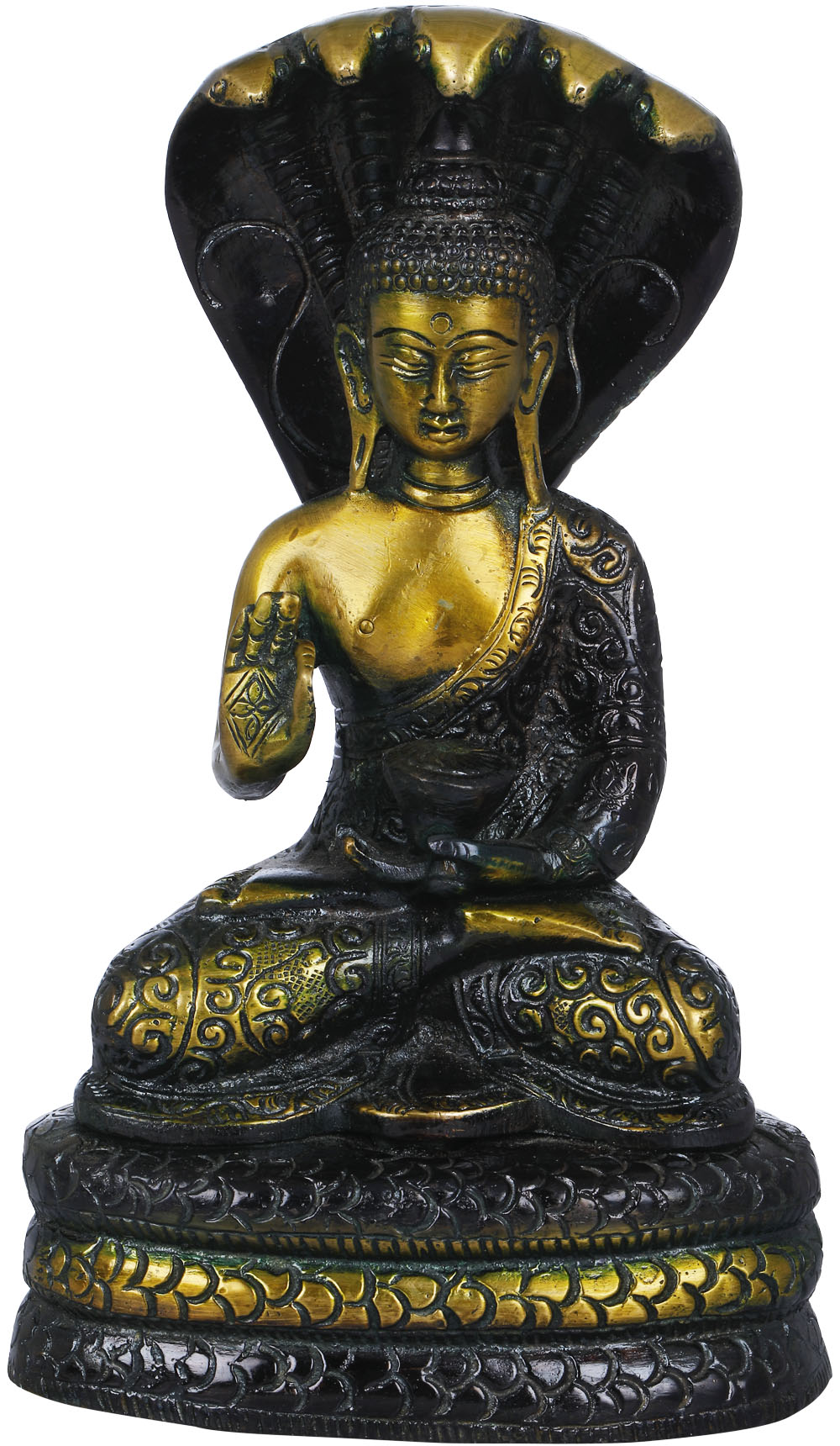According to legends, Muchalinda represents protection, transformation, and the interconnectedness of all beings. When Buddha was meditating under the Bodhi tree, a severe storm arose. In an act of compassion, Muchalinda emerged from the depths of the earth and coiled around Buddha several times, forming a protective shelter with its hood. The serpent shielded him until the storm subsided and enlightenment was attained. In this depiction, Lord Buddha (the Awakened One) sits in deep meditation with his right hand in a gesture of blessing, emanating boundless compassion. This stupendous brass creation represents Buddha’s enlightenment amidst the storm of temptation and the triumph over fear and desire, inspiring you to find inner strength and attain liberation from suffering through wisdom and compassion.