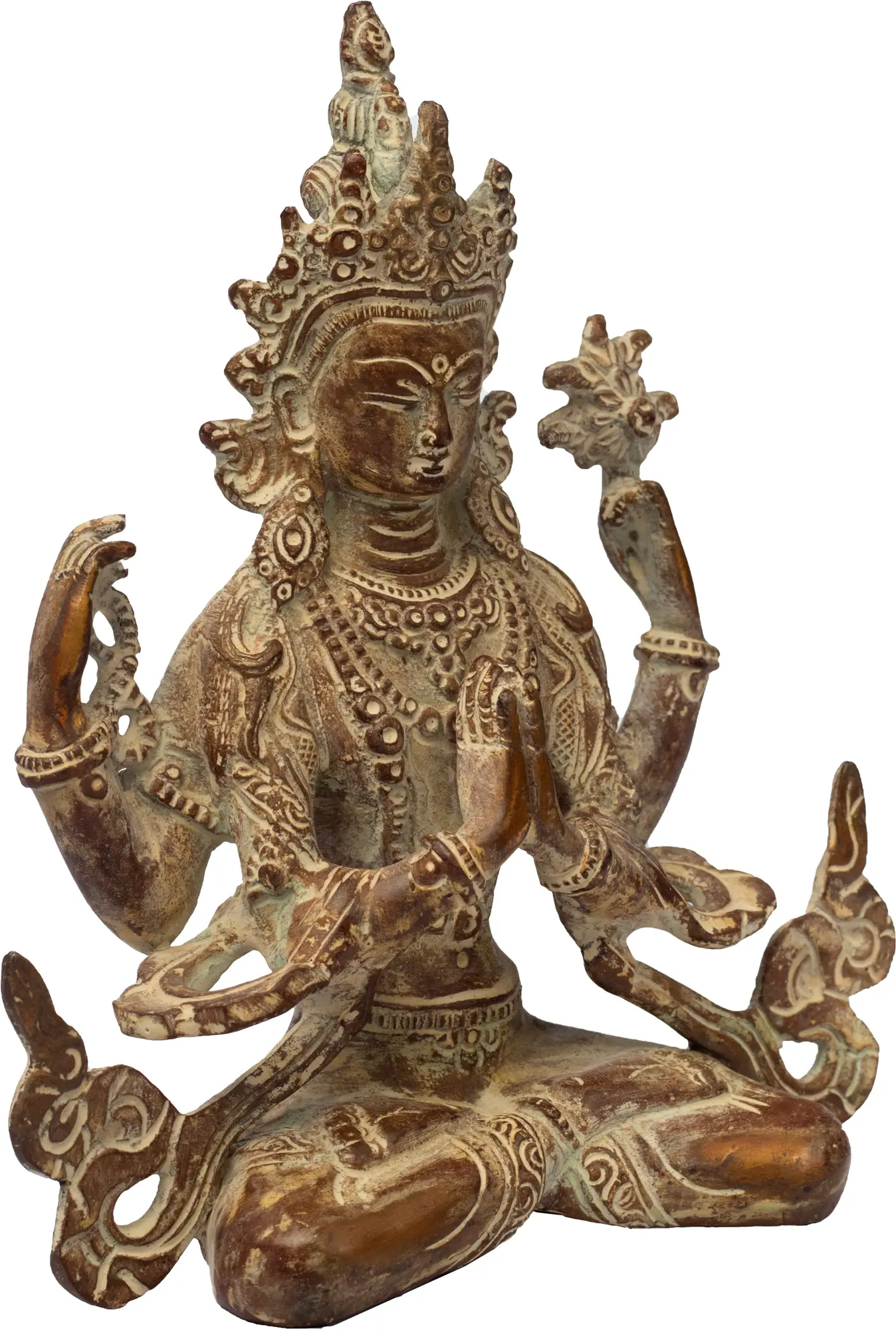 Chenrezig, also known as Avalokiteshvara, is the most revered of all Bodhisattva. He hears the cries of suffering beings and responds with boundless love and mercy. With a compassionate and serene expression, Chenrezig embodies the embodiment of boundless compassion and kindness. His four arms symbolise his ability to extend help in all directions, reaching out to alleviate suffering and guide sentient beings towards enlightenment. Two hands are clasped together in a gesture of prayer, while the other two hold a crystal rosary (Akshamala) and a lotus flower, representing purity and spiritual awakening. Crafted by skilled artisans in India, this brass artwork radiates spiritual grace and compassion.