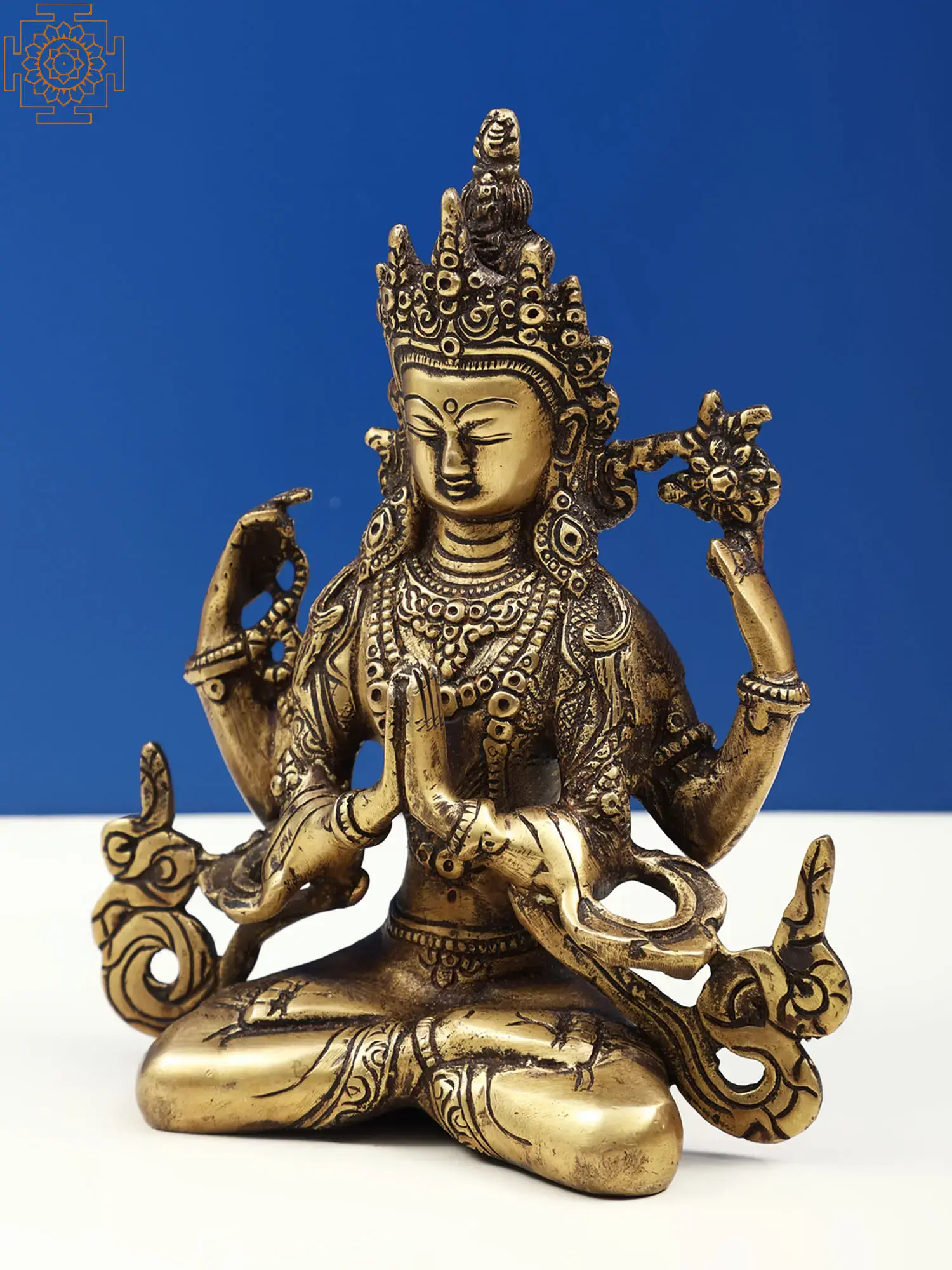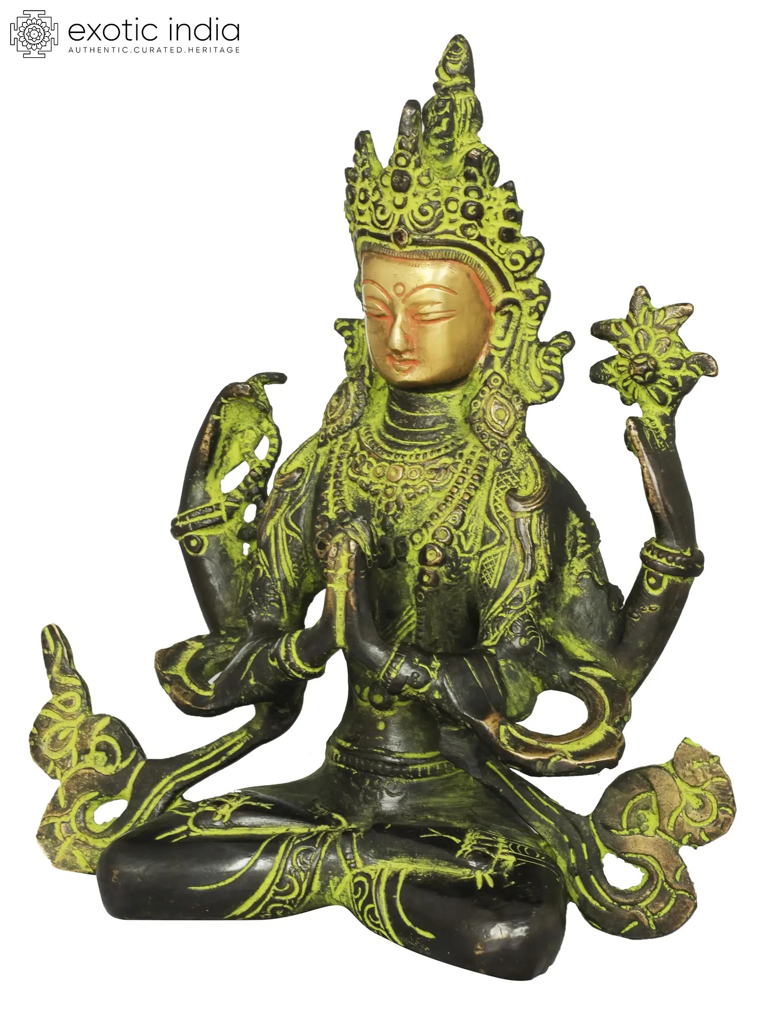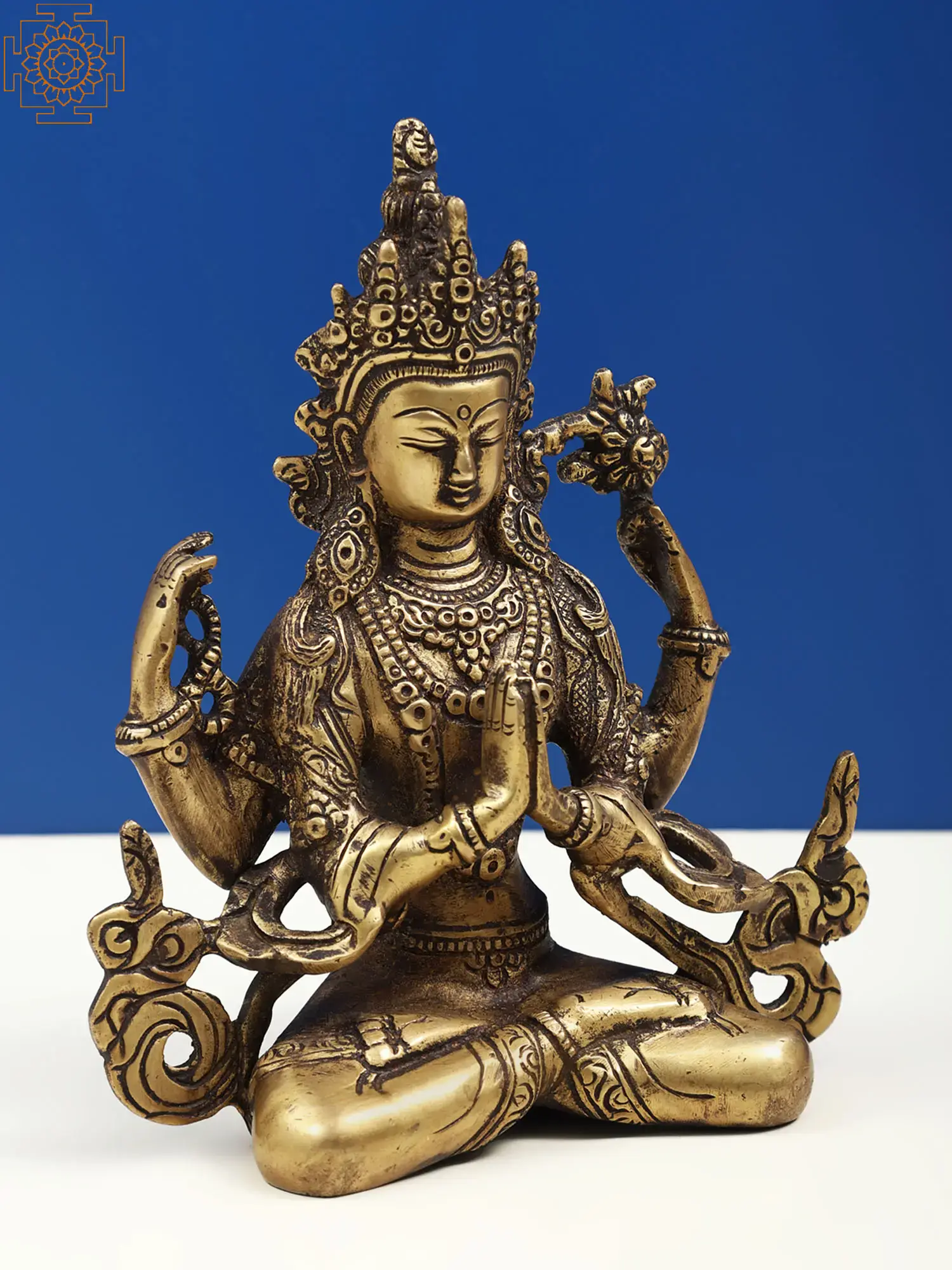 The brass sculpture embodies Chenrezig, the embodiment of compassion. With a thousand arms symbolizing boundless care, his four hands hold a rosary, lotus, crystal mala, and wish-fulfilling jewel, signifying devotion, purity, and granting of wishes. His eyes, gazing in all directions, mirror his awareness of beings' suffering. Chenrezig's compassion extends to all, offering a refuge for those lost in the samsaric sea. This artwork captures the divine empathy that guides beings towards enlightenment and liberation.