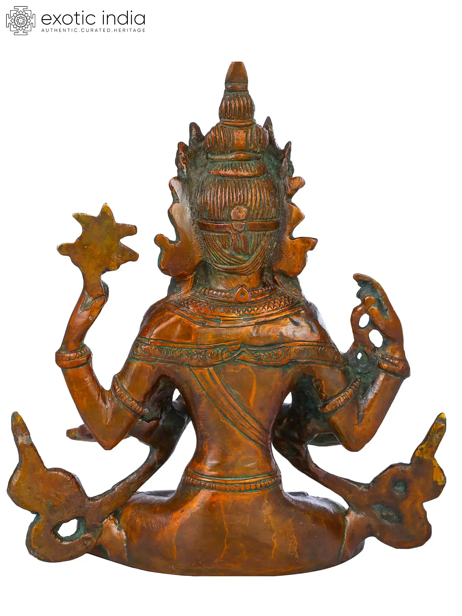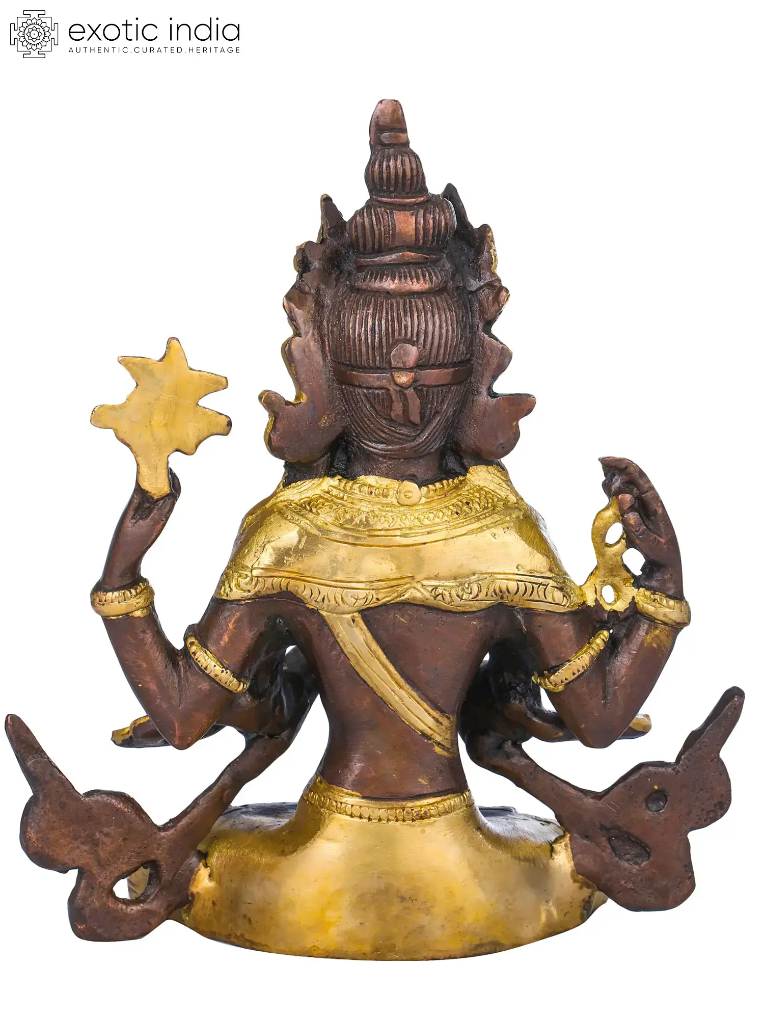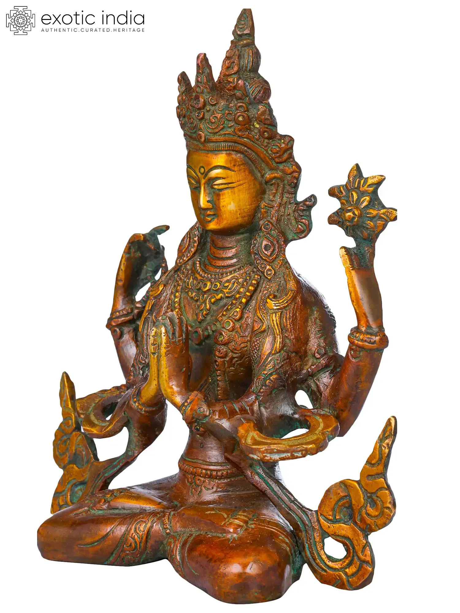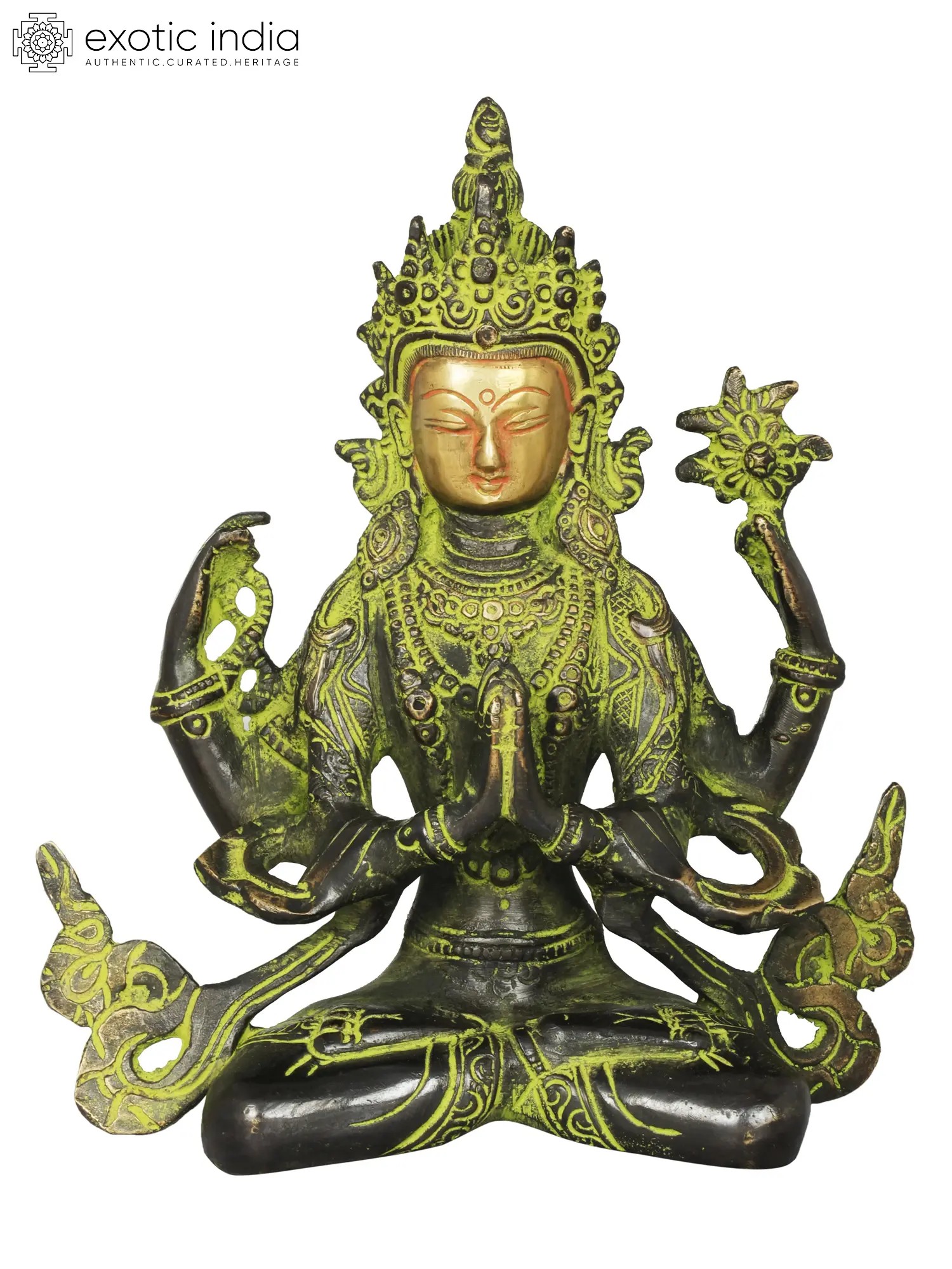 The brass sculpture embodies Chenrezig, the embodiment of compassion. With a thousand arms symbolizing boundless care, his four hands hold a rosary, lotus, crystal mala, and wish-fulfilling jewel, signifying devotion, purity, and granting of wishes. His eyes, gazing in all directions, mirror his awareness of beings' suffering. Chenrezig's compassion extends to all, offering a refuge for those lost in the samsaric sea. This artwork captures the divine empathy that guides beings towards enlightenment and liberation.