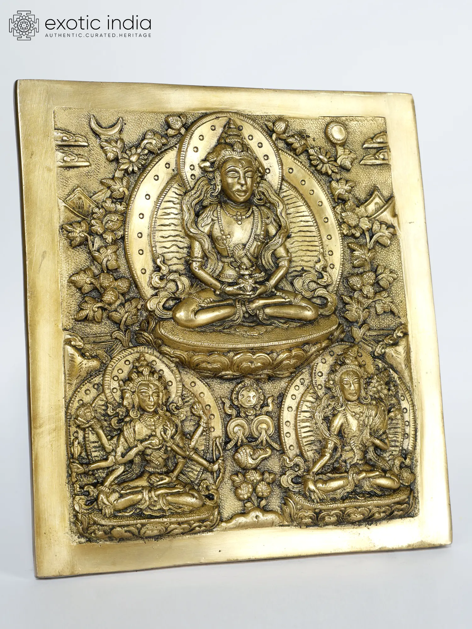 Usnisavijaya, known for her healing powers and longevity, is depicted with grace, complemented by the peaceful presence of Buddha and the compassionate aura of Tara.