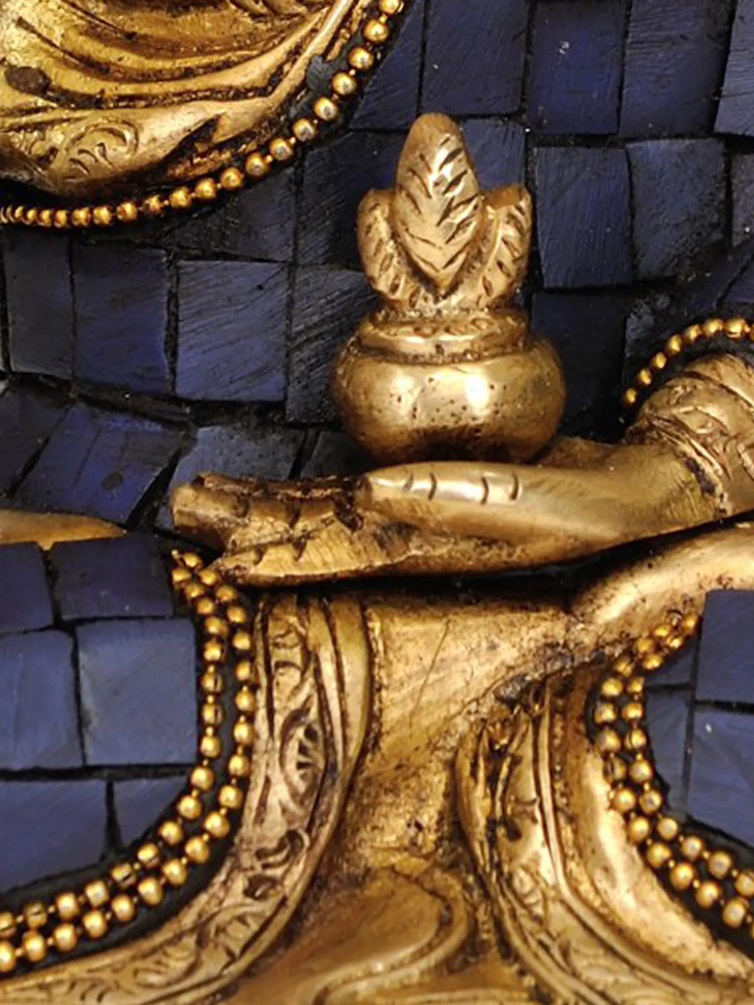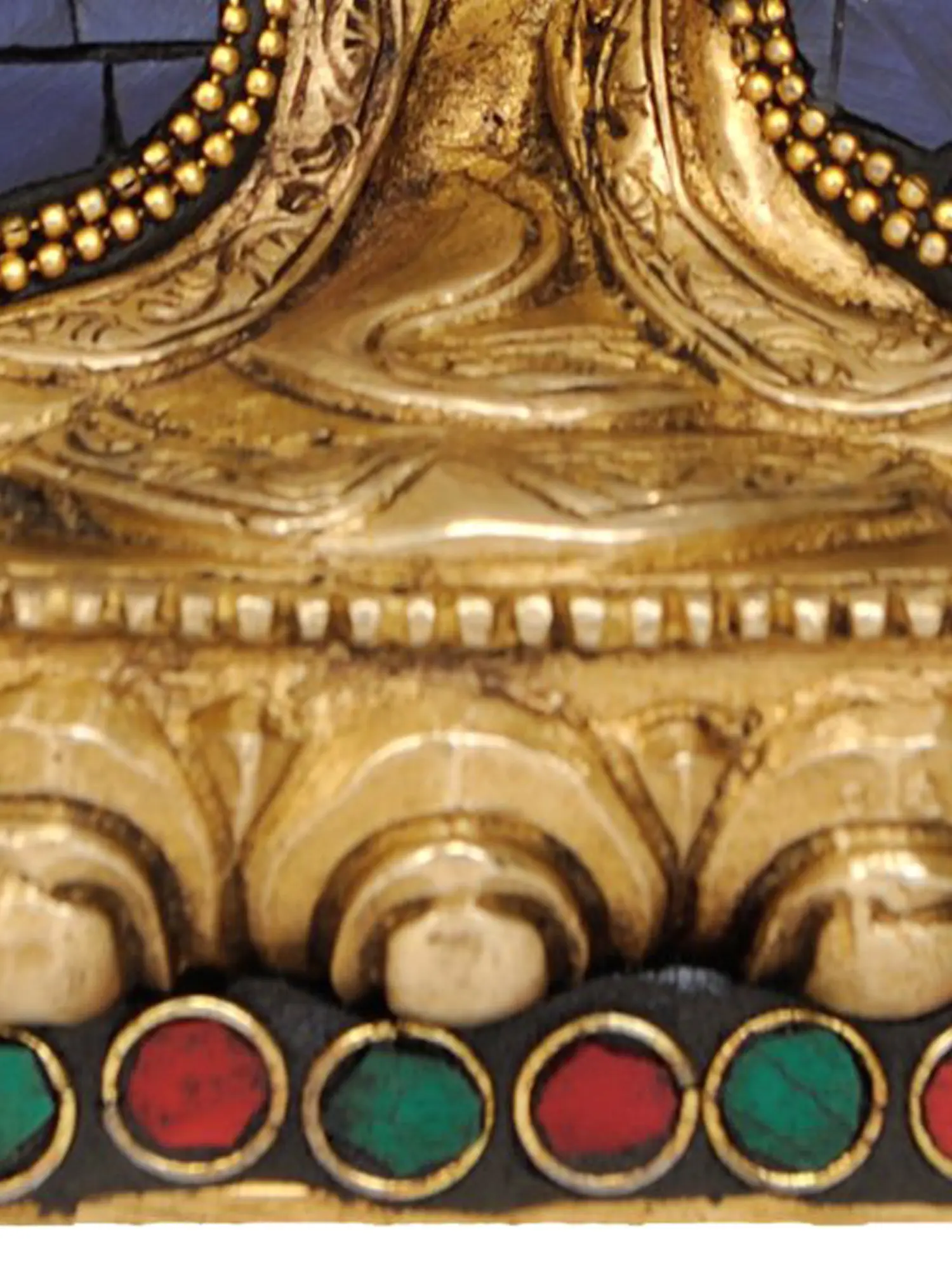 The artistry of this statue is evident in its meticulous craftsmanship and the harmonious blend of materials. Cast in brass, a metal that has long been associated with divinity and auspiciousness in many Eastern traditions, the figure radiates a warm, golden glow. The robe is adorned with vibrant inlays of lapis lazuli, a gemstone historically prized for its deep blue hue, often symbolizing the heavens and the divine. The contrasting red stones, possibly coral or carnelian, add a touch of vibrant energy and protection. These precious materials are not merely decorative; they are imbued with symbolic meaning, enhancing the sacred aura of the deity. The intricate detailing on the base, reminiscent of lotus petals, further elevates the spiritual significance, representing purity and enlightenment blooming from earthly existence.