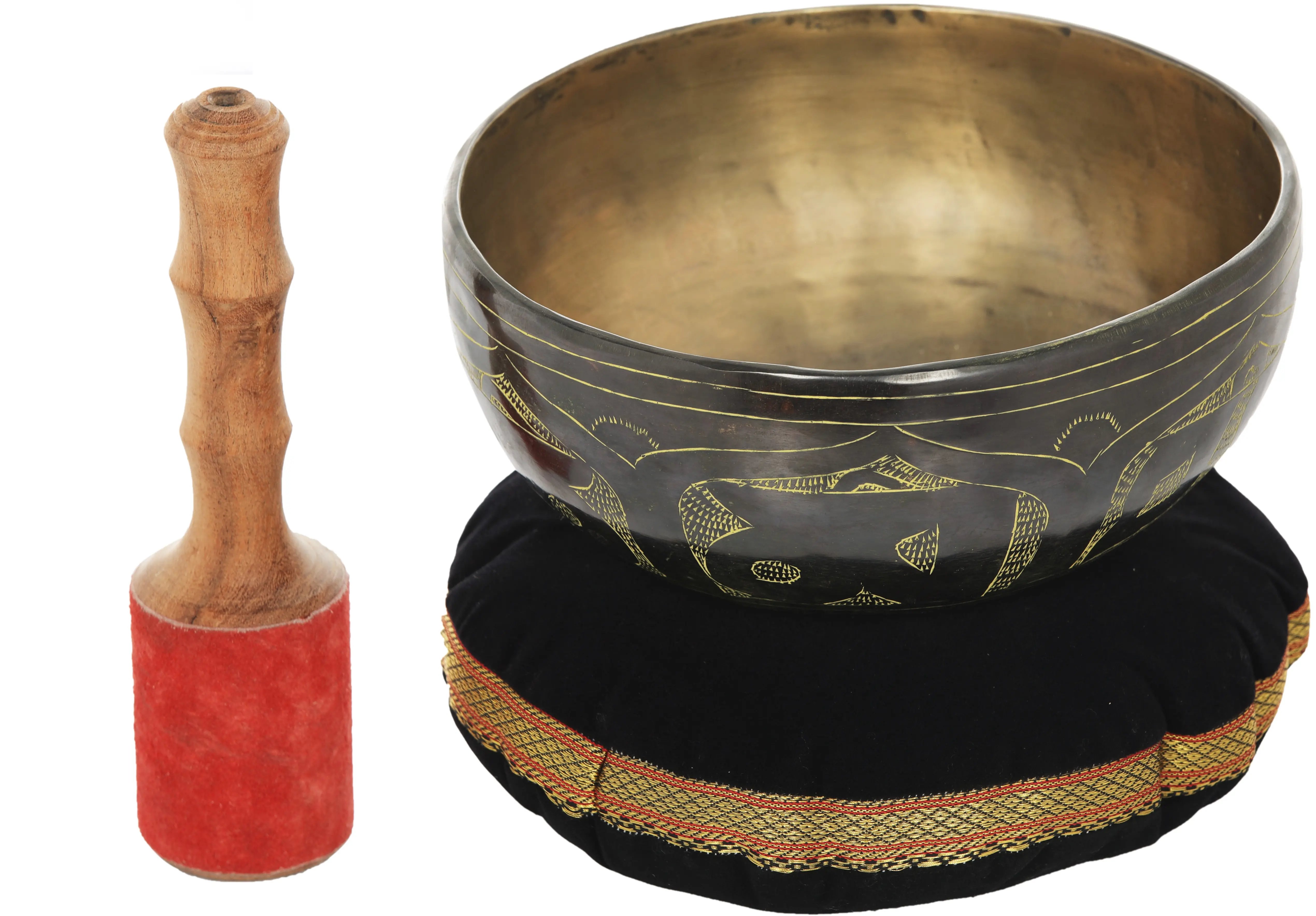 When struck with a mallet or rubbed along the rim, the singing bowl produces a rich, harmonious tone that can promote relaxation, mindfulness, and a sense of peace.