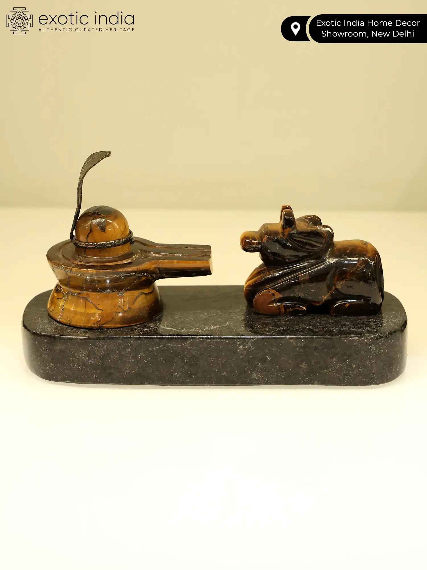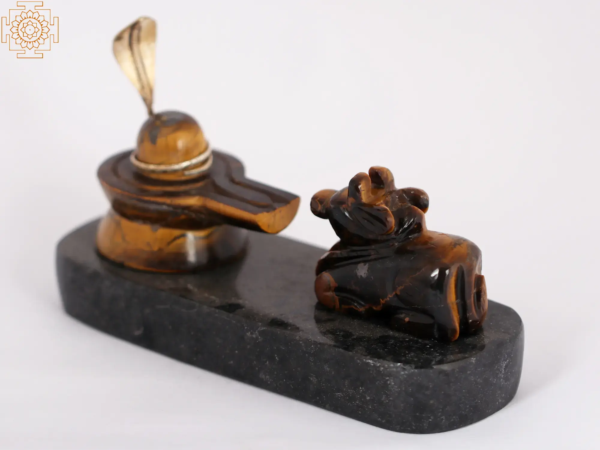 Revered as a manifestation of “Lord Shiva”, this Tiger Eye Shivalinga exudes an alluring blend of golden-brown and shimmering bands, signifying the union of masculine and feminine energies. It is venerated for its protective and grounding properties, promoting clarity and inner strength. Nandi, the faithful bull, represents unwavering devotion to Lord Shiva. Coiled around shivalinga is the Silver Sheshnaag, the king of serpent, symbolising cosmic balance and shiva’s omnipresence. This mesmerising ensemble creates a powerful spiritual ambiance, inviting reverence and contemplation among devotees.