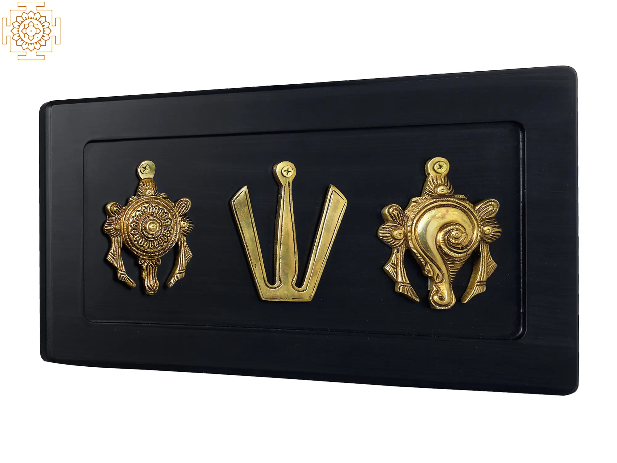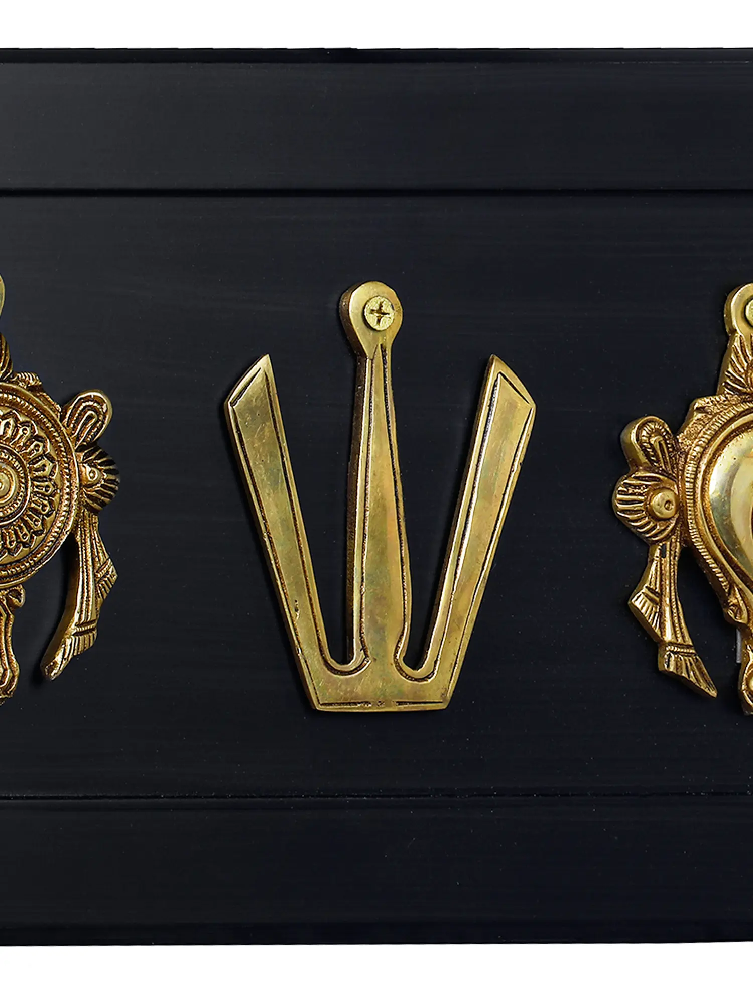 In the world of divine aesthetics, the Vaishnava Symbols emerge as radiant stars, casting an enchanting spell upon the beholder. Crafted in brass and adorned by the warm embrace of wood, this wall hanging creation exudes an aura of spiritual reverence. The Discus, known as the “Sudarshana Chakra”, gleams with cosmic power, while the “Urdhva Pundra” adorns with its upward-reaching crescent, symbolising transcendence. The “Conch Shell”, an eternal melody of creation, whispers its eternal hymn. Together, they form a sacred triad, a visual mantra that beckons the soul to embark on a mystical journey, enticing the senses with their ethereal beauty.