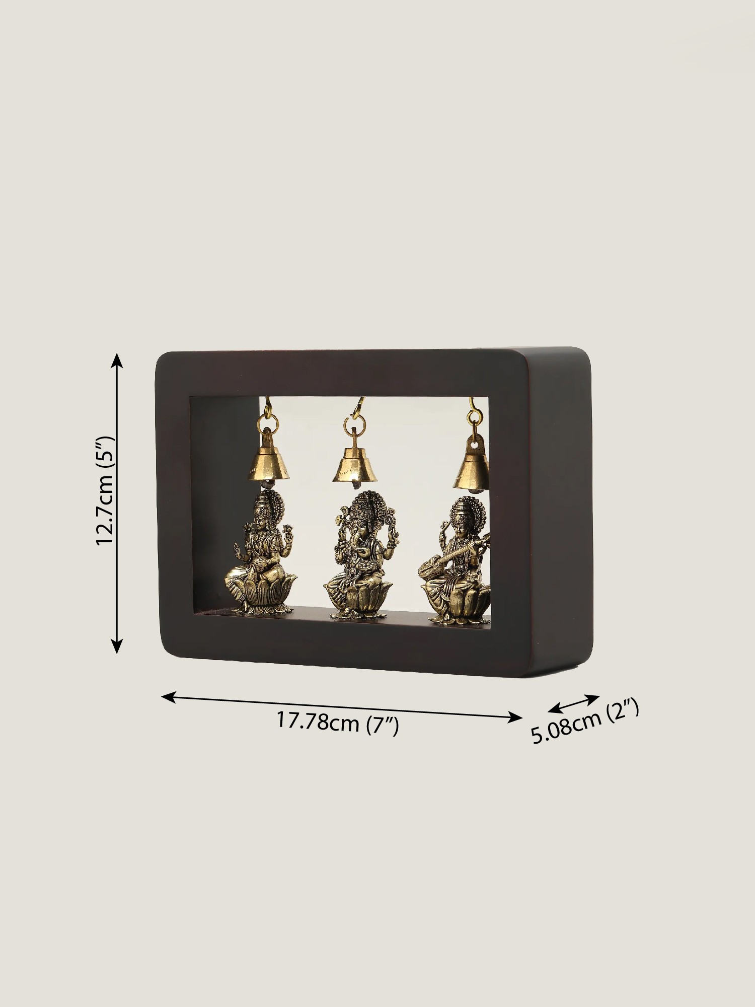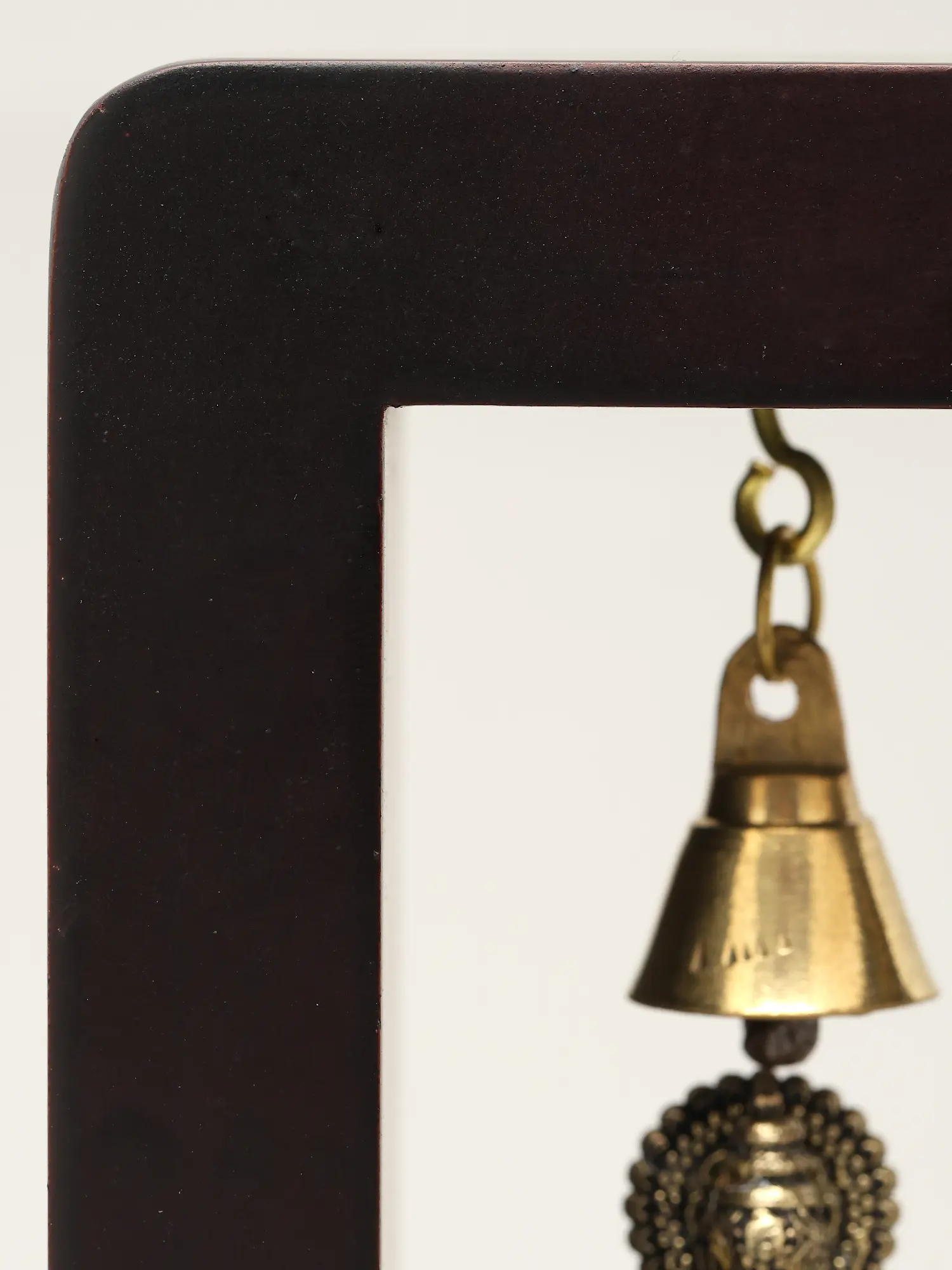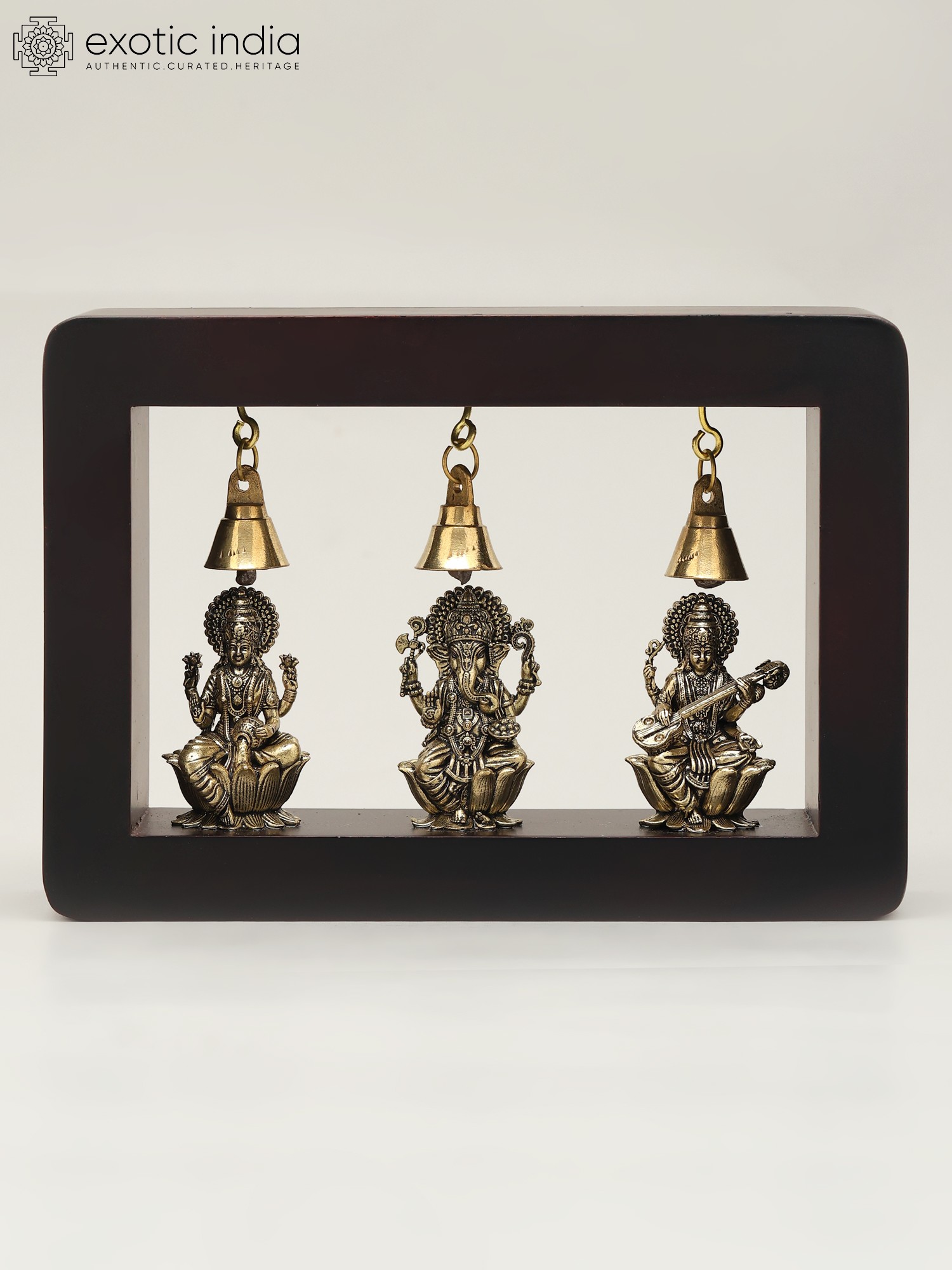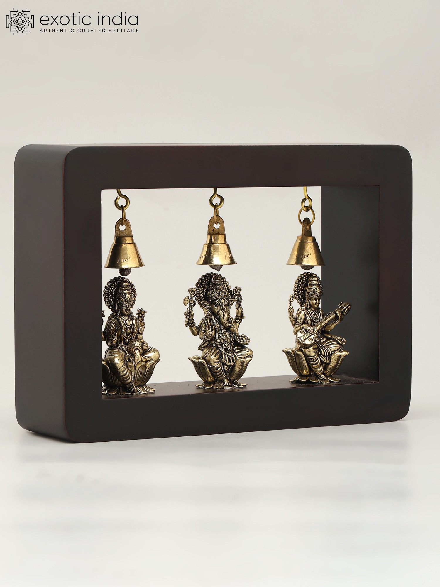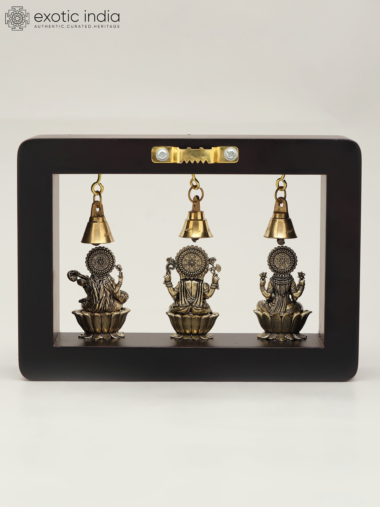 12" Superfine Sitting Lakshmi Ganesha with Dangling Bells | Wood Framed Brass Sculptures | Wall Hanging