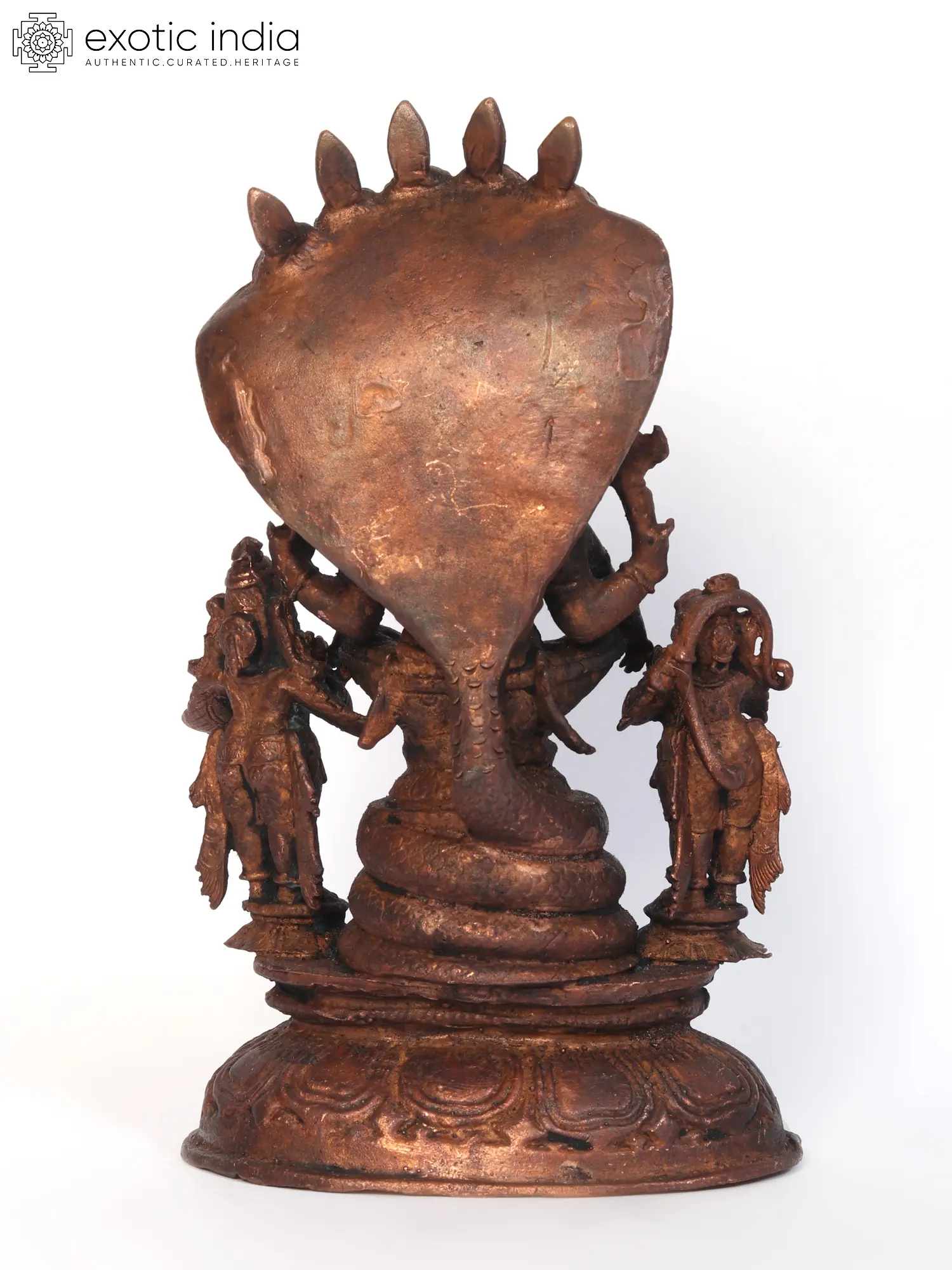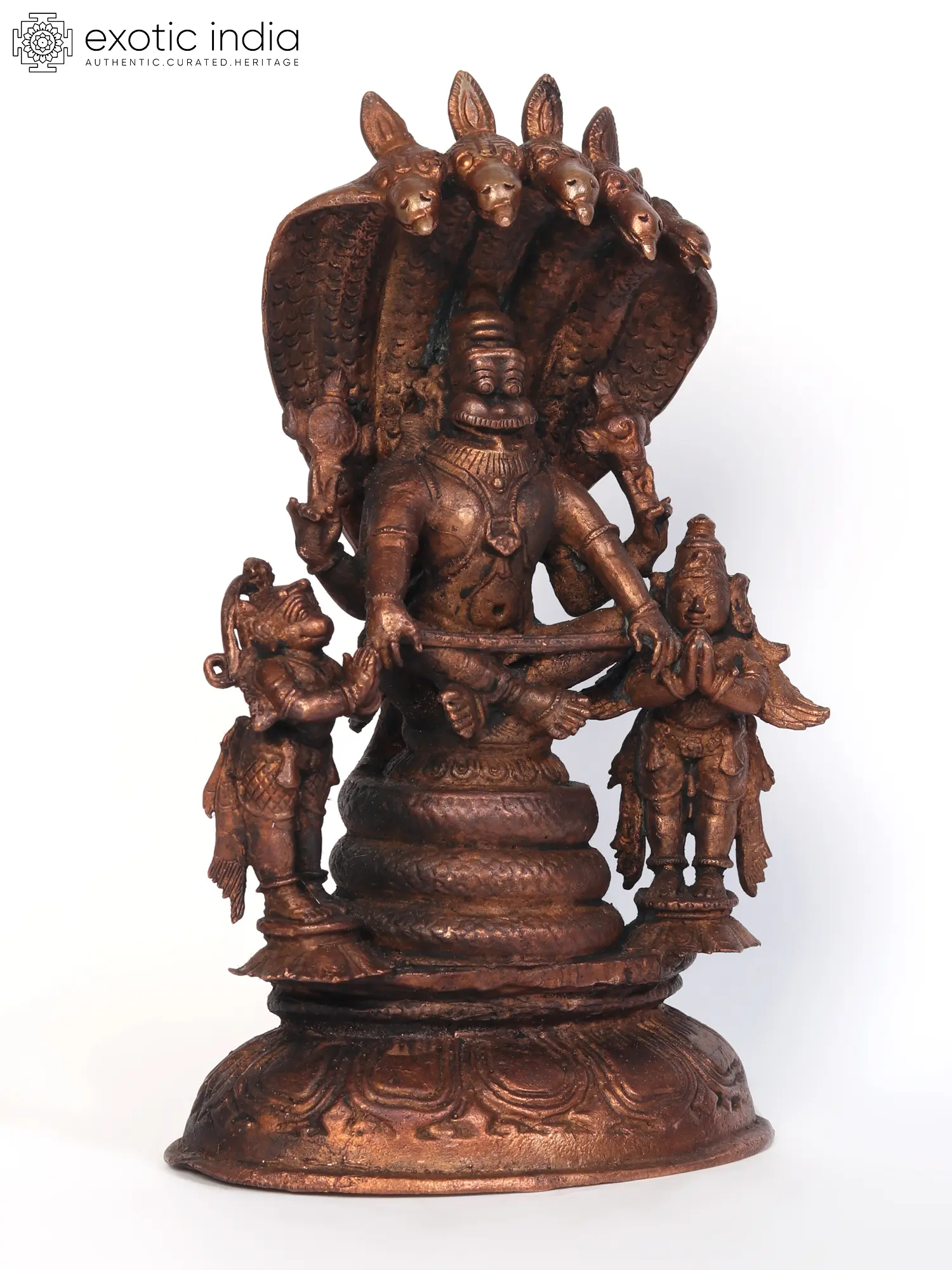 This is a Yoga Narasimha Copper Statue where Lord Narasimha sits on Sheshnag alongside the Garuda and Hanuman statues. Yoga Narasimha assumes the meditation stance (Yogasana) while wearing a belt (Yogapatta) to support the legs. This form of seat is also known as Utkutika Asana. All Narasimha forms have lion-like features, including a mane on the sides, an open mouth, and visible teeth. The rear arms carry the features of Shankha (conch shell), Chakra (wheel), and Vishnu.