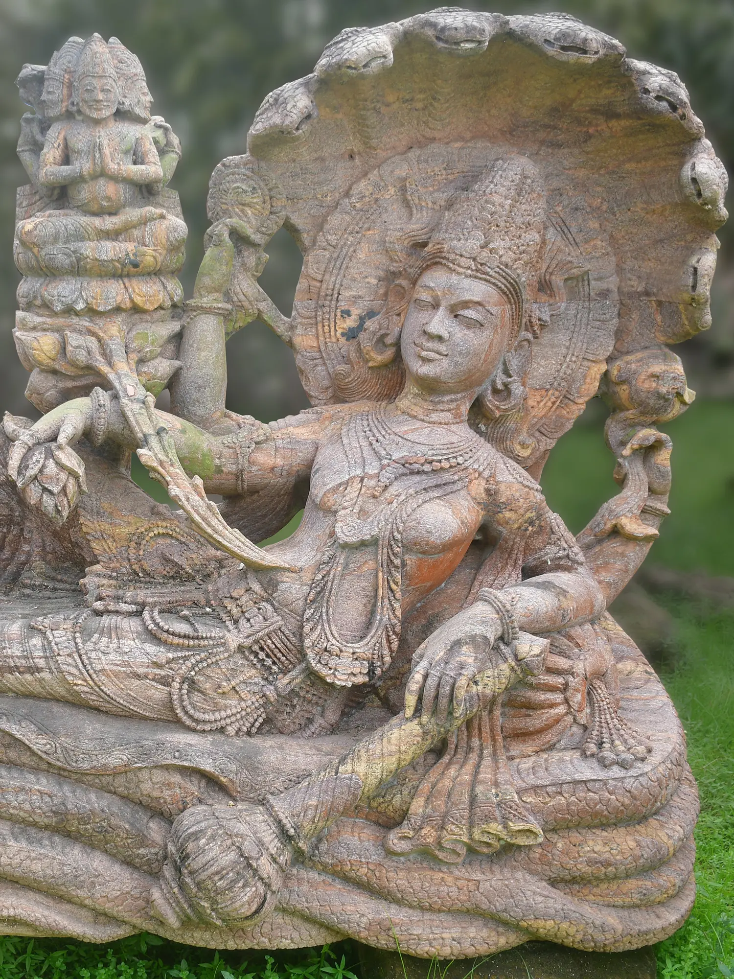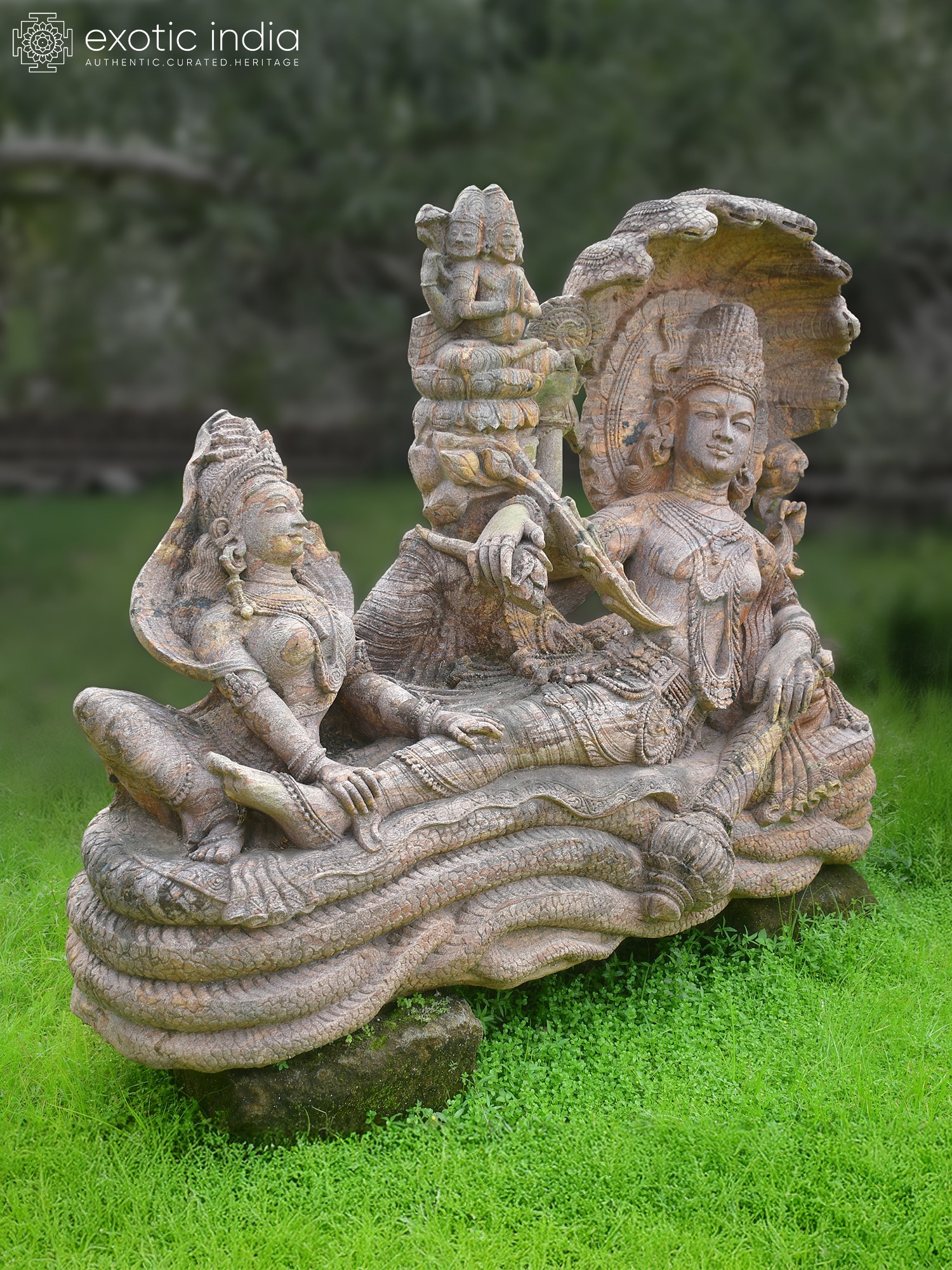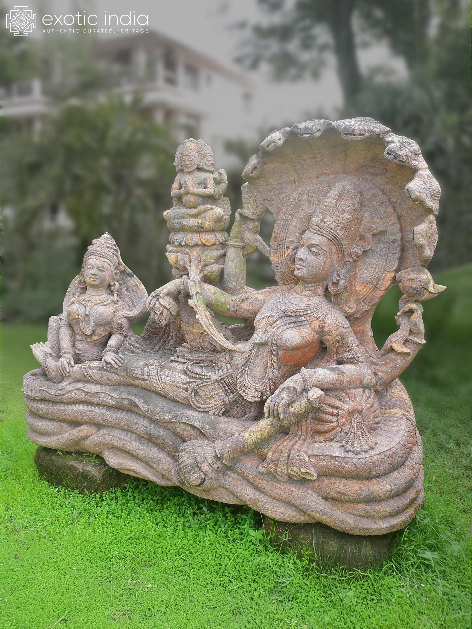 Crafted by skilled artisans from the finest Orissa sandstone, this piece is a testament to traditional Indian sculpting techniques. Each detail, from the intricate drapery of the divine form to the powerful coils of the cosmic serpent, is meticulously rendered by hand. The natural variations in the sandstone lend a unique character and an earthy, timeless feel to the sculpture, ensuring its individual beauty.