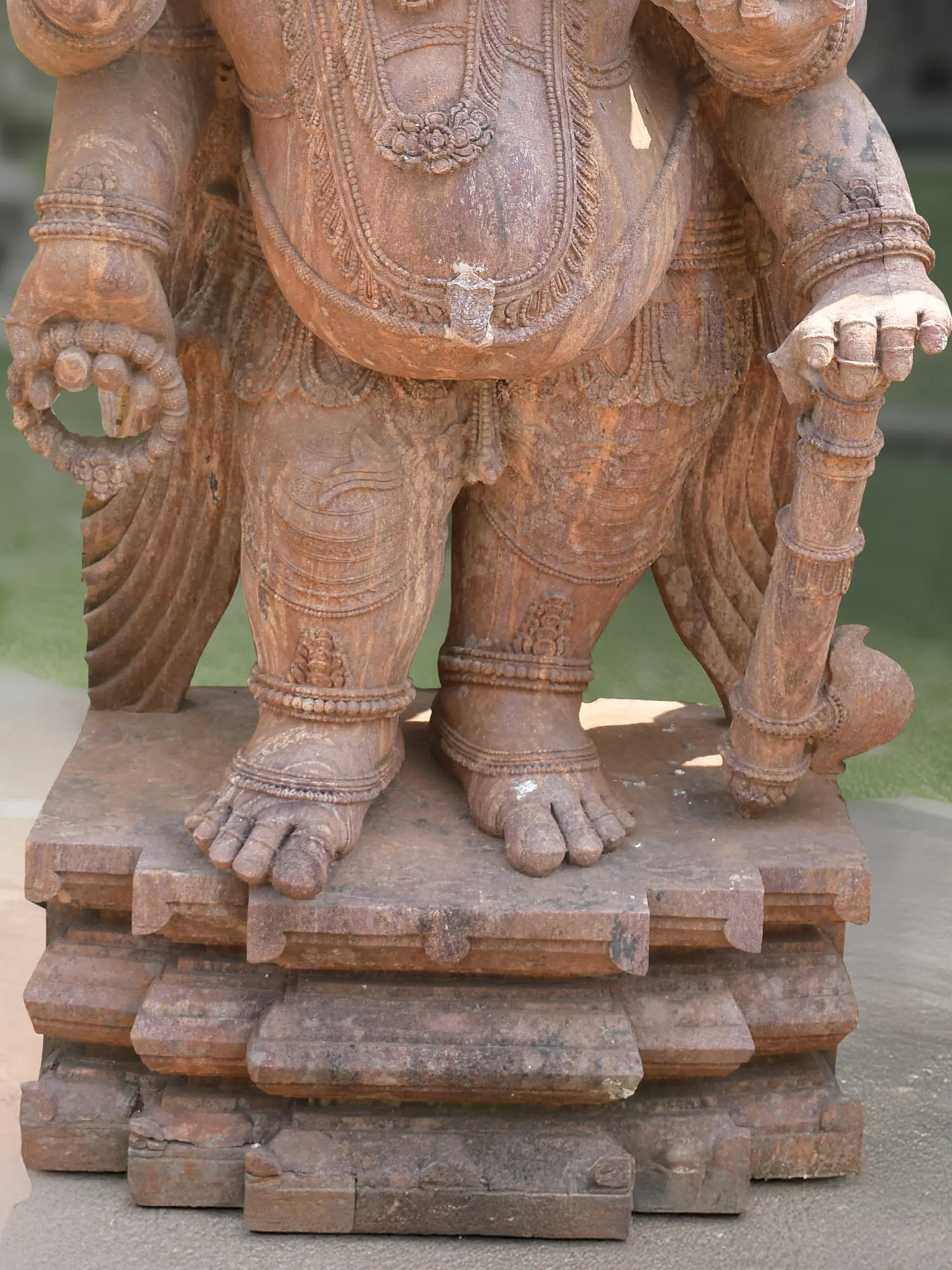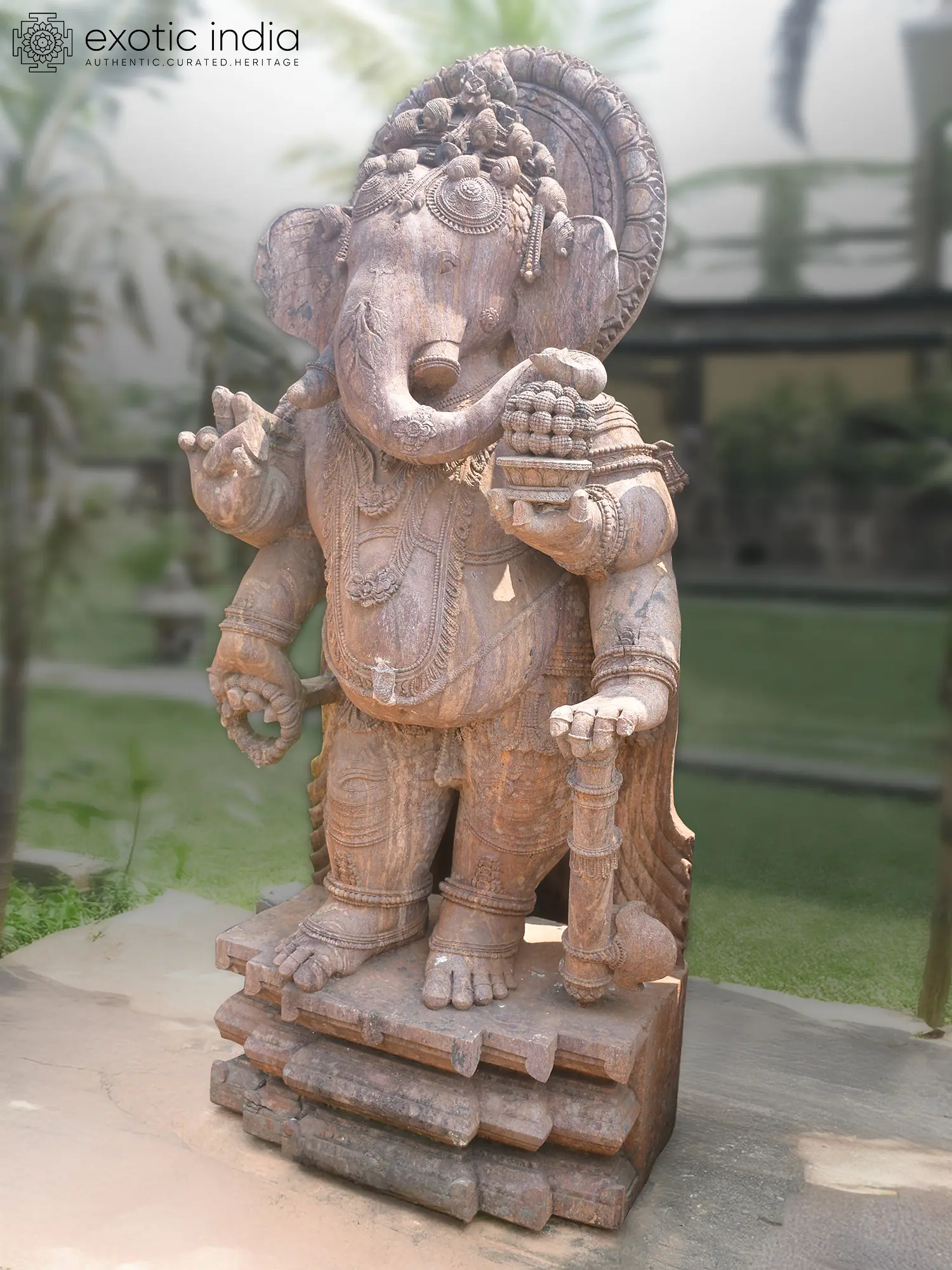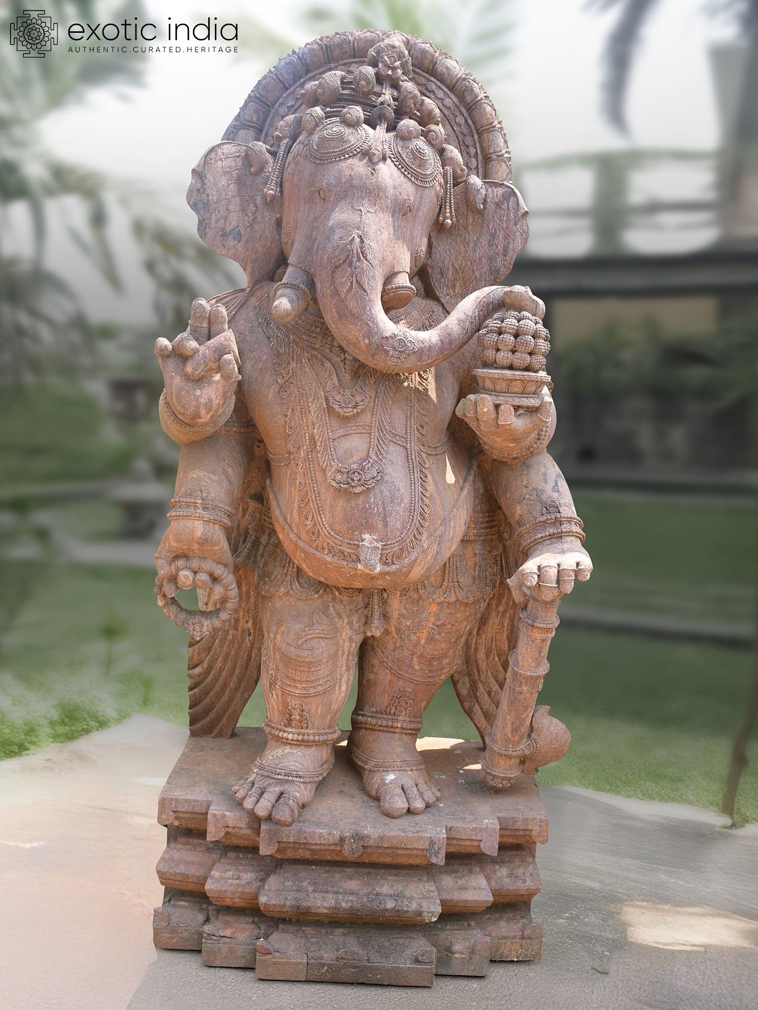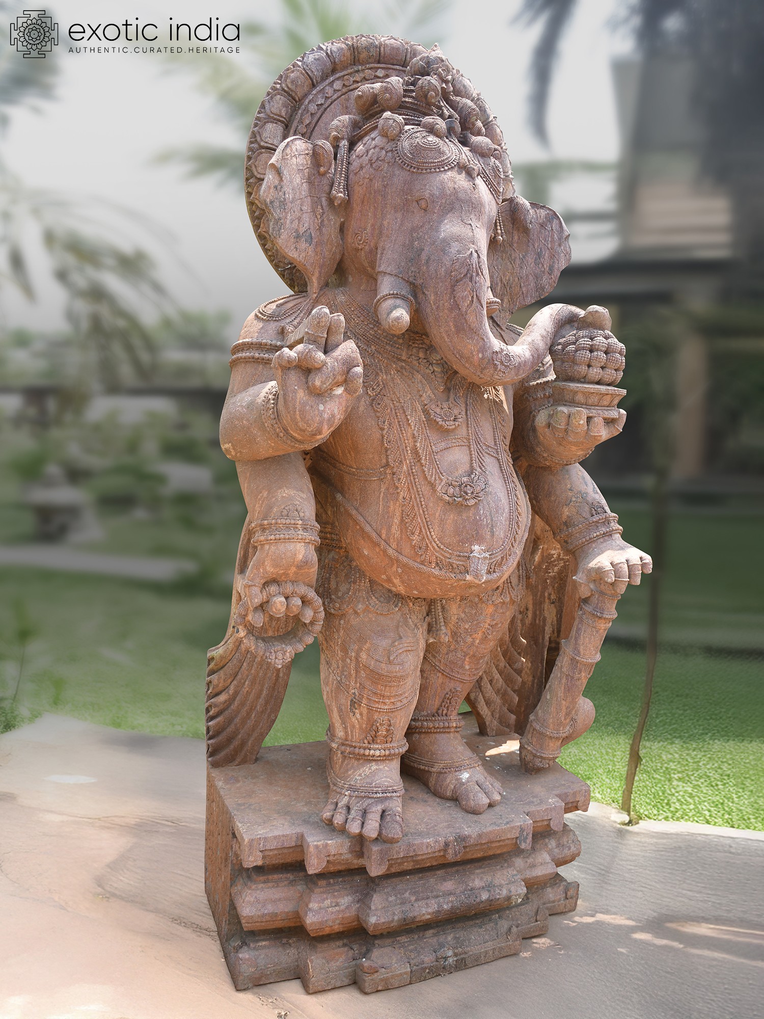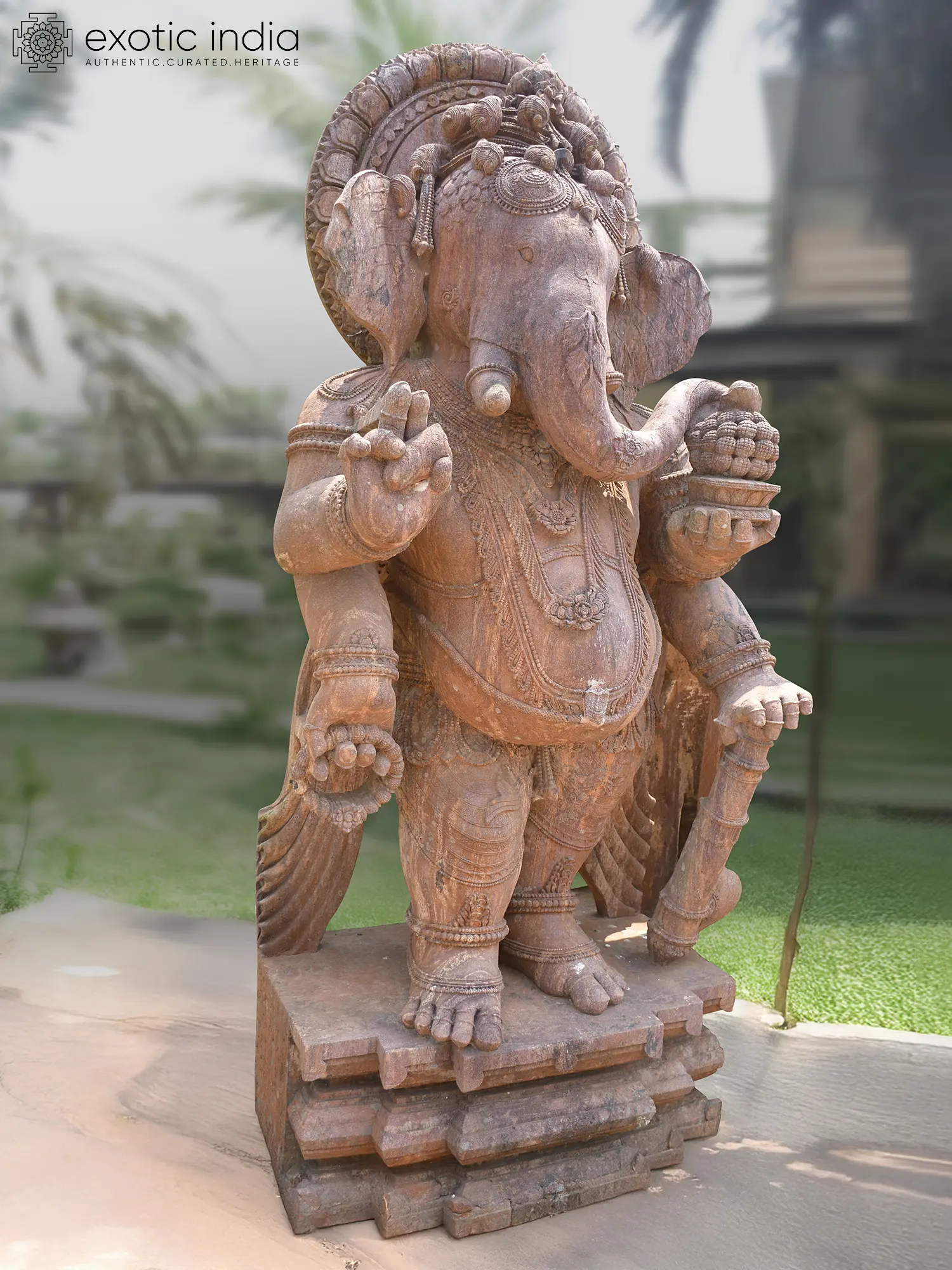 Standing seventy inches tall, this imposing depiction showcases Lord Ganesha in his Chaturbhuj form, signifying his four arms, each bearing a symbol of his power and benevolence. One hand is raised in blessing, while another cradles a modak, his favorite sweet, representing abundance and reward. The detailed ornamentation, from the ornate headdress to the textured garments and jewelry, showcases an exceptional level of craftsmanship. The artist's keen eye for detail is evident in the delicate rendering of each finger and the intricate patterns adorning the divine form, making it a true masterpiece of Indian sculptural art.