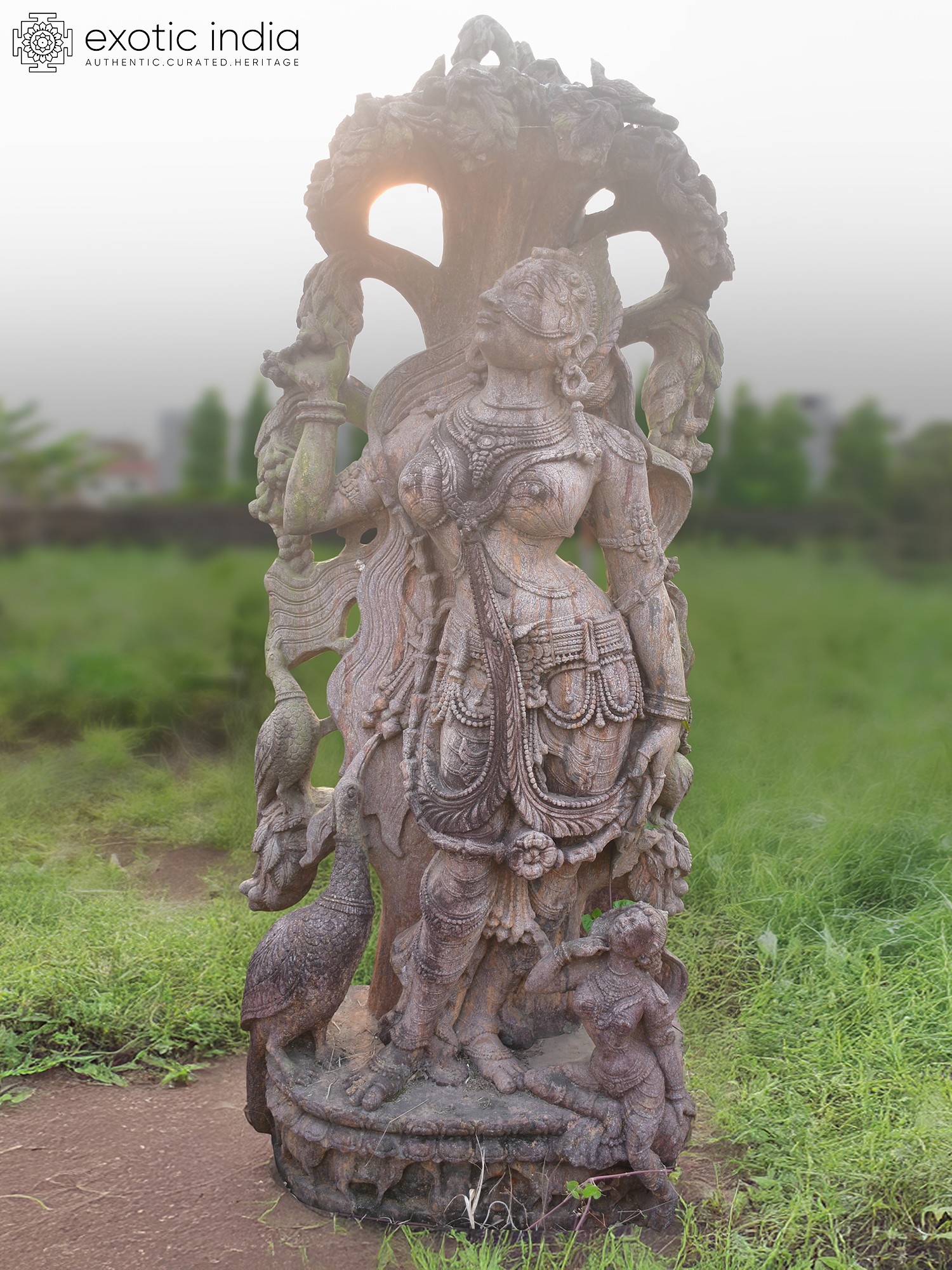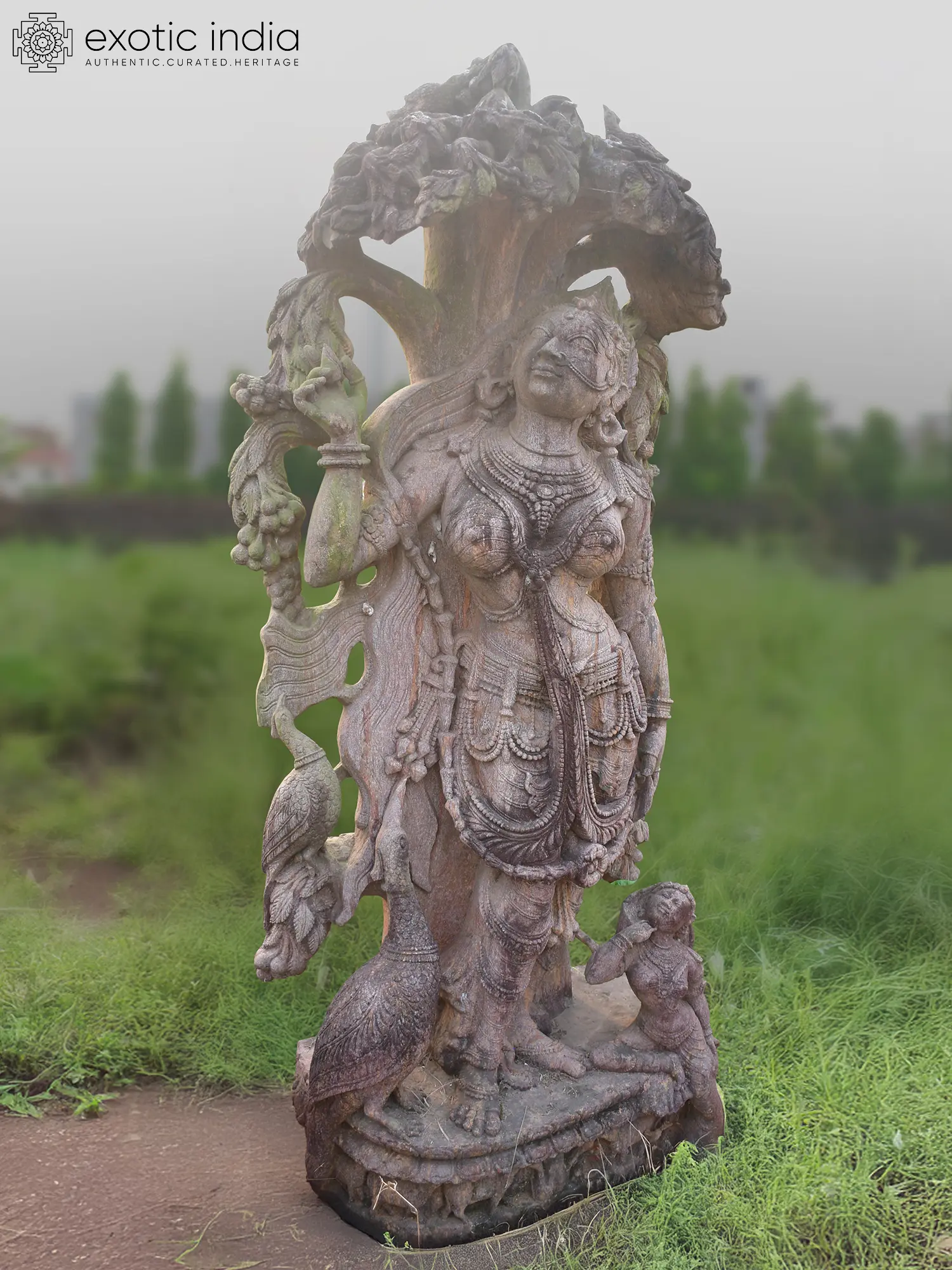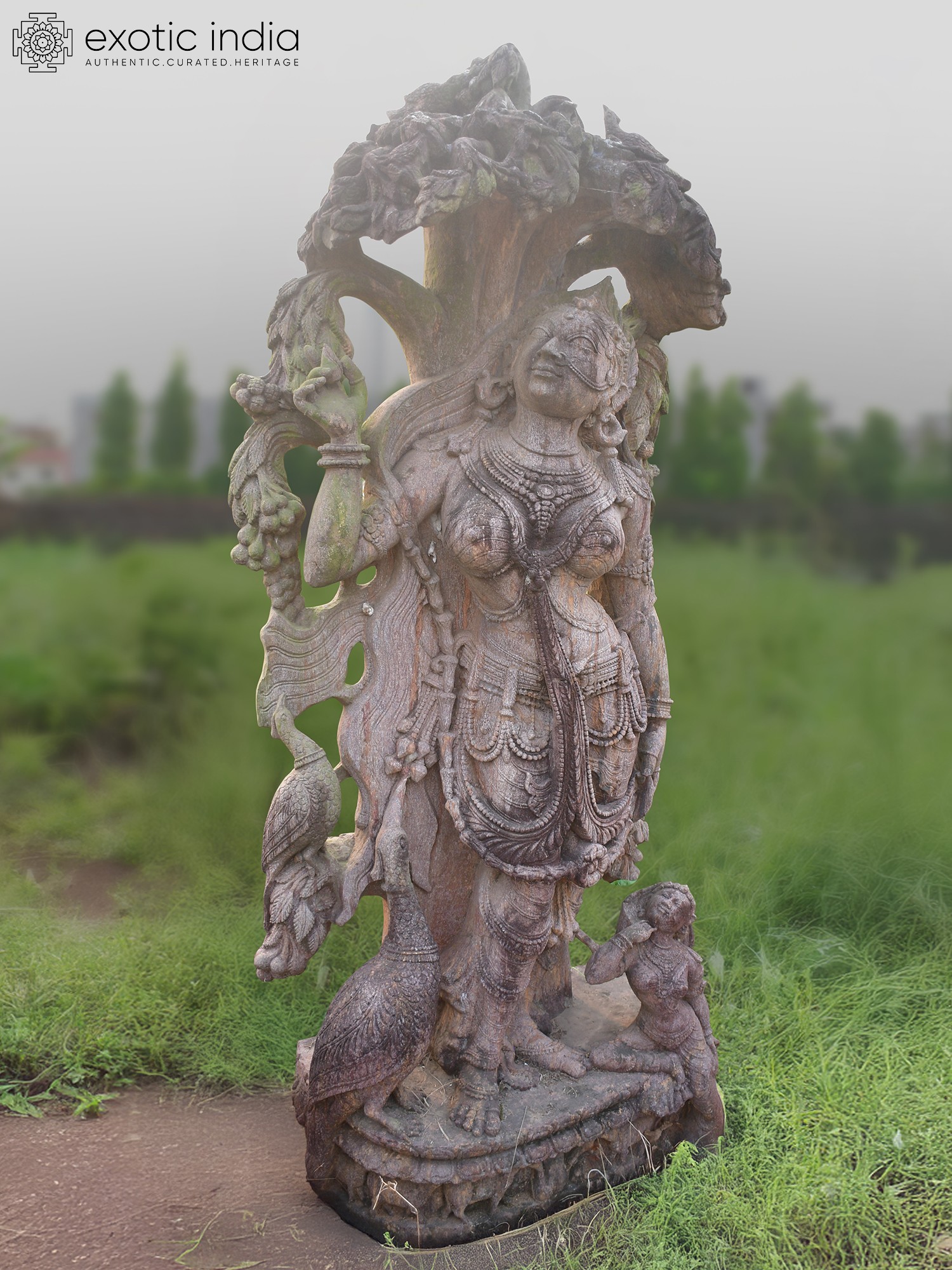 Observe the intricate drapery that seems to flow with an unseen breeze, the delicate ornamentation adorning the figure, and the captivating expression that speaks of celestial serenity. The sheer scale, standing seventy-two inches tall, commands attention, while the subtle texture of the sandstone lends an organic, weathered charm. You'll appreciate the subtle interplay of light and shadow across the meticulously rendered form, highlighting the depth and complexity of the carving. The accompanying figures, a proud peacock and a smaller attendant, further enrich the narrative and visual appeal, adding layers of symbolism and artistry to its imposing presence.