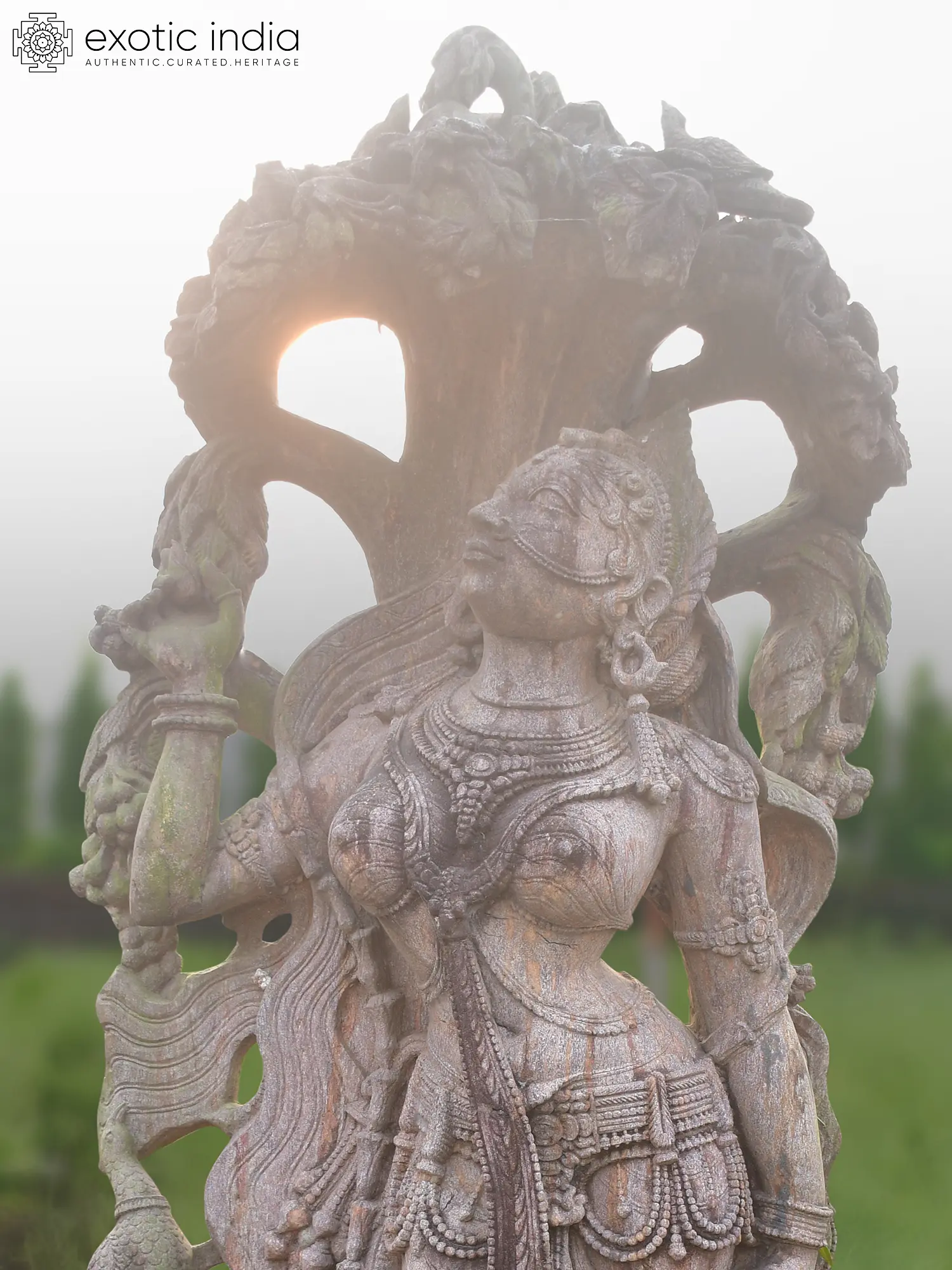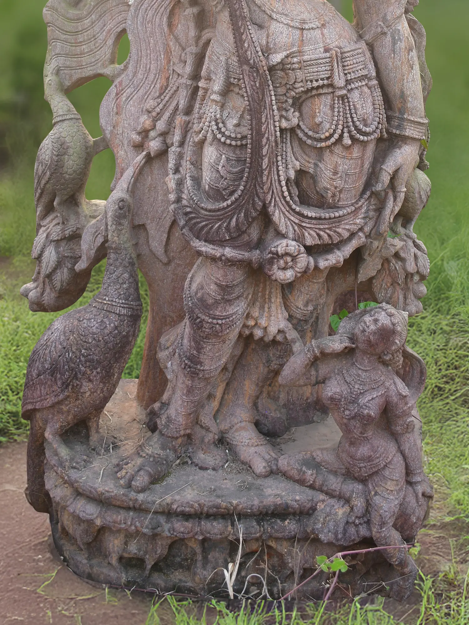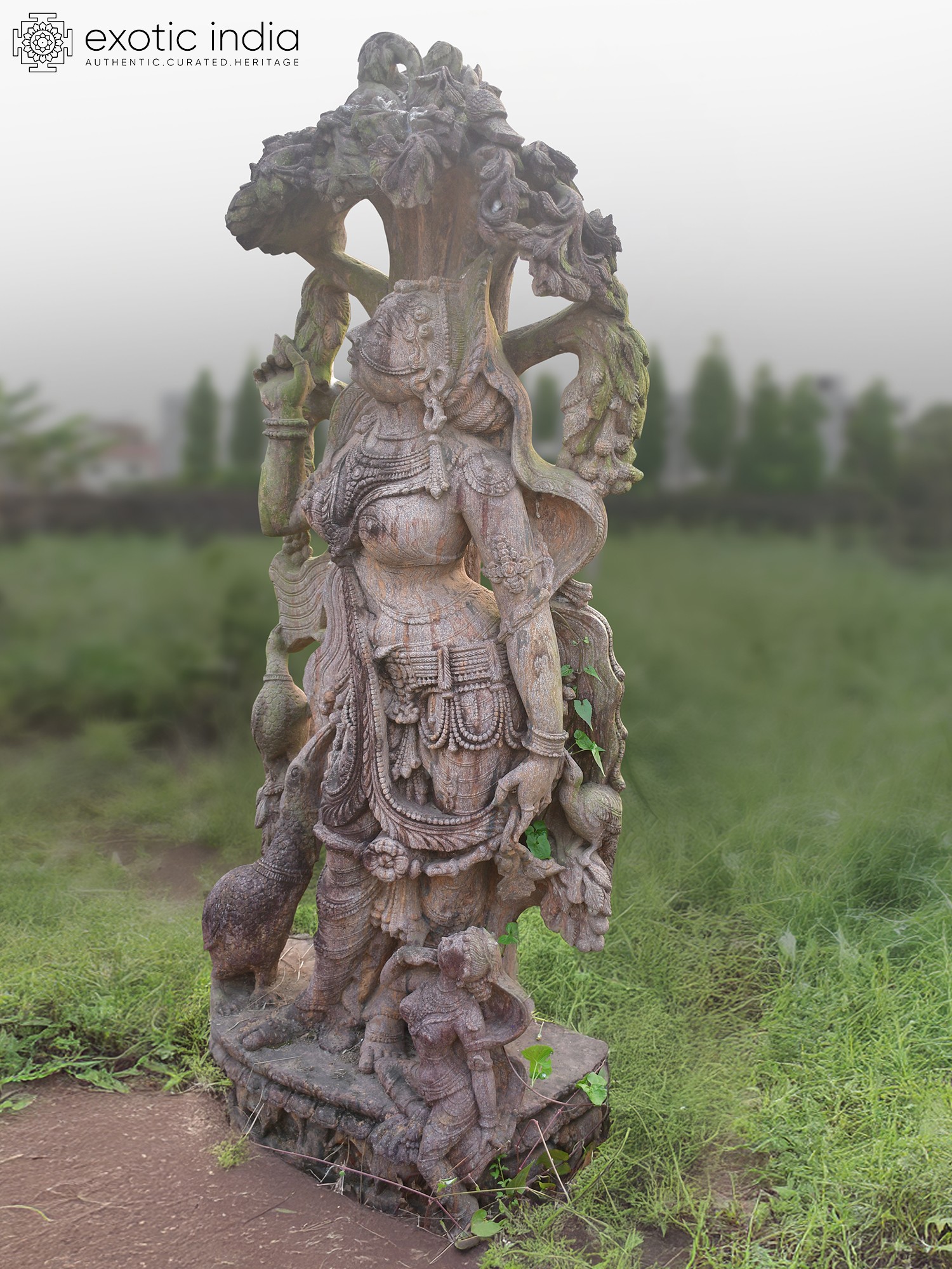Observe the intricate drapery that seems to flow with an unseen breeze, the delicate ornamentation adorning the figure, and the captivating expression that speaks of celestial serenity. The sheer scale, standing seventy-two inches tall, commands attention, while the subtle texture of the sandstone lends an organic, weathered charm. You'll appreciate the subtle interplay of light and shadow across the meticulously rendered form, highlighting the depth and complexity of the carving. The accompanying figures, a proud peacock and a smaller attendant, further enrich the narrative and visual appeal, adding layers of symbolism and artistry to its imposing presence.