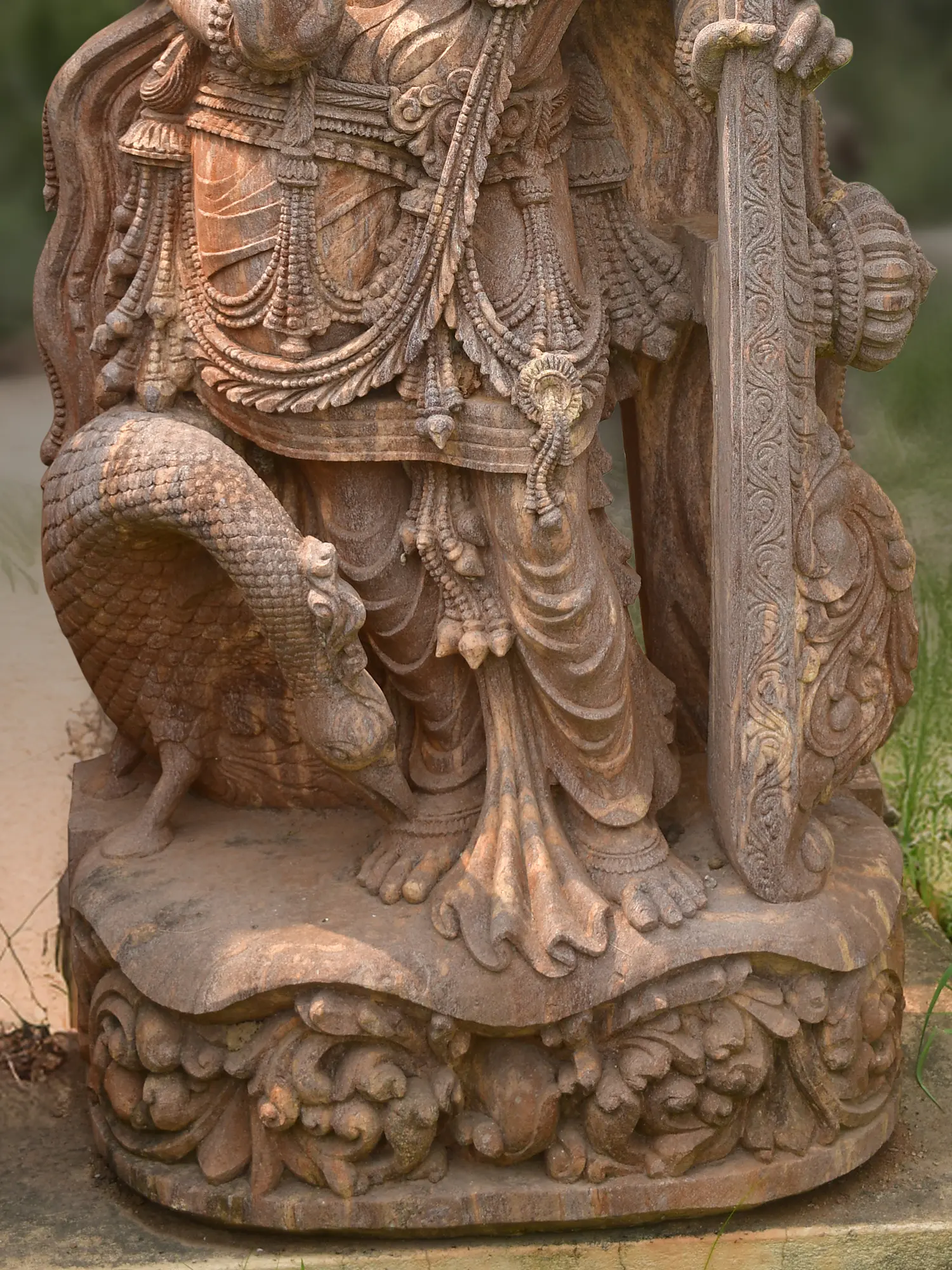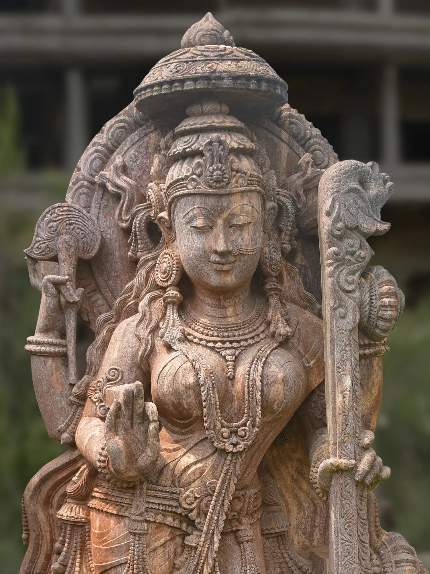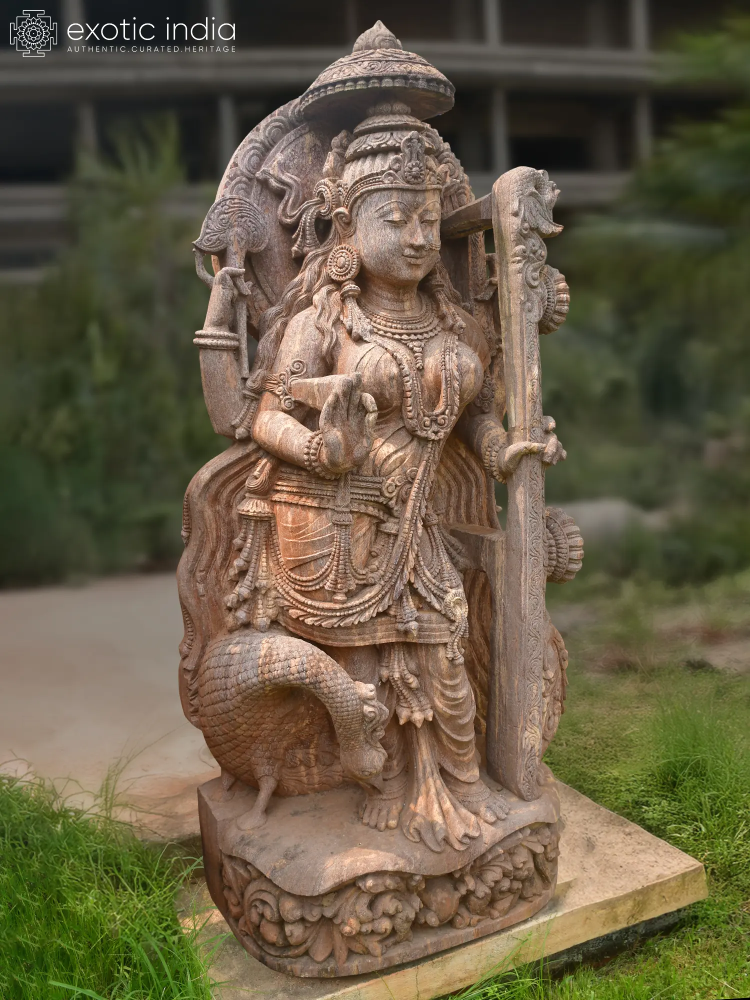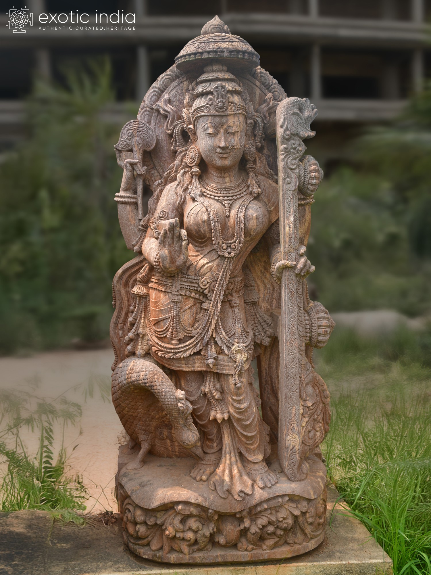 This commanding figure stands at an impressive height, drawing the eye with its graceful posture and multi-armed composition, each hand holding symbolic objects. The central motif is the divine instrument, the veena, signifying the goddess's mastery over music and the arts, while a serpent coiled at her base represents primordial energy and cosmic consciousness. You'll observe the rich ornamentation, the finely etched patterns on the fabric, and the serene, almost ethereal, facial features that capture a timeless beauty. The overall presence is one of profound tranquility and divine power, enhanced by the warm, natural hues of the sandstone.