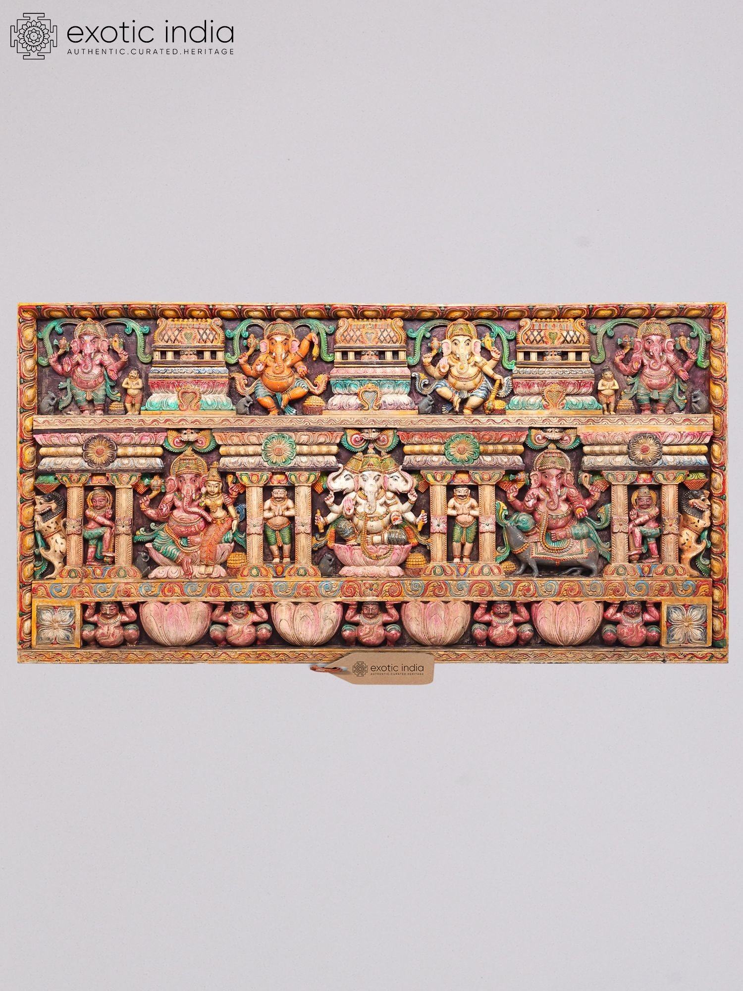 Features Lord Ganesha depicted in several distinct forms across a grand 72-inch wood panel.
