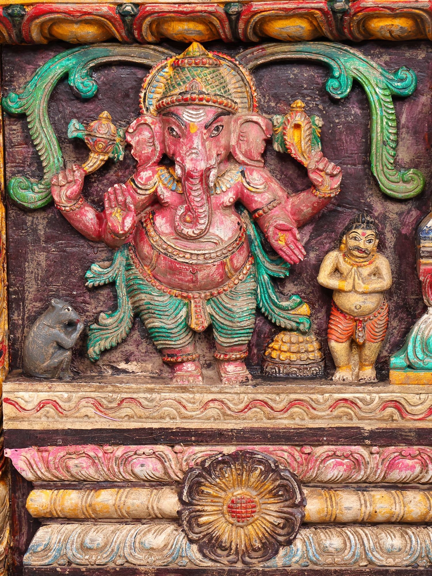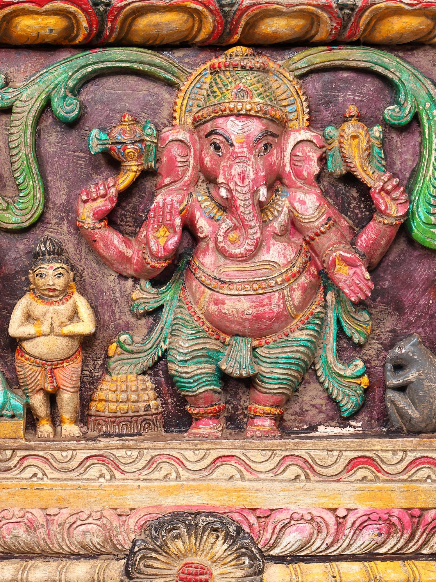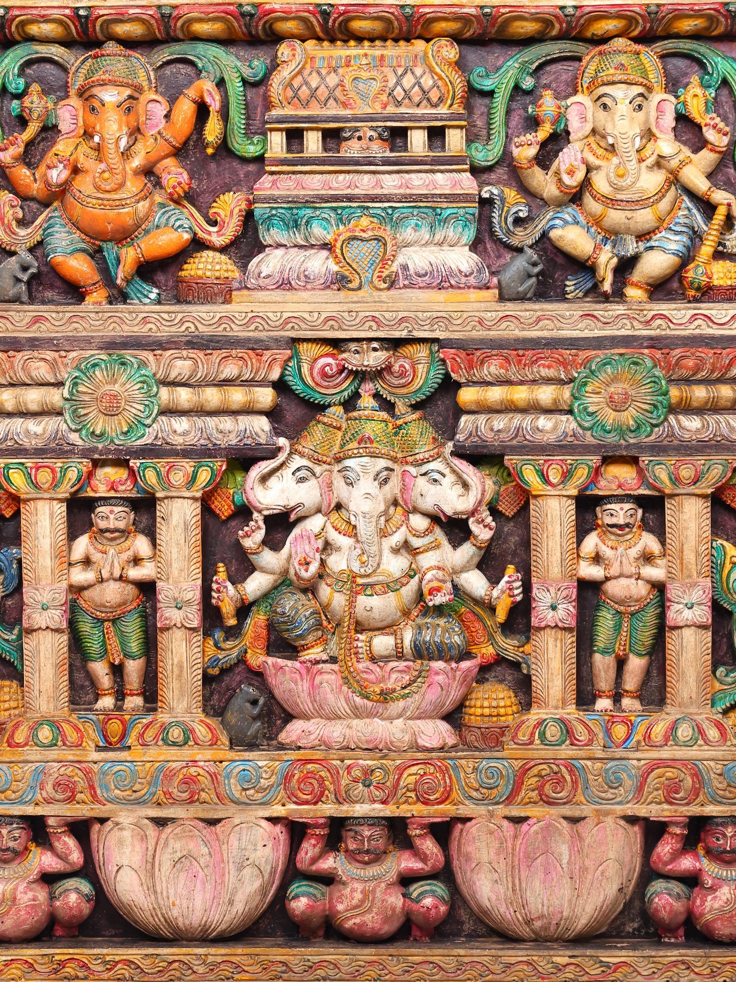 Intricately carved wooden wall art showcasing the elephant-headed deity in various iconic poses.