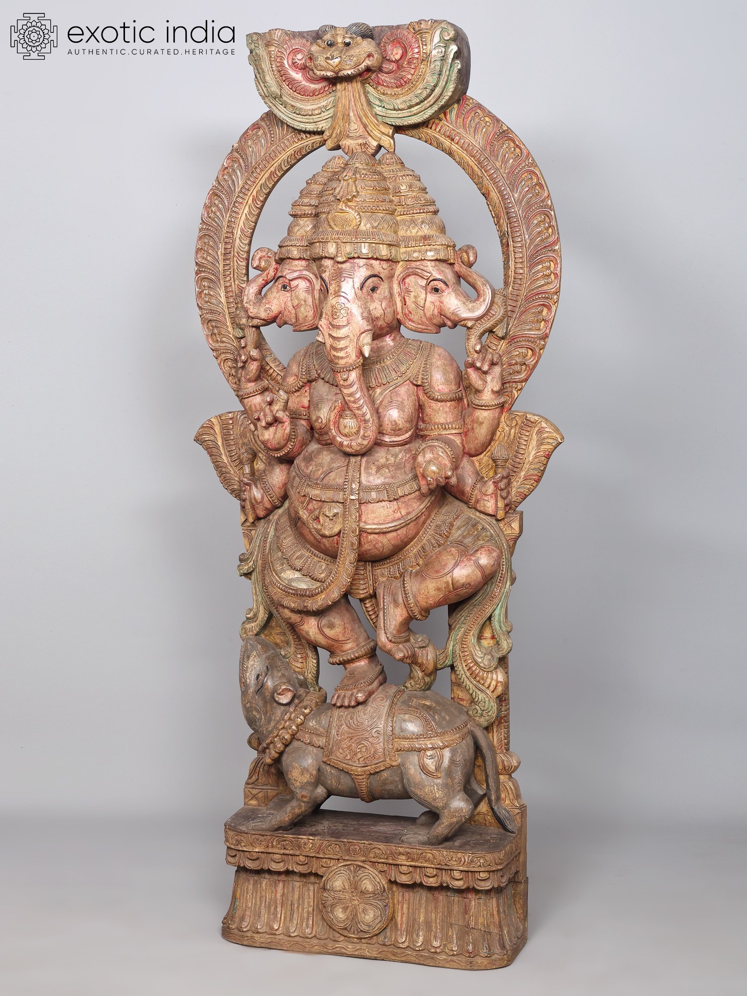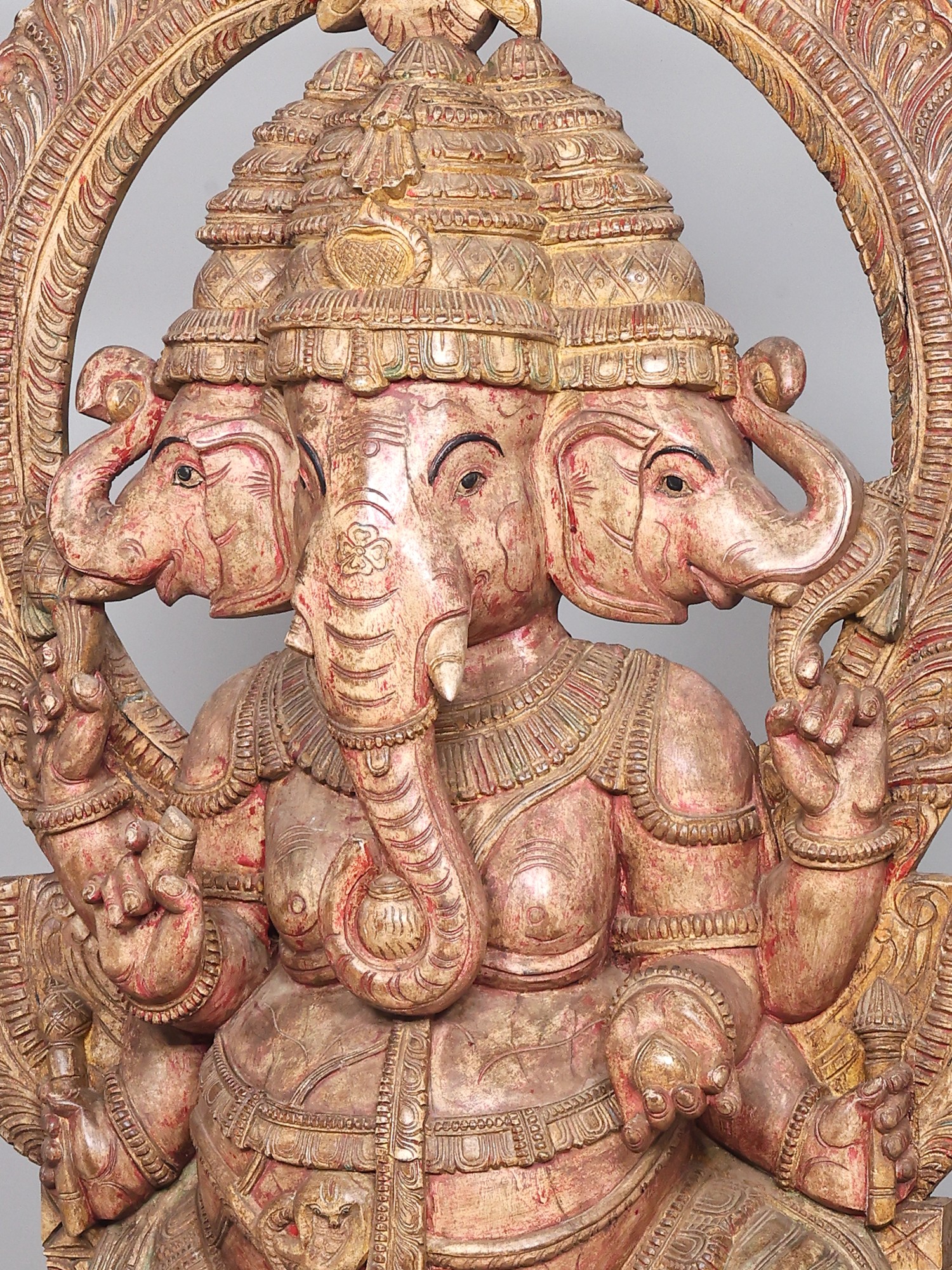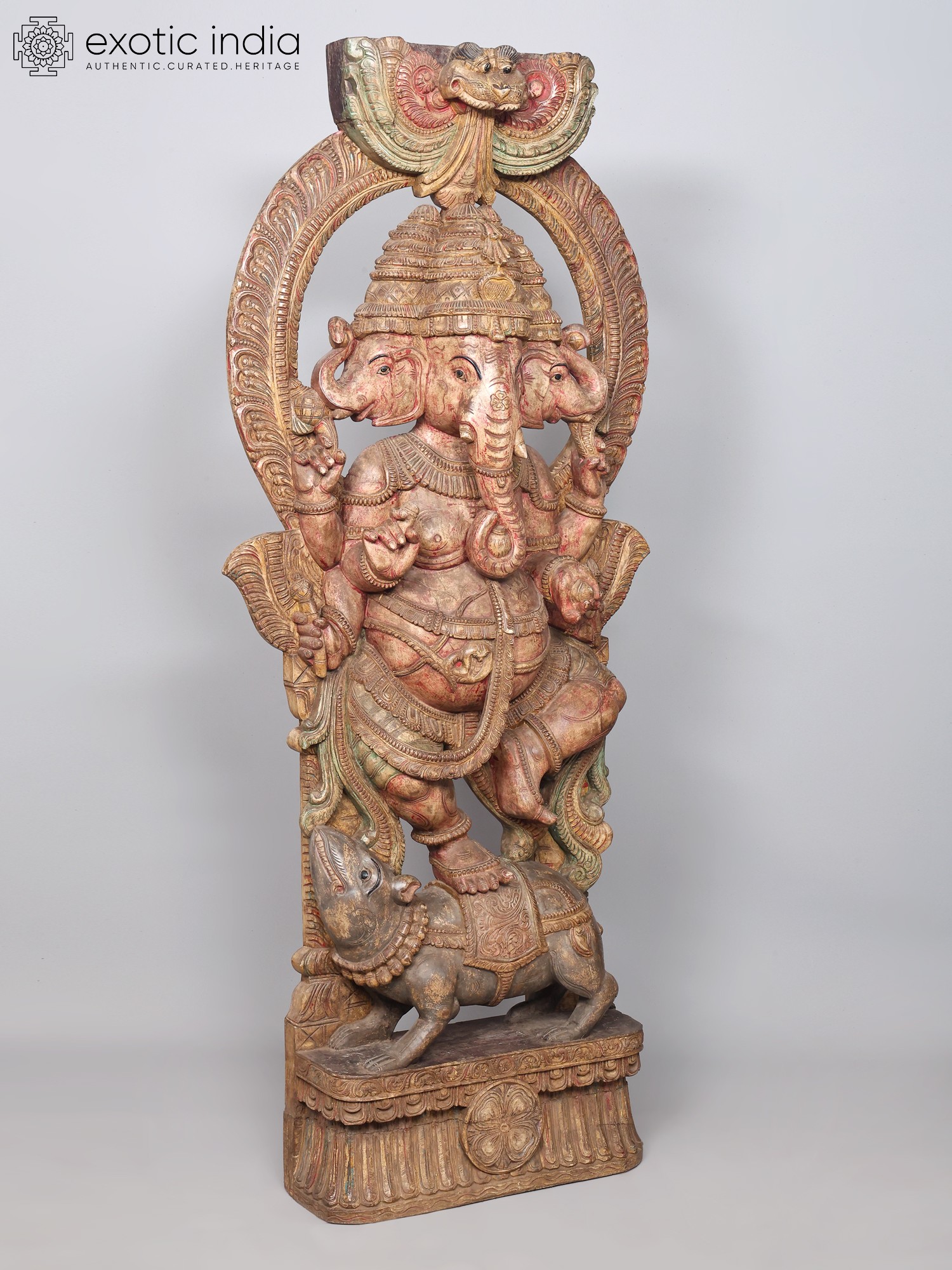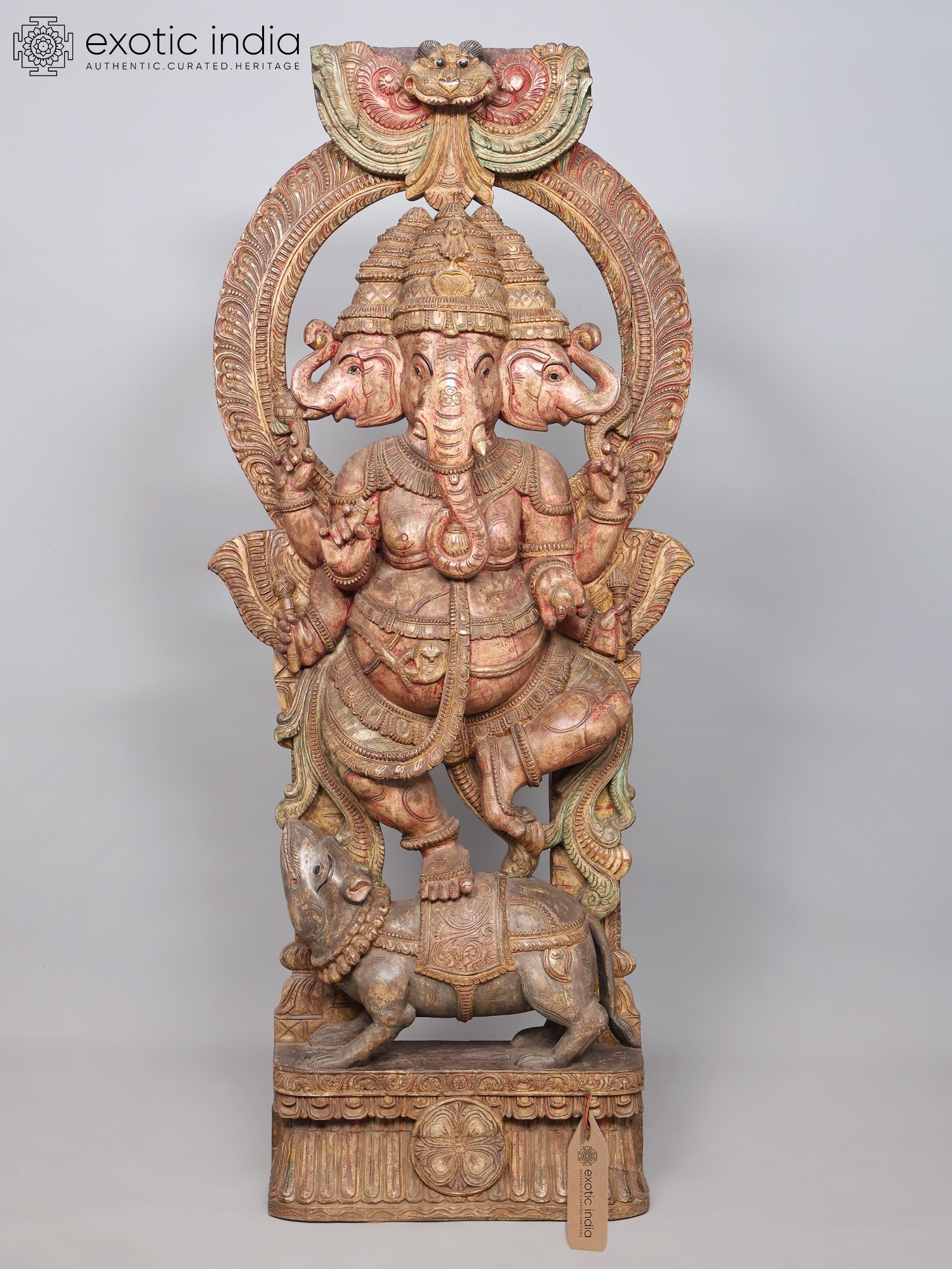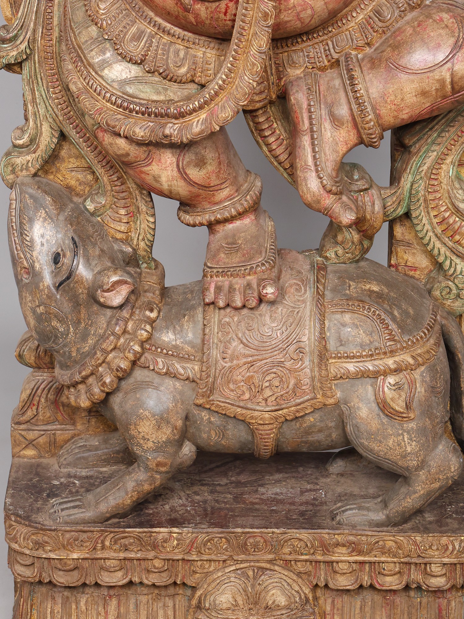 Lord Ganesha, whose large belly holds the universal wisdom has been tied around by the Naga (symbolizing Kundalini Shakti) - is depicted in the jovial act of dance in this wooden sculpture. Standing in the pose of Urdhajanu on his devoted mount - Mushaka, he assumes his Chaturbhuja (four-armed) avatar holding an Ankusha, Pasa, his Broken Tudk, and a laddoo. Encircled by a Prabhamandala with a Kirtimukha at the top - The initiator of rituals - Ganesha’s embellished in layers of precious chains and belts as Trimukha, where his three heads represent the three (3) gunas - Rajas. Sattva, and Tamas.