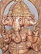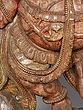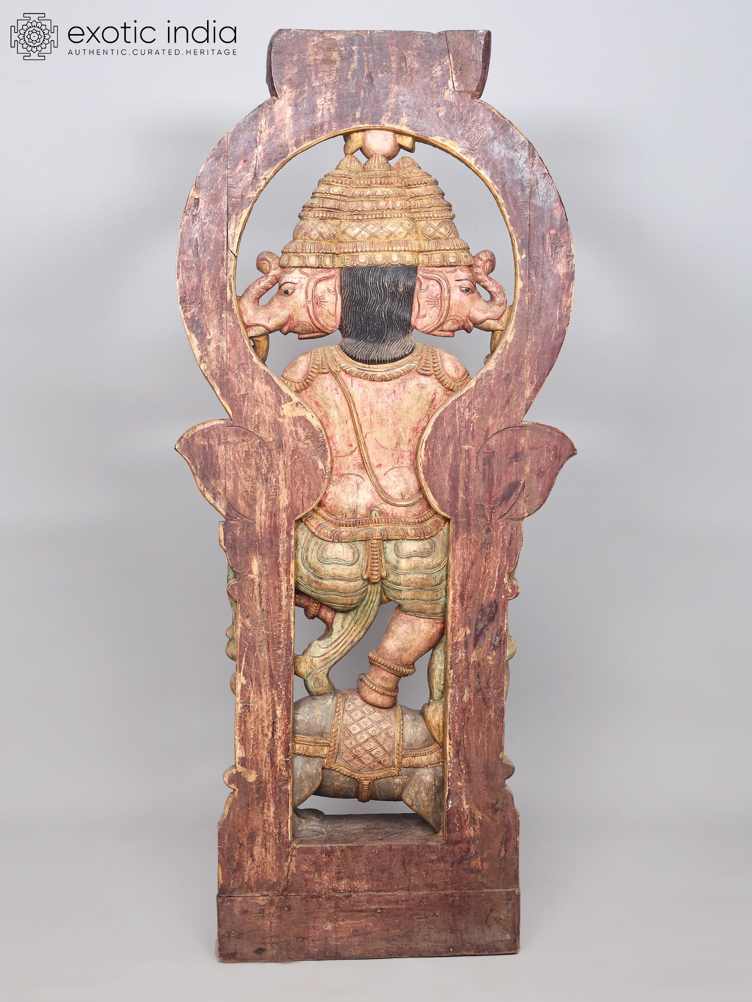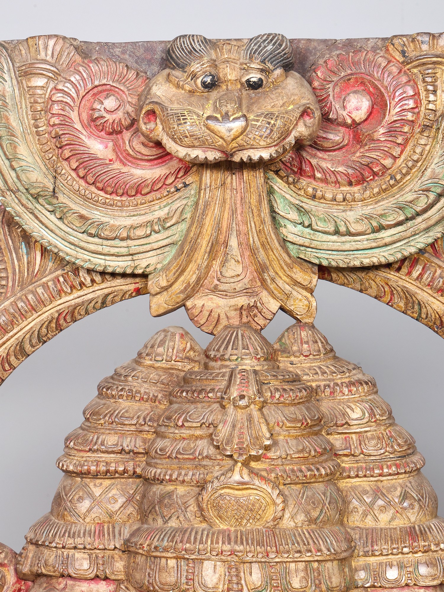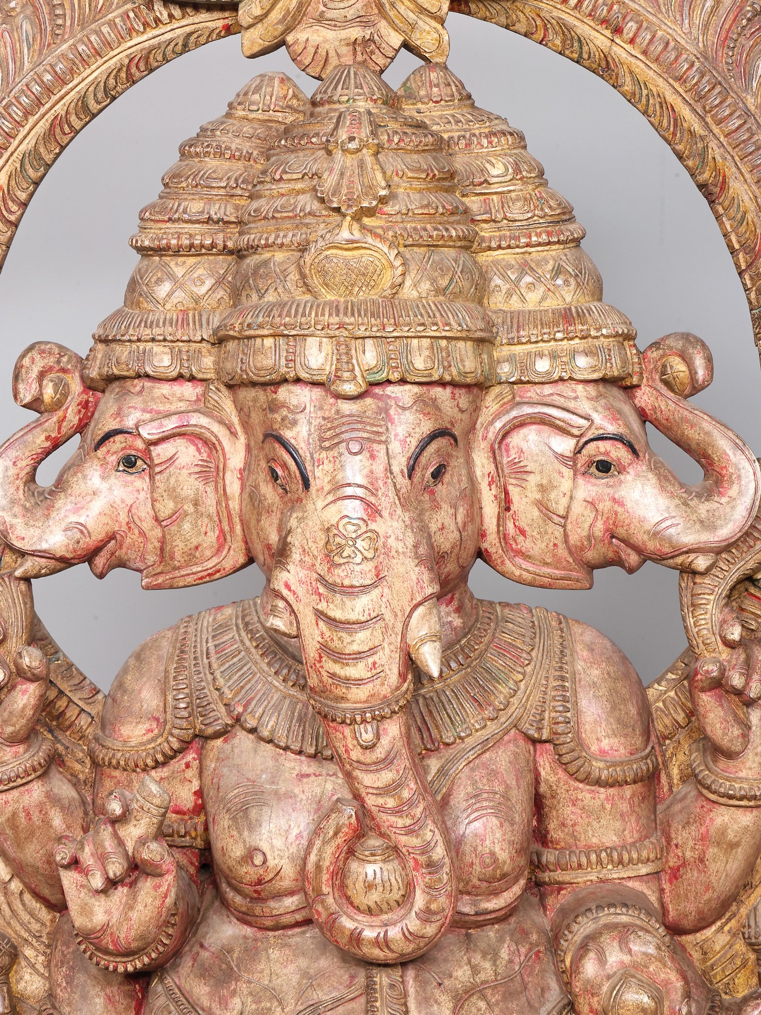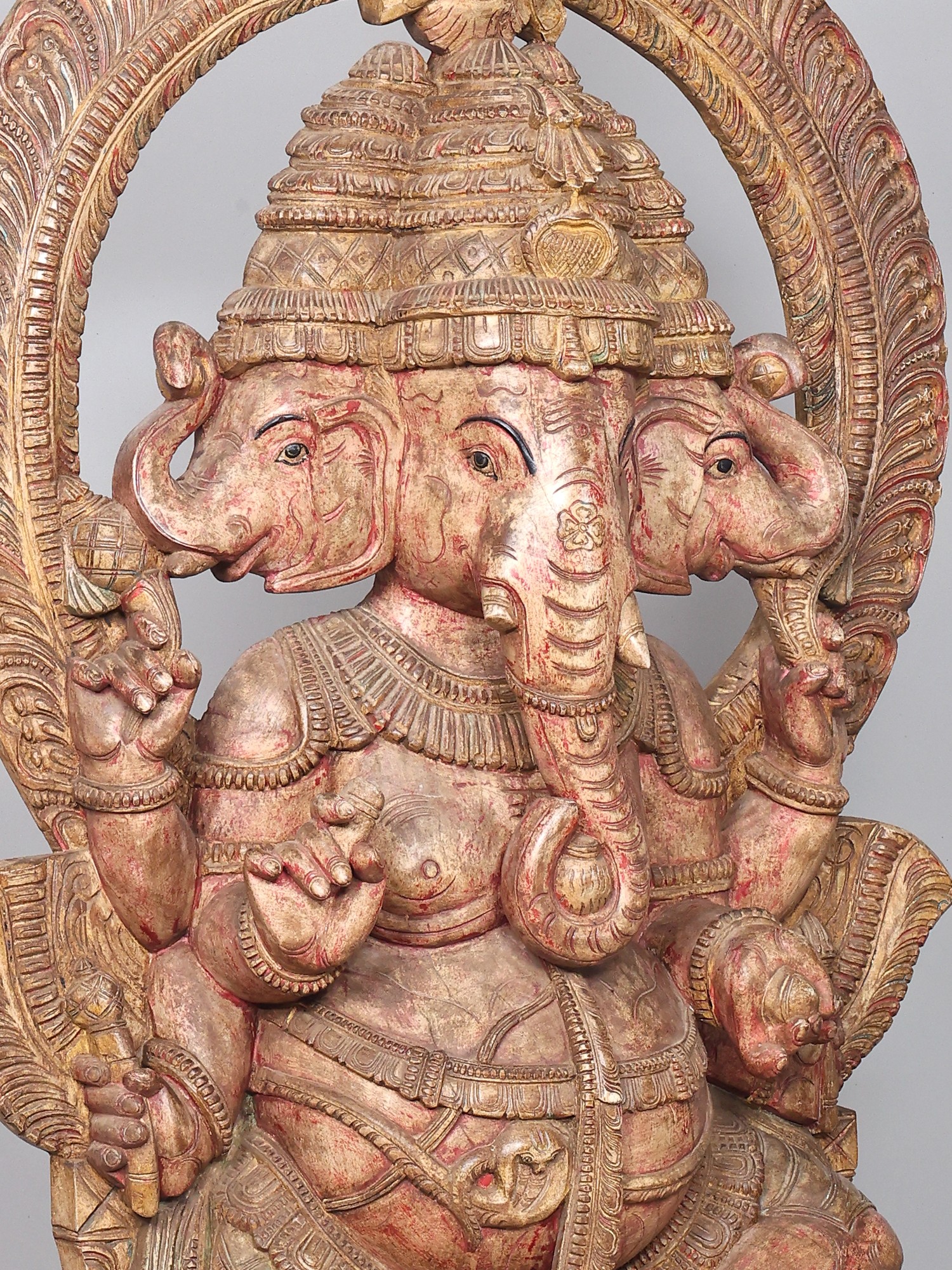 Lord Ganesha, whose large belly holds the universal wisdom has been tied around by the Naga (symbolizing Kundalini Shakti) - is depicted in the jovial act of dance in this wooden sculpture. Standing in the pose of Urdhajanu on his devoted mount - Mushaka, he assumes his Chaturbhuja (four-armed) avatar holding an Ankusha, Pasa, his Broken Tudk, and a laddoo. Encircled by a Prabhamandala with a Kirtimukha at the top - The initiator of rituals - Ganesha’s embellished in layers of precious chains and belts as Trimukha, where his three heads represent the three (3) gunas - Rajas. Sattva, and Tamas.