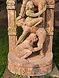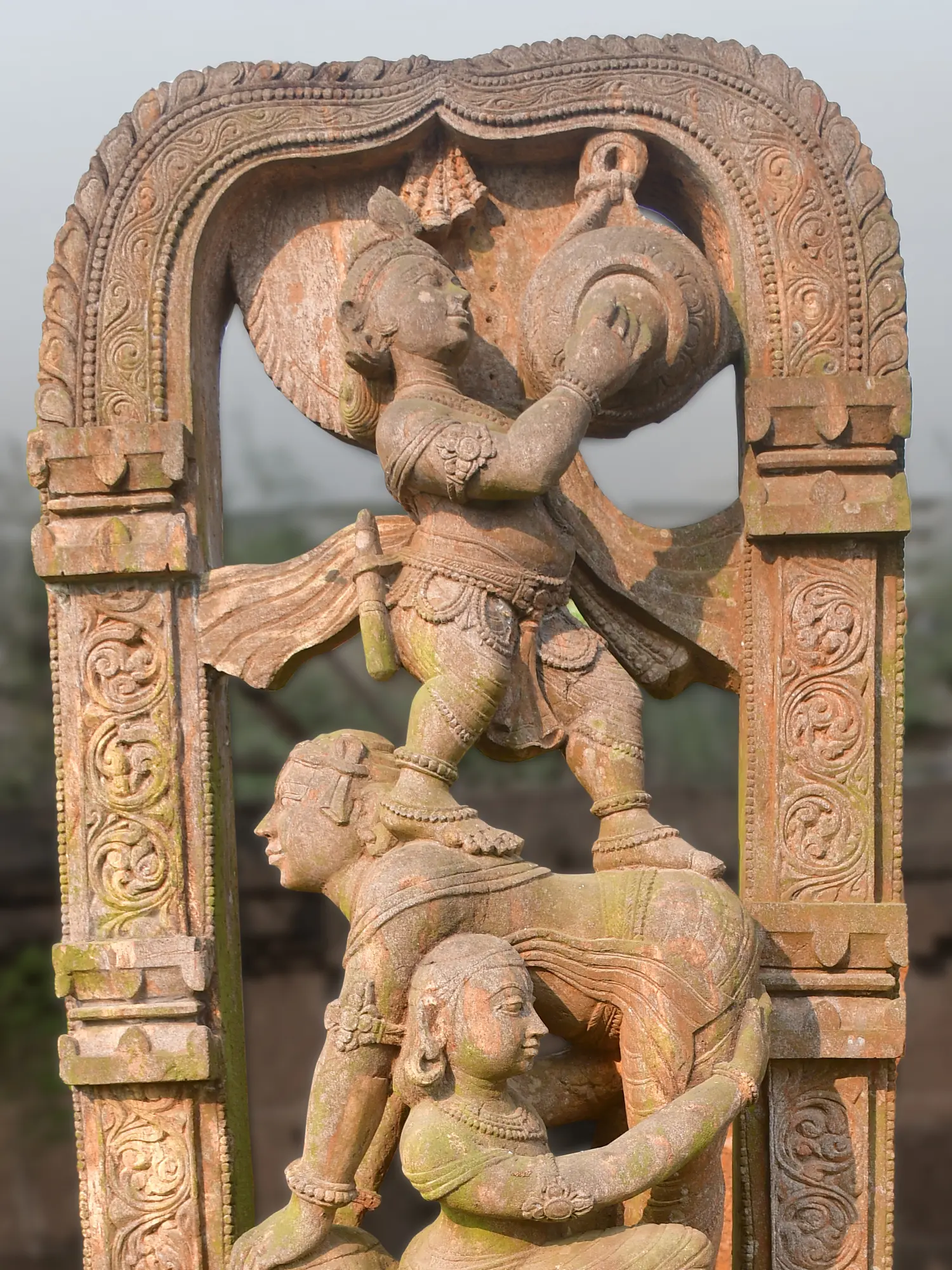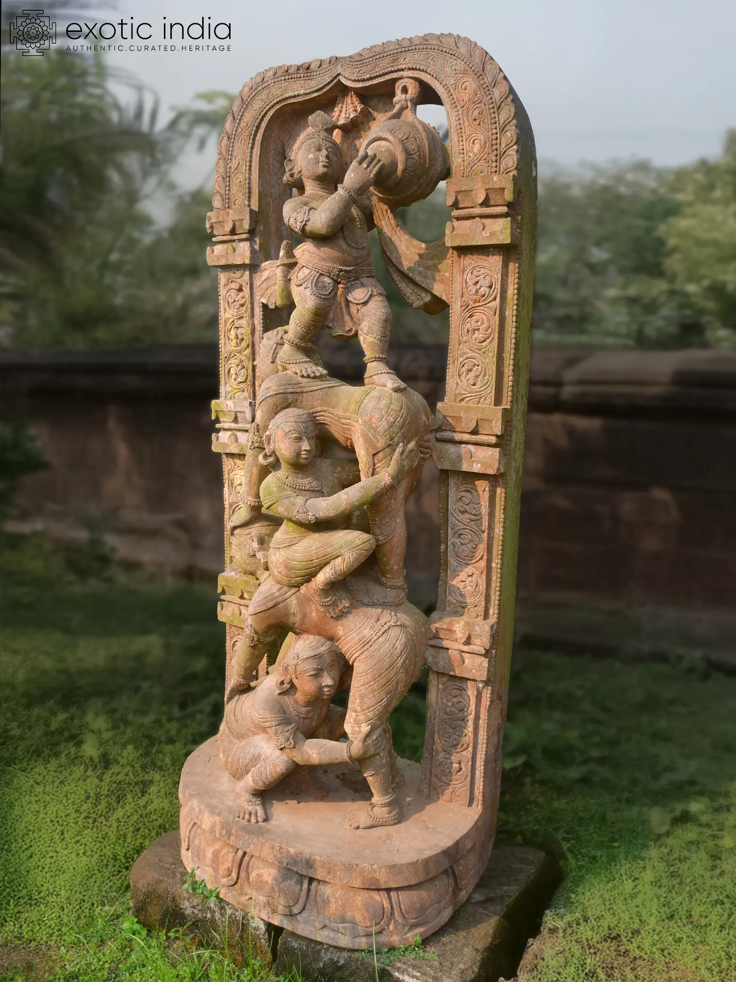 The composition is a marvel of dynamic storytelling, with figures ingeniously stacked and entwined, reaching for their coveted prize. Delicate carvings adorn the arched framework and supporting pillars, echoing traditional Indian motifs. The sandstone's natural hues, deepened by time and the elements, lend an earthy warmth and an aura of antiquity. This piece stands an impressive 72 inches tall, a substantial yet elegantly proportioned centerpiece that promises to captivate.