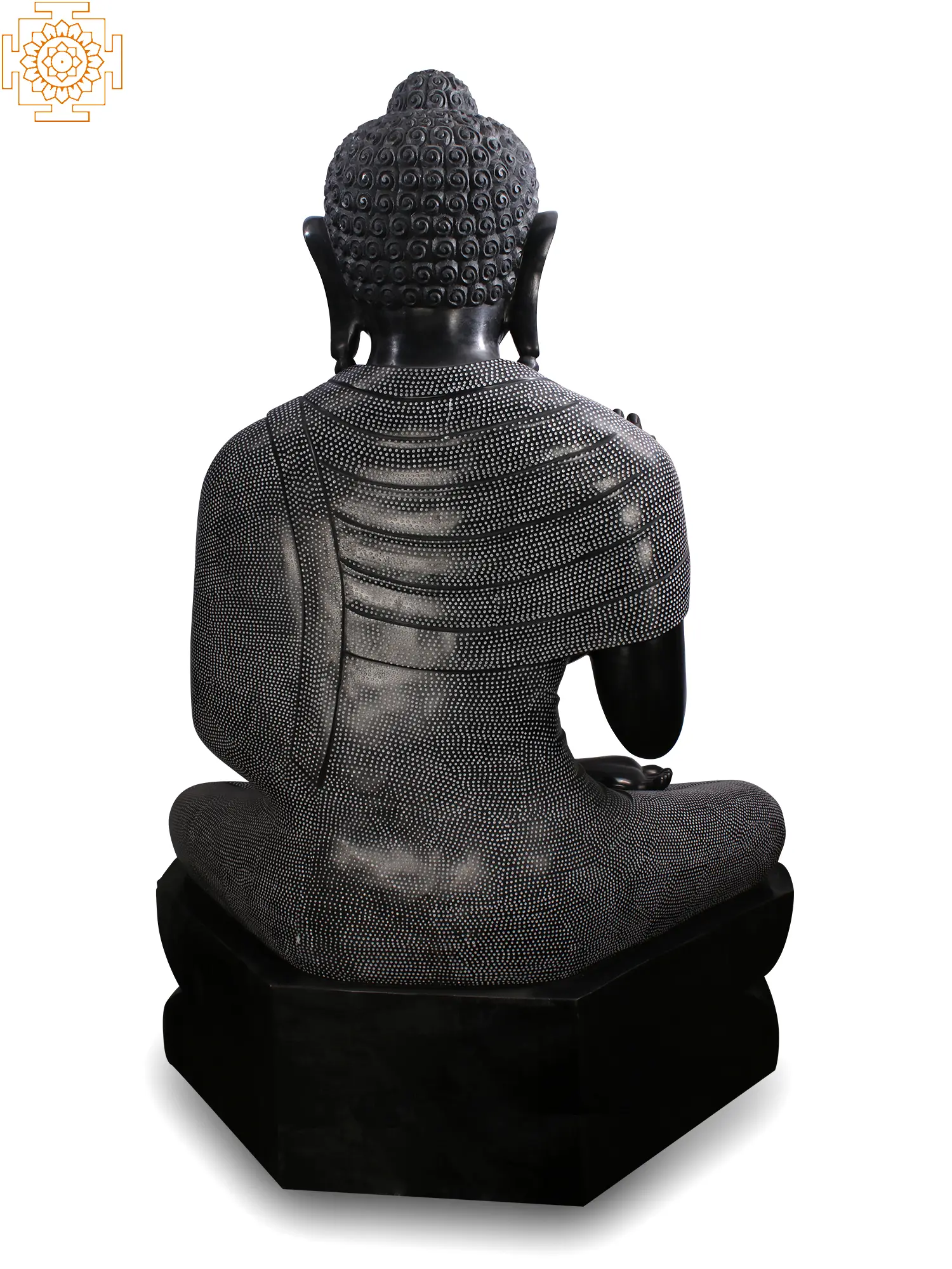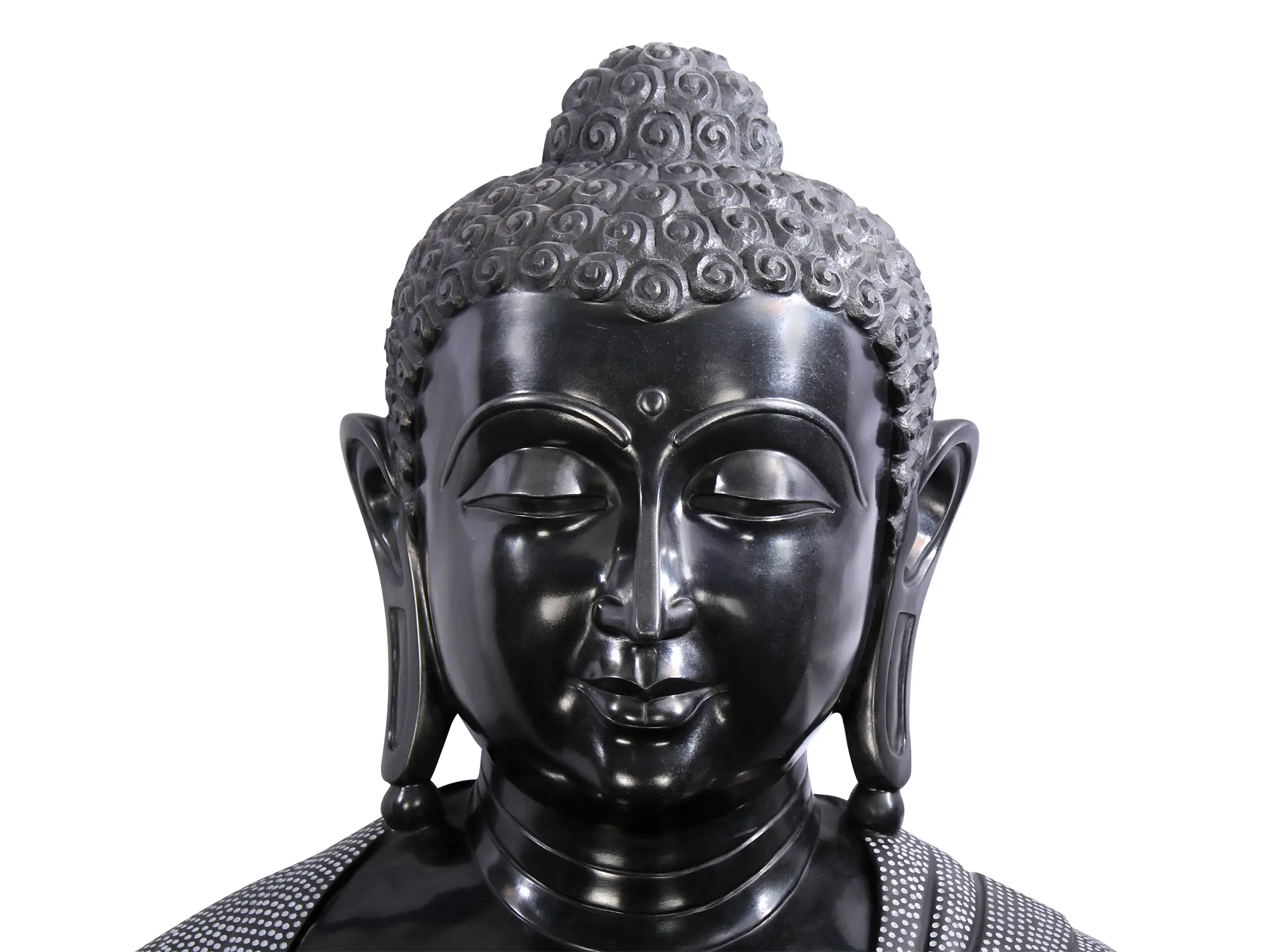 A one-of-a-kind bitone Buddha composition. The predominant colour is black, which has the unmistakable sheen of marble. The medium captures the otherworldly glamour of the erstwhile Shakyamuni. The complementary colour, white, is to be found in the dotted raiment clothing the seated figure, which makes for a surreal visual experience.