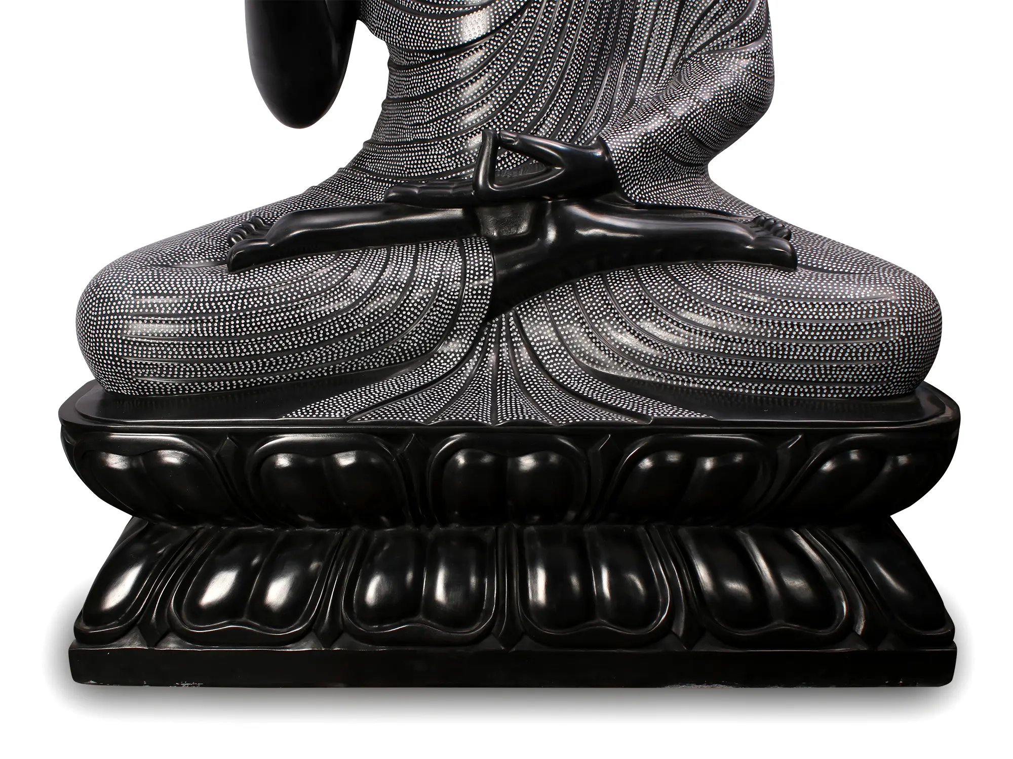 The Buddha’s robe is the most striking aspect of this sculpture. It is draped across the left shoulder, brought down over the right. The miniscule white dots on its surface are painted in long, continuous waves. These add a realistic quality to the fabric and make for an illusory optical experience.