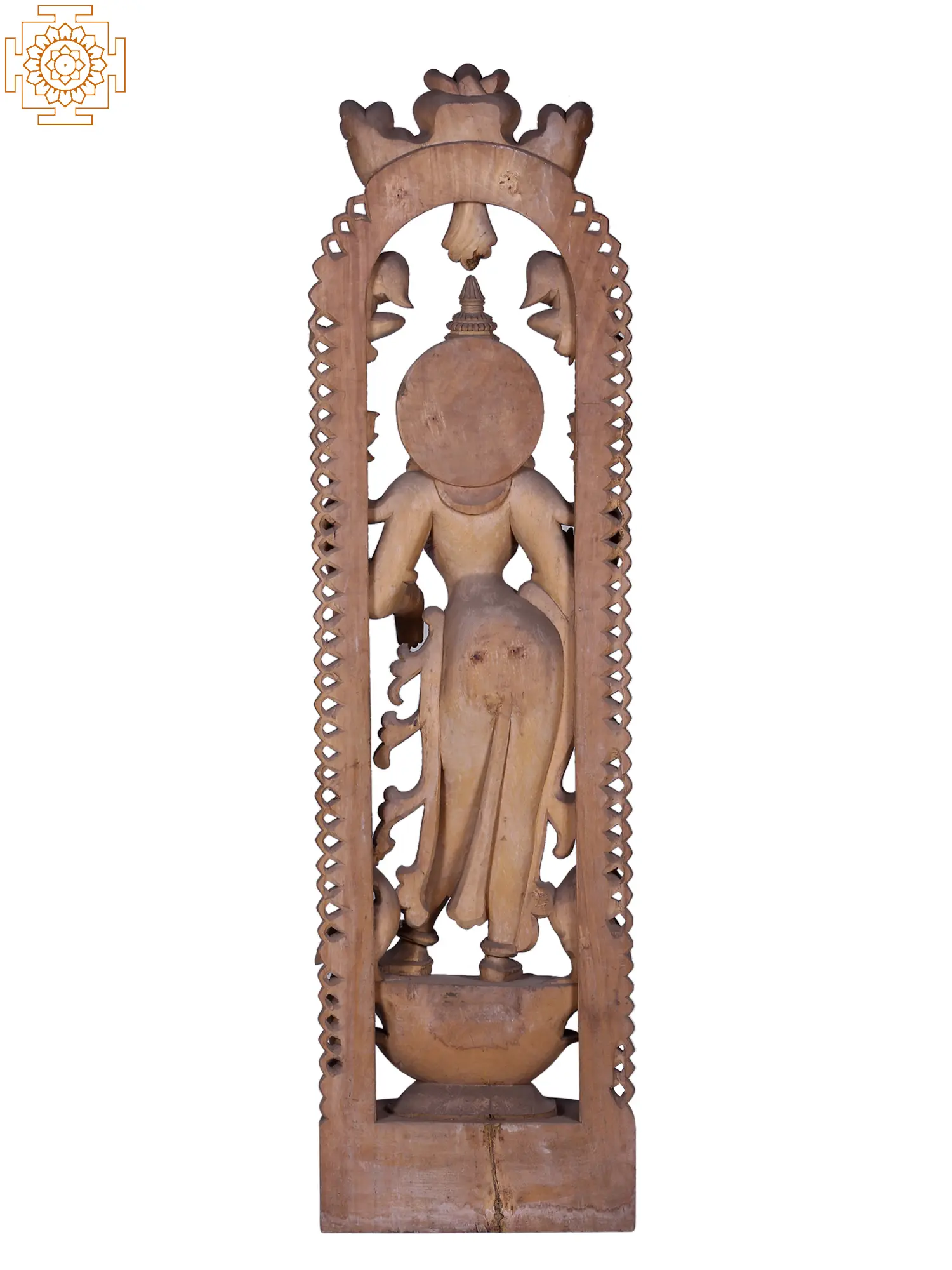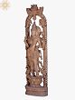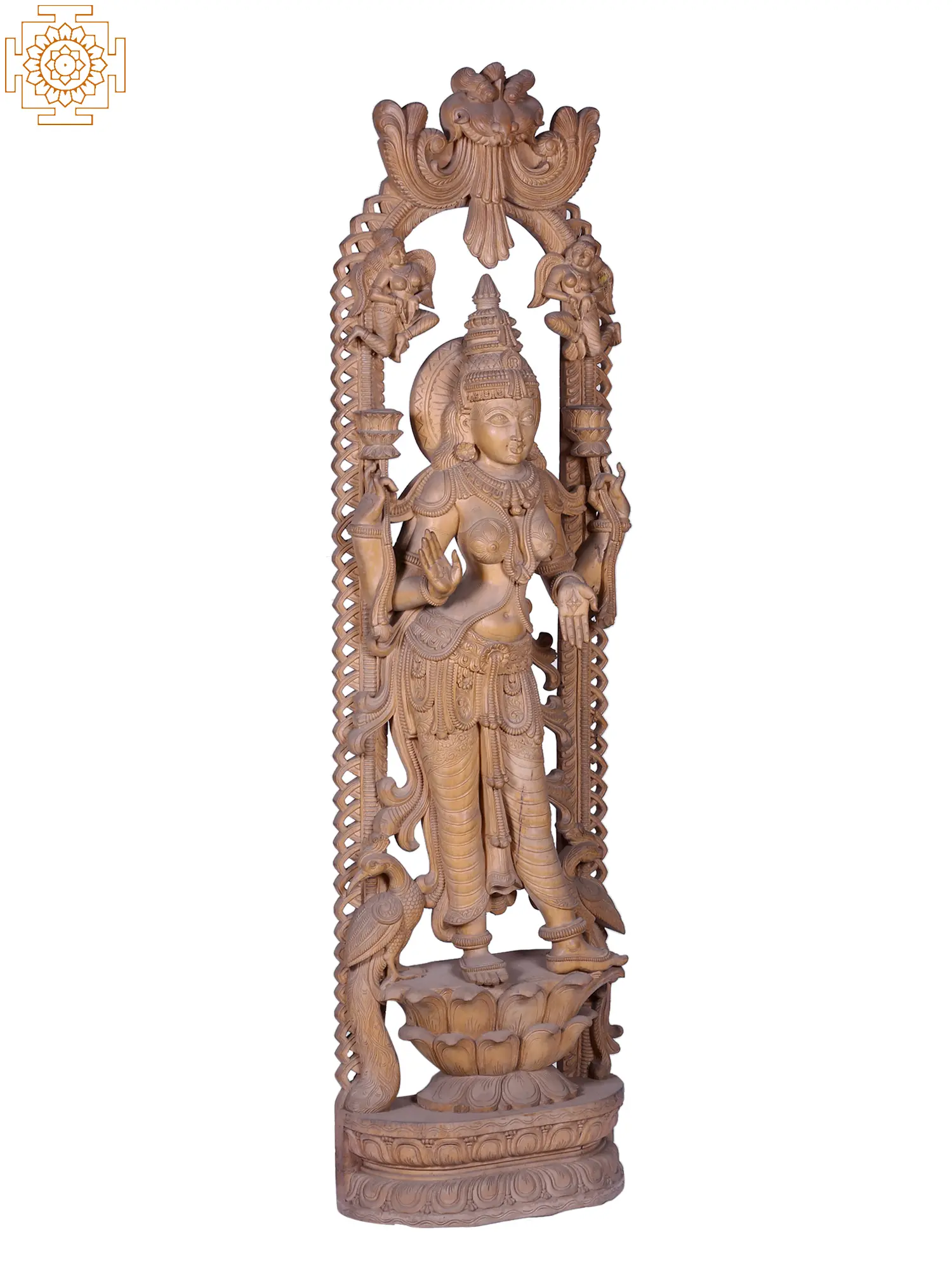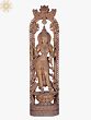 This magnificent, larger-than-life wooden carving depicts Goddess Lakshmi, the divine embodiment of wealth, prosperity, fortune, and beauty in Hindu tradition. Standing tall and graceful, she is a vision of serene divinity, meticulously crafted from fine wood, showcasing the artistry of skilled hands. Her form exudes an aura of abundance and well-being, making her a powerful symbol to welcome into any space.