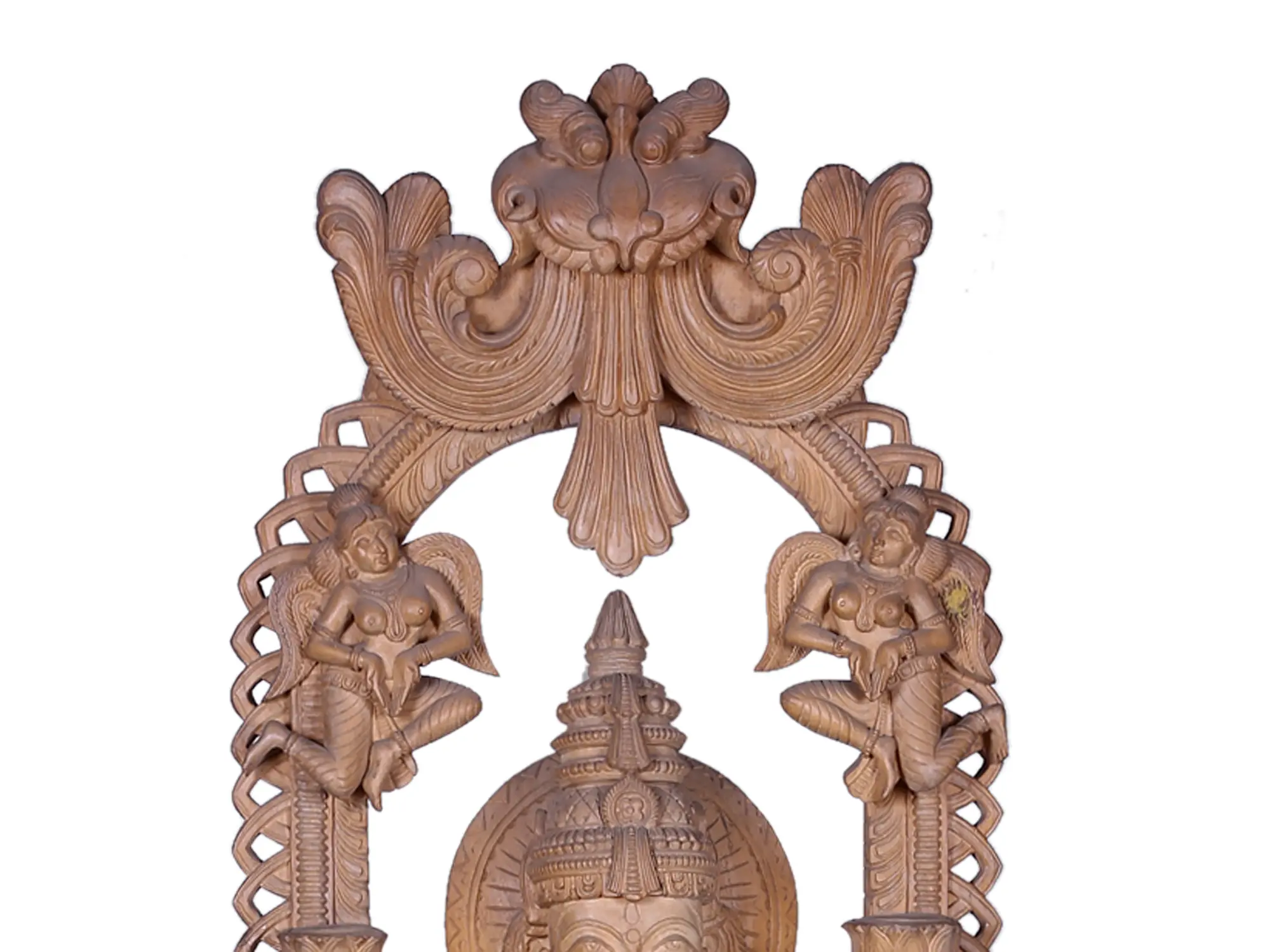 The sheer scale and meticulous detailing of this carving are breathtaking. Every element, from the delicate folds of her attire to the serene expression on her face, has been rendered with exceptional skill. The intricate patterns adorning her garments speak of ancient craftsmanship and a deep understanding of iconography. The flanking decorative borders, reminiscent of temple architecture, frame the goddess beautifully, adding to the grandeur of the piece. The inclusion of celestial beings and ornate motifs within the archway further elevate this sculpture into a work of art that transcends mere representation, capturing the very essence of divine splendor.