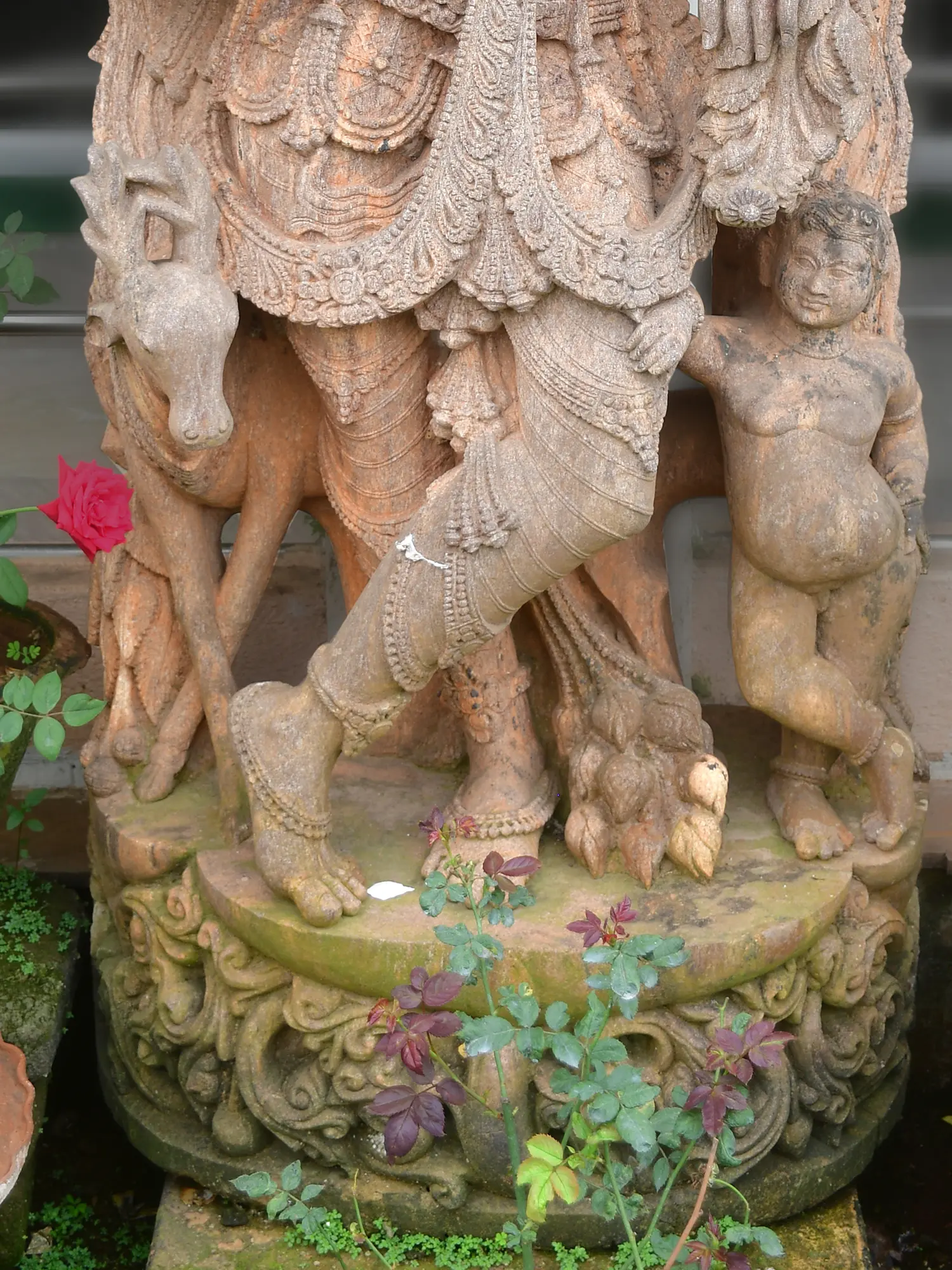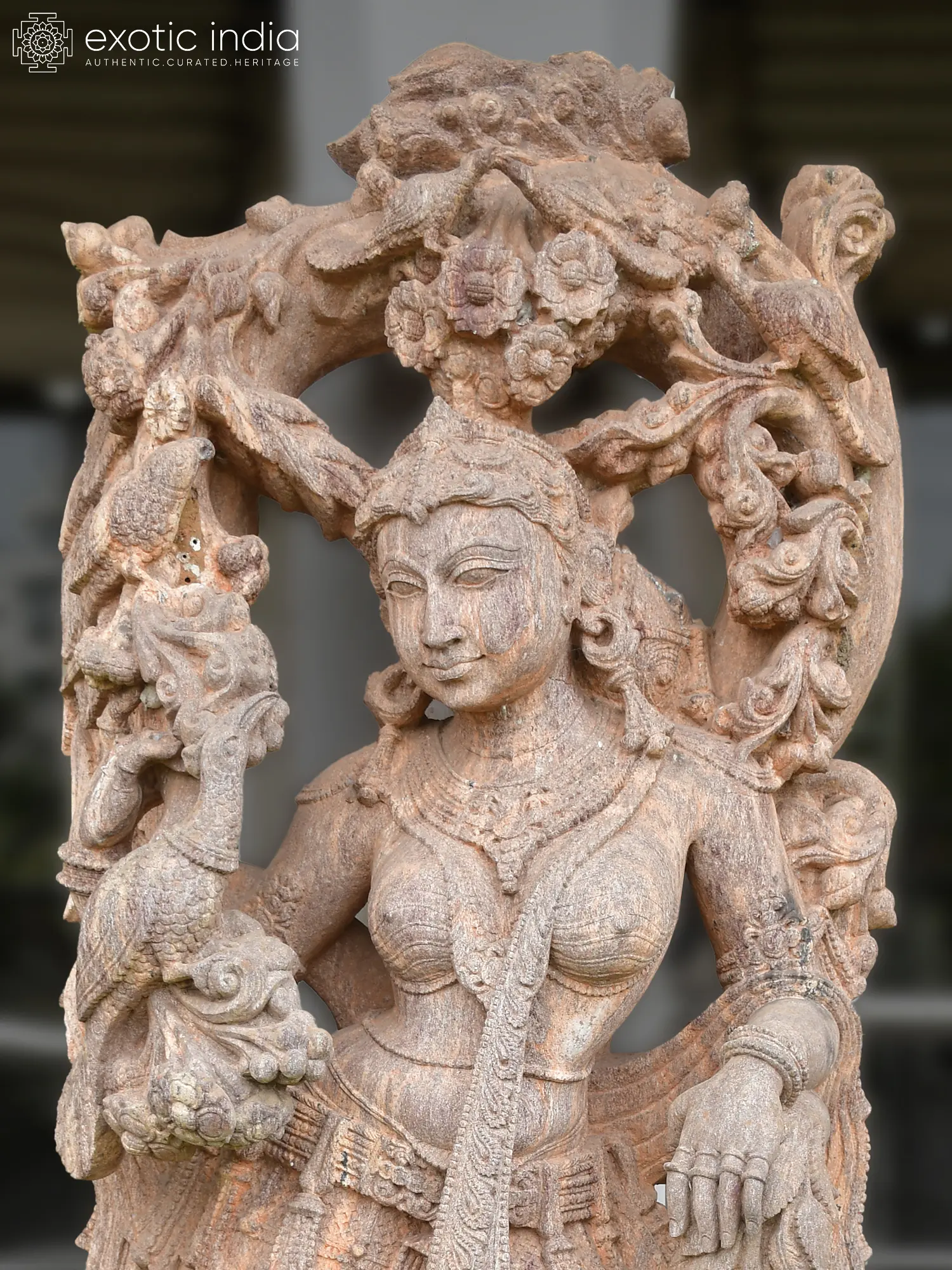 Standing at an impressive height, the figure’s graceful posture and flowing garments create a dynamic sense of movement. You’ll be drawn to the intricate ornamentation that adorns the divine being, a symphony of sculpted patterns and symbolic motifs. The natural texture of the sandstone adds a layer of tactile richness, inviting you to connect with its ancient origins.