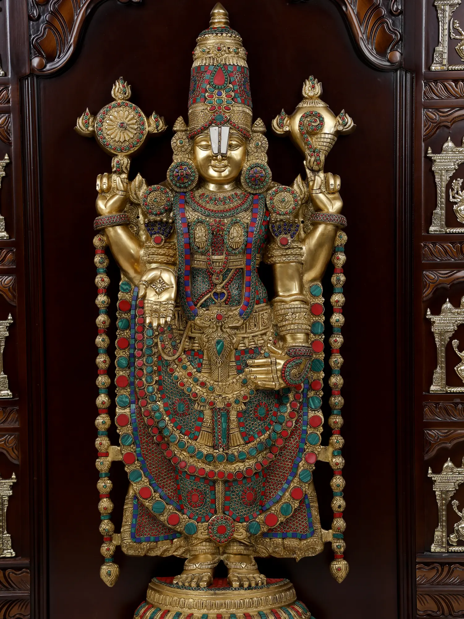 This sacred ensemble combines the revered presence of Tirupati Balaji with the auspicious energy of the Asthalakhmi, encapsulated in a beautifully crafted wooden temple. At the heart of this temple is the majestic Tirupati Balaji statue, made from premium brass.