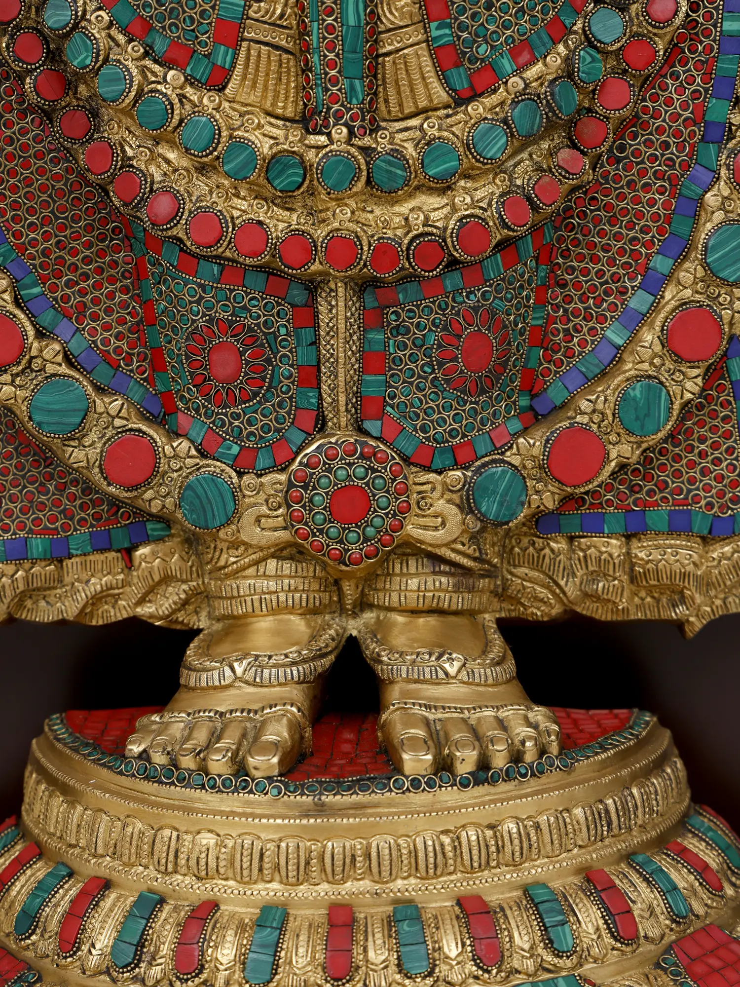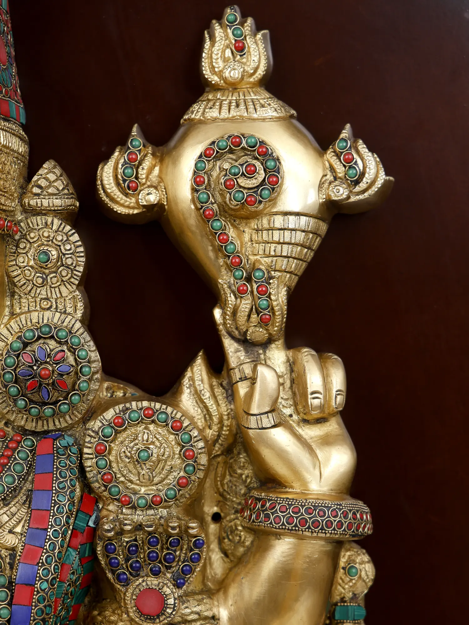 The intricate details of the statue, from the ornate crown and jewelry to the serene expression on the deity’s face, are meticulously crafted, capturing the divine essence and grandeur of the Lord. The brass material adds a touch of timeless elegance, with a rich patina that enhances the statue’s divine presence.