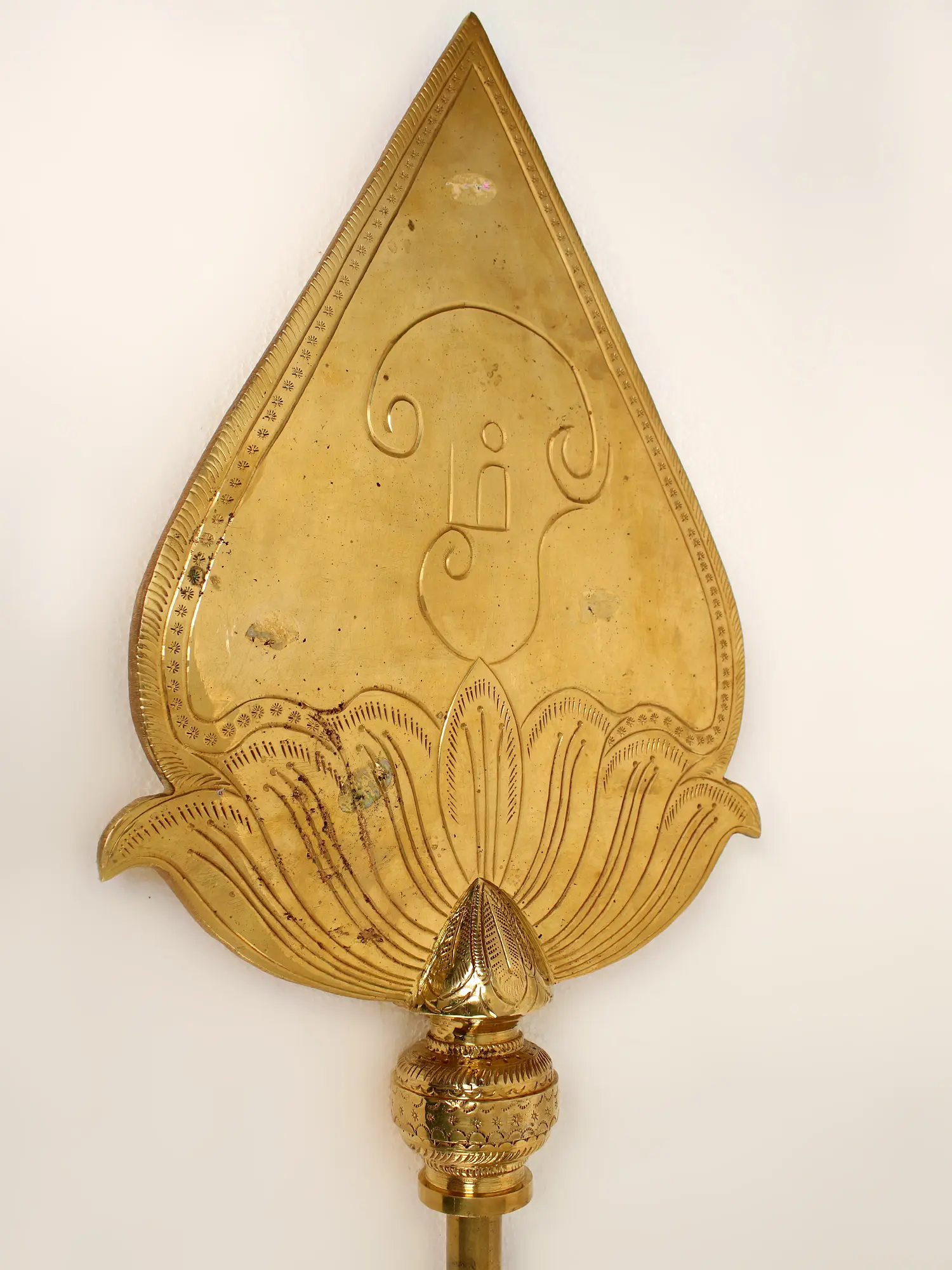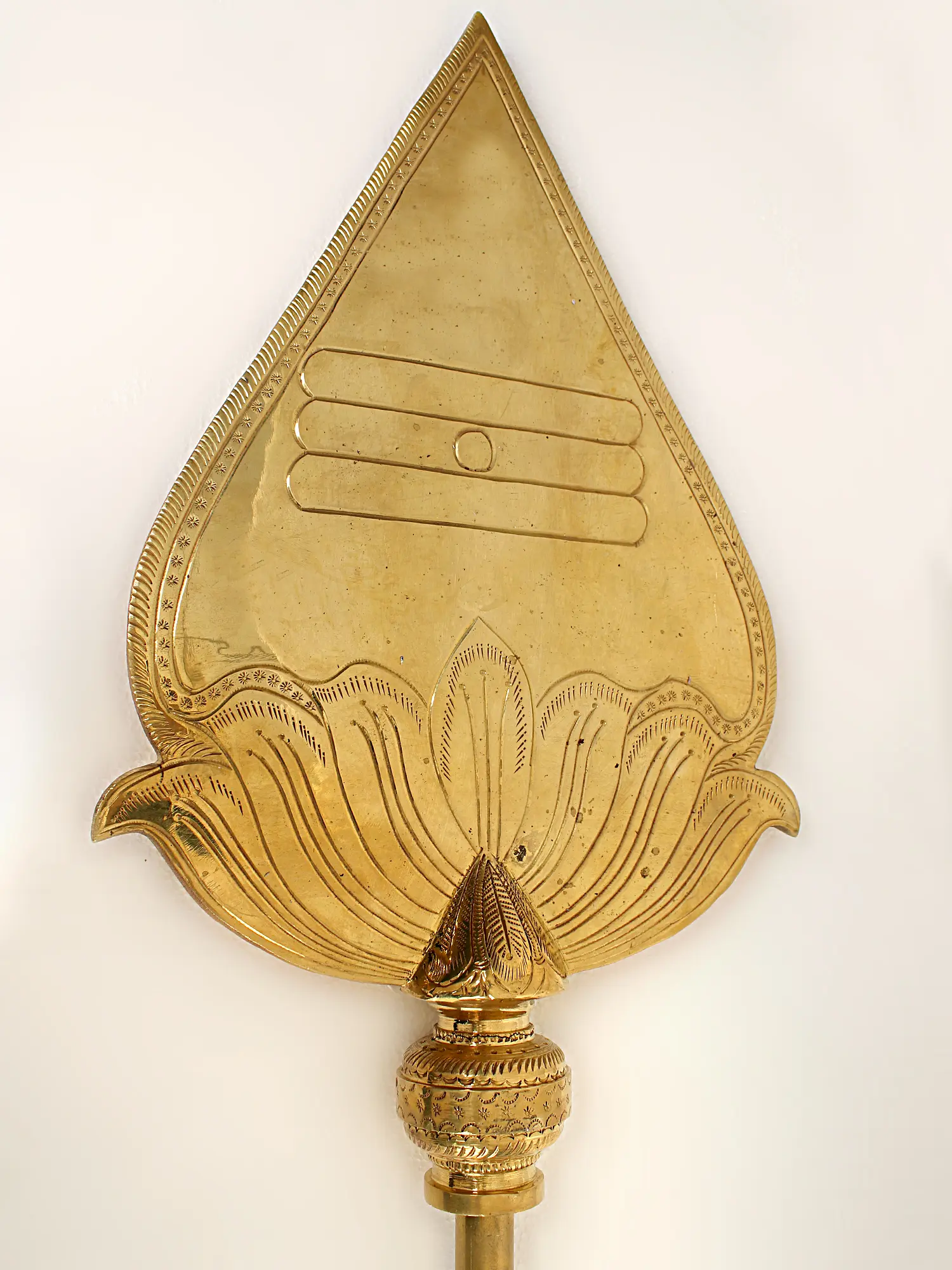 The son of Rudra is worshipped as Lord Kartikeya or Murugan. He is described as having the color of Kumkuma or vermillion on his body and is the leader of the army of Devas. He carries the Vel or spear given to him by his mother Goddess Parvati as a symbol of Apara Shakti or endless power. This Brass Vel with the sacred image of Tri-Pundra on one side, and Tamil Om on the other side, both symbols associated with Lord Shiva, is a symbol of the combined blessings of Hara-Parvati to their child. The Vel also has a sacred Purna Kalash at the junction of the Vel and stand and a Lotus bloom just above it signifying the power of wisdom. This Vel is worshipped as the holy weapon as well as the proxy of Lord Kartikeya.