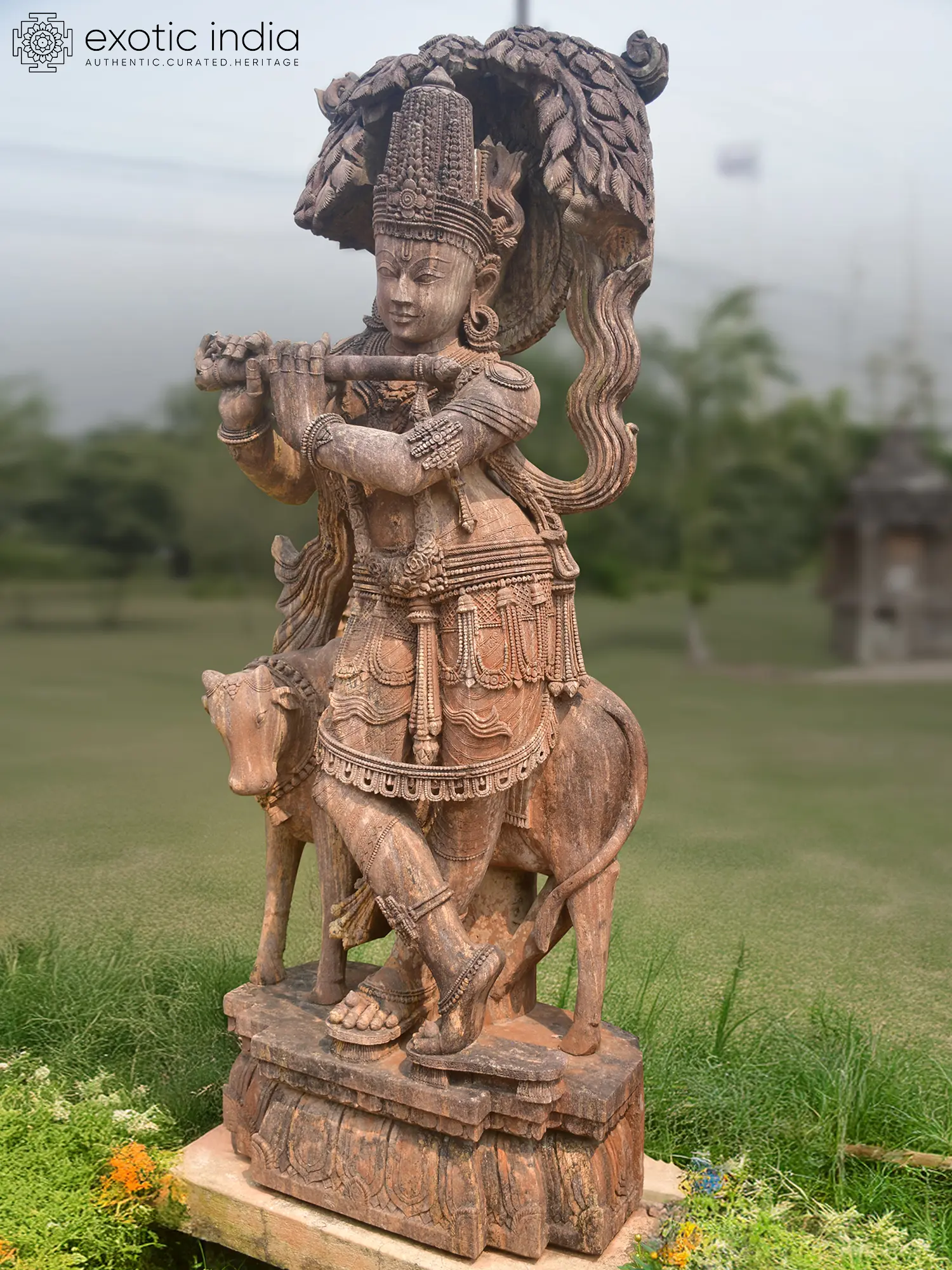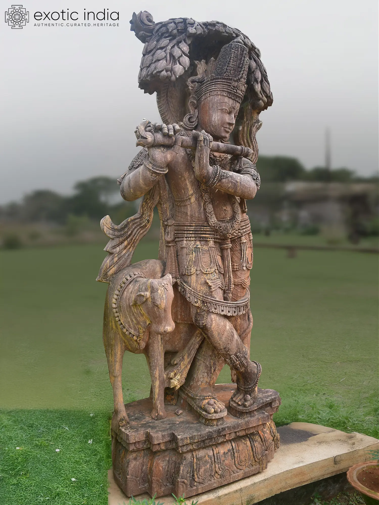54" Lord Krishna Standing under the Tree with a Cow | Sandstone Statue | Exquisite Handmade Indian Artwork